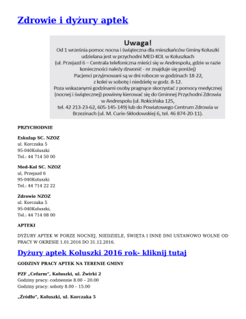 Zdrowie i dyżury aptek PRZYCHODNIE Eskulap SC. NZOZ ul. Korczaka 5 95-040Koluszki Tel.: 44 714 50 00 Med-Kol SC. NZOZ ul, Przejazd 6 95-040Koluszki Tel.: 44 714 22 22 Zdrowie NZOZ ul. Korczaka 5 95-040Koluszki, Tel.: 44 714 08 00 APTEKI DYŻURY APTEK W PORZE NOCNEJ, NIEDZIELE, ŚWIĘTA I INNE DNI USTAWOWO WOLNE OD PRACY W OKRESIE 1.01.2016 DO 31.12.2016. Dyżury aptek Koluszki 2016 rok- kliknij tutaj GODZINY PRACY APTEK NA TERENIE GMINY PZF „Cefarm”, Koluszki, ul. Żwirki 2 Godziny pracy: codziennie 8.00 – 20.00 Godziny pracy: soboty 8.00 – 15.00 „Źródło”, Koluszki, ul. Korczaka 5 Godziny pracy: codziennie 8.30 – 19.00 Godziny pracy: soboty 9.00 – 12.30 J. L. Marcinkowscy, Koluszki, ul. Głowackiego 20 Godziny pracy: codziennie 8.00 – 21.00 Godziny pracy: soboty 8.00 – 21.00 Godziny pracy: niedziele i święta 10.00 – 18.00 J. L. Marcinkowscy, Koluszki, ul. Brzezińska 54 Godziny pracy: codziennie 8.00 – 21.00 Godziny pracy: soboty 8.00 – 21.00 „Św. Huberta”, Koluszki, ul. Sikorskiego 6A Godziny pracy: codziennie 8.00 – 20.00 Godziny pracy: soboty 8.00 – 16.00 Godziny pracy: niedziele i święta 10.00 – 18.00 „Rodzinna”, Koluszki, ul. 11 Listopada 33 Godziny pracy: codziennie 8.00 – 20.00 Godziny pracy: soboty 8.00 16.00 PH – U „FARMA – CO”, Koluszki, ul. Przejazd 6 Godziny pracy: codziennie 8.00 – 20.00 Godziny pracy: soboty 8.00 – 15.00 Godziny pracy: niedziele i święta 9.00 – 14.00 „Belladonna”, Gałków Duży, ul. Dzieci Polskich 10 Godziny pracy: codziennie 9.00 – 17.00 Godziny pracy: soboty 9.00 – 14.00 „BIO”, Koluszki, ul. 3 Maja 19G Godziny pracy: codziennie 8.00 – 20.00 Godziny pracy: soboty 8.00 – 15.00 „Rumianek”, Koluszki, ul. 3 Maja 8 Godziny pracy: codziennie 8.00 – 20.00 Godziny pracy: soboty 8.00 – 16.00