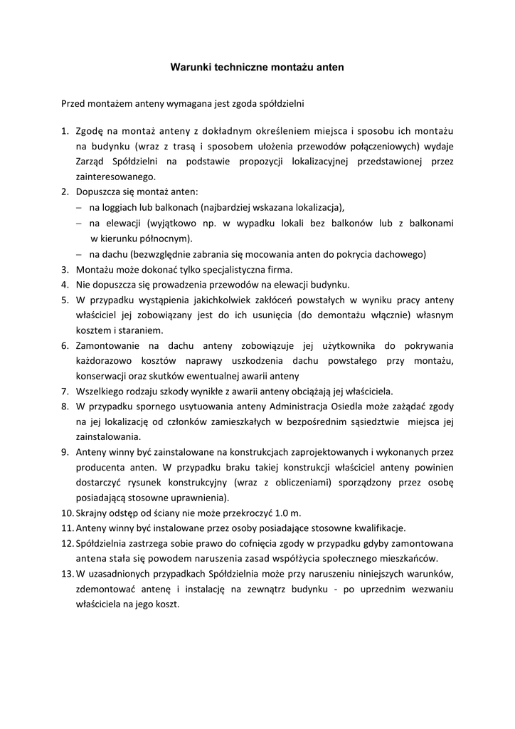 Warunki techniczne montażu anten Przed montażem anteny wymagana jest zgoda spółdzielni 1. Zgodę na montaż anteny z dokładnym określeniem miejsca i sposobu ich montażu na budynku (wraz z trasą i sposobem ułożenia przewodów połączeniowych) wydaje Zarząd Spółdzielni na podstawie propozycji lokalizacyjnej przedstawionej przez zainteresowanego. 2. Dopuszcza się montaż anten: − na loggiach lub balkonach (najbardziej wskazana lokalizacja), − na elewacji (wyjątkowo np. w wypadku lokali bez balkonów lub z balkonami w kierunku północnym). − na dachu (bezwzględnie zabrania się mocowania anten do pokrycia dachowego) 3. Montażu może dokonać tylko specjalistyczna firma. 4. Nie dopuszcza się prowadzenia przewodów na elewacji budynku. 5. W przypadku wystąpienia jakichkolwiek zakłóceń powstałych w wyniku pracy anteny właściciel jej zobowiązany jest do ich usunięcia (do demontażu włącznie) własnym kosztem i staraniem. 6. Zamontowanie na dachu anteny zobowiązuje jej użytkownika do pokrywania każdorazowo kosztów naprawy uszkodzenia dachu powstałego przy montażu, konserwacji oraz skutków ewentualnej awarii anteny 7. Wszelkiego rodzaju szkody wynikłe z awarii anteny obciążają jej właściciela. 8. W przypadku spornego usytuowania anteny Administracja Osiedla może zażądać zgody na jej lokalizację od członków zamieszkałych w bezpośrednim sąsiedztwie miejsca jej zainstalowania. 9. Anteny winny być zainstalowane na konstrukcjach zaprojektowanych i wykonanych przez producenta anten. W przypadku braku takiej konstrukcji właściciel anteny powinien dostarczyć rysunek konstrukcyjny (wraz z obliczeniami) sporządzony przez osobę posiadającą stosowne uprawnienia). 10. Skrajny odstęp od ściany nie może przekroczyć 1.0 m. 11. Anteny winny być instalowane przez osoby posiadające stosowne kwalifikacje. 12. Spółdzielnia zastrzega sobie prawo do cofnięcia zgody w przypadku gdyby zamontowana antena stała się powodem naruszenia zasad współżycia społecznego mieszkańców. 13. W uzasadnionych przypadkach Spółdzielnia może przy naruszeniu niniejszych warunków, zdemontować antenę i instalację na zewnątrz budynku - po uprzednim wezwaniu właściciela na jego koszt.