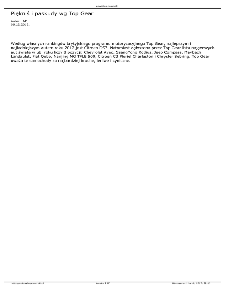 autosalon pomorski Piękniś i paskudy wg Top Gear Autor: AP 06.12.2012. Według własnych rankingów brytyjskiego programu motoryzacyjnego Top Gear, najlepszym i najładniejszym autem roku 2012 jest Citroen DS3. Natomiast ogłoszona przez Top Gear lista najgorszych aut świata w ub. roku liczy 8 pozycji: Chevrolet Aveo, SsangYong Rodius, Jeep Compass, Maybach Landaulet, Fiat Qubo, Nanjing MG TFLE 500, Citroen C3 Pluriel Charleston i Chrysler Sebring. Top Gear uważa te samochody za najbardziej kruche, leniwe i cyniczne. http://autosalonpomorski.pl Kreator PDF Utworzono 2 March, 2017, 22:19