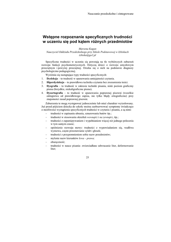 Nauczanie przedszkolne i zintegrowane Wstępne rozpoznanie specyficznych trudności w uczeniu się pod kątem różnych przedmiotów Marzena Kagan Nauczyciel Oddziału Przedszkolnego przy Szkole Podstawowej w Izbiskach [email protected] Specyficzne trudności w uczeniu się powstają na tle wybiórczych zaburzeń rozwoju funkcji psychomotorycznych. Dotyczą dzieci o rozwoju umysłowym przeciętnym i powyżej przeciętnej. Orzeka się o nich na podstawie diagnozy psychologiczno pedagogicznej. Wyróżnia się następujące typy trudności specyficznych: 1. Dysleksja – to trudność w opanowaniu umiejętności czytania. 2. Hiperdysleksja – to prawidłowa technika czytania bez zrozumienia treści. 3. Dysgrafia – to trudność w zakresie techniki pisania, niski poziom graficzny pisma (brzydkie, niekaligraficzne pismo). 4. Dysortografia – to trudność w opanowaniu poprawnej pisowni (wszelkie odstępstwa od prawidłowego zapisu, nie tylko błędy ortograficzne) przy znajomości zasad poprawnej pisowni. Zaburzenia te mogą występować jednocześnie lub mieć charakter wyizolowany. Już przed pójściem dziecka do szkoły można zaobserwować symptomy świadczące o możliwości wystąpienia specyficznych trudności w czytaniu i pisaniu, a są nimi: – trudności w zapinaniu ubrania, sznurowaniu butów itp.; – trudności w stosowaniu określeń wewnątrz i na zewnątrz, itp.; – trudności z zapamiętywaniem i wypełnianiem więcej niż jednego polecenia w tym samym czasie; – opóźnienie rozwoju mowy: trudności z wypowiadaniem się, wadliwa wymowa, częste przestawianie sylab i głosek; – trudności z przypomnieniem sobie nazw przedmiotów; – mylenie nazw kierunków lewa – prawa; – oburęczność; – trudności w nauce pisania: zwierciadlane odwracanie liter, deformowanie liter; 25 Marzena Kagan – Wstępne rozpoznanie specyficznych trudności w uczeniu się... – – – – trudności z zapamiętywaniem materiału występującego w formie serii, sekwencji (dni tygodnia, miesiące, alfabet); trudności w pamiętaniu aktualnej daty, daty imienin, urodzin, i określania czasu; słabe postępy w uczeniu się czytania zarówno metodą fonetyczną jak i globalną (rozpoznawanie napisów); szybka męczliwość, uwarunkowana koniecznością włożenia większego wysiłku i koncentracji uwagi w zadania typu szkolnego. O dysleksji u dzieci w młodszym wieku szkolnym świadczą następujące objawy: – czytanie „niepewne”, „wymęczone”, szczególnie, gdy dziecko czyta głośno; – częste błędy w czytaniu: pomijanie wyrazów lub ich dodawanie, zniekształcanie wyrazów i odczytywanie innych, podobnych wyrazów w skutek domyślania się na podstawie pierwszej sylaby lub kontekstu; – pomijanie linii lub odczytywanie jej ponownie; – częste gubienie miejsca w którym dziecko czyta; – niepewność w czytaniu krótkich wyrazów wyglądających podobnie np. „od”, „do”; – trudności w dzieleniu dłuższych wyrazów na sylaby i syntezowaniu sylab w wyrazy we właściwym porządku (sylaby są często gubione); – pomijanie interpunkcji; – przestawianie liter w wyrazie, co zmienia jego sens; – trudności w wyszukiwaniu najistotniejszej myśli w danym fragmencie tekstu; – niewłaściwe łączenie liter; – trudności w przyswajaniu tabliczki mnożenia. O dysgrafii świadczą następujące błędy w pisaniu: – słaby poziom pracy pisemnej w porównaniu z odpowiedziami ustnymi; – prace pisemne na niskim poziomie graficznym i estetycznym: liczne przekreślenia, kilkakrotne próby zapisywania wyrazu, prace „bałaganiarskie”; – utrzymywanie się trudności w różnicowaniu liter: b–p, p–g, b–d, m–n, m–w, n–u. – niewłaściwy dobór liter do głosek podobnych fonetycznie w wyniku ich niewłaściwego rozróżniania np. t–d, p–b, m–n; – mylenie nazwy litery i głoski np. l–el, m–em, k–ka;, – niewłaściwe stosowanie dużych i małych liter, dziecko częściej używa dużych liter zamiast małych ponieważ czuje się pewniejsze w ich różnicowaniu; 26 CKPiDN w Mielcu – Zeszyty nauczycielskie – Nr 1/2004 – – – – – – – trudność w różnicowaniu wyrazów podobnie brzmiących np. półka – bułka; dodawanie pomijanie lub niewłaściwe umiejscawianie liter lub wyrazów; zapisywanie wyrazu na różne sposoby np. szyja, szia, szyia; mylenie liter l i t podczas czytania i pisania; złe rozmieszczenie pracy w przestrzeni, niemożność zachowania marginesu; tracenie wątku podczas zapisywania opowiadania; brak lub niewłaściwe stosowanie interpunkcji. Trudności w czytaniu i pisaniu przenoszą się na naukę innych przedmiotów i funkcjonowanie dziecka w szkole. Ponieważ czytanie i pisanie są narzędziami zdobywania wiedzy z wszystkich przedmiotów nauki szkolnej. Dyslektyczni uczniowie klas starszych mają trudności: – z przypominaniem słów i nazw; – wolno i niepoprawnie czytają i piszą z wieloma błędami; – mają trudności z organizacją swoich czynności, co odbija się szczególnie na pracach pisemnych; – mają trudności z rozumieniem bardziej skomplikowanych instrukcji, mogą je błędnie zrozumieć; – często mylą kierunki przestrzeni, miejsce i czas; – trudność sprawia im zapisywanie informacji z tablicy i podczas ich dyktowania; – nie potrafią ukończyć zadań w wyznaczonym czasie, szybko się męczą. O dysortografii obok błędów ortograficznych świadczą następujące błędy specyficzne: – uporczywe opuszczanie, dodawanie i przestawianie liter; – mylenie liter podobnych pod względem kształtu i miejsca artykulacji; – mylenie liter o podobnym kształcie i innym ułożeniu w przestrzeni; – pismo lustrzane; – omijanie znaków diakrytycznych (kreski, kropki, łuki, haczyki); – występowanie wyrazów bezsensownych w skutek pojawienia się kilku rodzajów błędów w jednym wyrazie. O występowaniu trudności specyficznych świadczą nie tylko wymienione obj