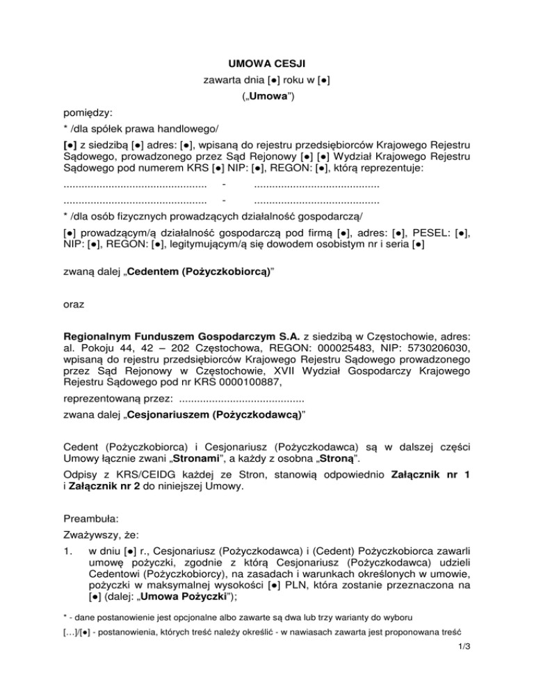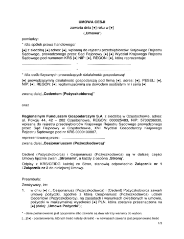 UMOWA CESJI zawarta dnia [●] roku w [●] („Umowa”) pomiędzy: * /dla spółek prawa handlowego/ [●] z siedzibą [●] adres: [●], wpisaną do rejestru przedsiębiorców Krajowego Rejestru Sądowego, prowadzonego przez Sąd Rejonowy [●] [●] Wydział Krajowego Rejestru Sądowego pod numerem KRS [●] NIP: [●], REGON: [●], którą reprezentuje: ................................................ - .......................................... ................................................ - .......................................... * /dla osób fizycznych prowadzących działalność gospodarczą/ [●] prowadzącym/ą działalność gospodarczą pod firmą [●], adres: [●], PESEL: [●], NIP: [●], REGON: [●], legitymującym/ą się dowodem osobistym nr i seria [●] zwaną dalej „Cedentem (Pożyczkobiorcą)” oraz Regionalnym Funduszem Gospodarczym S.A. z siedzibą w Częstochowie, adres: al. Pokoju 44, 42 – 202 Częstochowa, REGON: 000025483, NIP: 5730206030, wpisaną do rejestru przedsiębiorców Krajowego Rejestru Sądowego prowadzonego przez Sąd Rejonowy w Częstochowie, XVII Wydział Gospodarczy Krajowego Rejestru Sądowego pod nr KRS 0000100887, reprezentowaną przez: .......................................... zwana dalej „Cesjonariuszem (Pożyczkodawcą)” Cedent (Pożyczkobiorca) i Cesjonariusz (Pożyczkodawca) są w dalszej części Umowy łącznie zwani „Stronami”, a każdy z osobna „Stroną”. Odpisy z KRS/CEIDG każdej ze Stron, stanowią odpowiednio Załącznik nr 1 i Załącznik nr 2 do niniejszej Umowy. Preambuła: Zważywszy, że: 1. w dniu [●] r., Cesjonariusz (Pożyczkodawca) i (Cedent) Pożyczkobiorca zawarli umowę pożyczki, zgodnie z którą Cesjonariusz (Pożyczkodawca) udzieli Cedentowi (Pożyczkobiorcy), na zasadach i warunkach określonych w umowie, pożyczki w maksymalnej wysokości [●] PLN, która zostanie przeznaczona na [●] (dalej: „Umowa Pożyczki”); * - dane postanowienie jest opcjonalne albo zawarte są dwa lub trzy warianty do wyboru […]/[●] - postanowienia, których treść należy określić - w nawiasach zawarta jest proponowana treść 1/3 2. jednym z warunków uruchomienia pożyczki na podstawie Umowy Pożyczki jest dokonanie przez Cedenta (Pożyczkobiorcę) na rzecz Cesjonariusza (Pożyczkodawcy) przelewu wszelkich istniejących i przyszłych praw i wierzytelności Cedenta (Pożyczkobiorcy) wynikających z niżej umowy zawartej przez Pożyczkobiorcę zdefiniowanej poniżej jako Umowa Cedowana. Strony postanowiły zawrzeć umowę o następującej treści: §1 Oświadczenia Stron 1. Cedent (Pożyczkobiorca) oświadcza, że w dniu [●] zawarł umowę [●] dotyczącą [●] (dalej zwana: „Umową Cedowaną”). 2. * [w przypadku gdy nie jest wymagana zgoda na cesję] Cedent (Pożyczkobiorca) oświadcza, że zgodnie z Umową Cedowaną nie jest wymaga zgoda [●] na cesję praw i obowiązków wynikających z Umowy Cedowanej. lub * [w przypadku gdy jest wymagana zgoda na cesję] Pismo zawierające zgodę [●] na przeniesienie wszelkich praw i obowiązków Cedenta (Pożyczkobiorcy) wynikających z Umowy Cedowanej na Cesjonariusza (Pożyczkodawcę) stanowi Załącznik nr 3 do niniejszej Umowy. §2 Przedmiot Umowy Strony postanowiły, iż ze skutkiem na dzień [●] r. Cedent (Pożyczkobiorca) przenosi na Cesjonariusza (Pożyczkodawcę) wszelkie swoje prawa i obowiązki wynikające z Umowy Cedowanej a Cesjonariusz (Pożyczkodawca) te prawa i obowiązki w całości przyjmuje. §3 Postanowienia końcowe 1. W sprawach nieuregulowanych niniejszą umową stosuje się przepisy Kodeksu Cywilnego. 2. Umowa wchodzi w życie z dniem jej podpisania. 3. Wszelkie koszty ustanowienia zastawu pokrywa Cedent (Pożyczkobiorca). 4. Wszelkie zmiany niniejszej umowy wymagają formy pisemnej pod rygorem nieważności. 5. Jeżeli w jakimkolwiek czasie dowolne postanowienie niniejszej Umowy okaże się lub stanie się nieważne, niezgodne z prawem lub niewykonalne, nie będzie * - dane postanowienie jest opcjonalne albo zawarte są dwa lub trzy warianty do wyboru […]/[●] - postanowienia, których treść należy określić - w nawiasach zawarta jest proponowana treść 2/3 to miało wpływu na ważność, zgodność z prawem lub wykonalność pozostałych postanowień. 6. Sądem właściwym dla rozpatrywania wszelkich sporów mogących wyniknąć z umowy jest sąd właściwy dla siedziby Cesjonariusza (Pożyczkodawcy). 7. Umowę sporządzono w dwóch jednobrzmiących egzemplarzach, po jednym dla każdej ze Stron. …………………………………… Cedent (Pożyczkobiorca) ……………………………………….. Cesjonariusz (Pożyczkodawca) Załączniki: - Odpis KRS Cesjonariusza, - Odpis KRS/wydruk CEIDG Cedenta. * - dane postanowienie jest opcjonalne albo zawarte są dwa lub trzy warianty do wyboru […]/[●] - postanowienia, których treść należy określić - w nawiasach zawarta jest proponowana treść 3/3