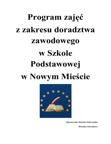 Program zajęć z zakresu doradztwa zawodowego w Szkole Podstawowej w Nowym Mieście Opracowała Mariola Sobczyńska Doradca Zawodowy Wstęp Wspieranie i przygotowywanie uczniów do podejmowania decyzji edukacyjno – zawodowych jest zadaniem statutowym szkoły. Wewnątrzszkolny System Doradztwa , rozwijany na terenie szkoły, nie jest systemem diagnozującym, lecz systemem doradczym, który stwarza możliwości i pomaga w rozwiązywaniu problemów powiązanych z wyborem kierunku kształcenia, drogi kształcenia i planowaniem kariery zawodowej. Planowanie kariery zawodowej i pierwsze decyzje edukacyjno – zawodowe to okres przypadający na lata szkoły gimnazjalnej, aczkolwiek już kończąc szkołę podstawową warto pomyśleć o swojej przyszłości.. W naturalny sposób szkoła jest więc środowiskiem ,które ma bezpośredni wpływ na te decyzje i powinna wspierać rodziców i świadczyć pomoc uczniom w wyborze kierunku kształcenia i zawodu. Jak wskazują naukowe studia i potoczne obserwacje, młodzież jest najczęściej niezdecydowana, niedoinformowana i nieprzygotowana do podjęcia tak ważnej decyzji, więc sytuacja wymaga szerszego włączenia nauczycieli i rodziców w podejmowanie przez uczniów decyzji edukacyjno – zawodowych. Pamiętać należy również o tym, że potrzeby uczniów w zakresie uzyskiwania porady zawodowej zmieniają się wraz z etapami przygotowania dzieci i młodzieży do wyboru zawodu. Na etapie kształcenia jakim jest ostatnia klasa szkoły podstawowej, młodzież znajduje się w trudnym okresie rozwojowym. Jest to faza burzliwego przechodzenia z dzieciństwa do dorosłości. To szkoła przygotowuje młodzież do aktywnego wchodzenia w życie gospodarcze, do świadomego stanowienia o sobie, wytyczania własnej drogi rozwoju poprzez aktywne wzmacnianie swoich mocnych stron, zainteresowań, uzdolnień. Dlatego niezbędne jest wyposażenie uczniów w umiejętność podejmowania odważnych, samodzielnych decyzji, umiejętność uczenia się przez całe życie, umiejętność radzenia sobie w sytuacjach kryzysowych. Ponadto absolwent szkoły podstawowej musi znać system kształcenia, oferty szkół gimnazjalnych, ukierunkowanie na wybór języków obcych, świat zawodów, a także strukturę rynku pracy. Funkcjonowanie w nowoczesnym społeczeństwie wymaga aktywnych zachowań i umiejętności podejmowania trafnych decyzji. Wszelkiego rodzaju wybory dotyczące zdobycia wykształcenia, czy kwalifikacji zawodowych wymagają coraz większej wiedzy o rynku pracy, rynku edukacyjnym i o sobie samym. Istotnym jest, aby dokonując wyboru, uczeń kierował się własnymi zdolnościami, pasjami, możliwościami, predyspozycjami, a nie niespełnionymi ambicjami rodziców czy wyborami rówieśników z klasy. I. Obowiązujące akty prawne dotyczące udzielania uczniom pomocy w wyborze zawodu i kierunku kształcenia: - Ustawa z dnia 7 września 1991r. o systemie oświaty - Rozporządzenie Ministra Edukacji Narodowej i Sportu z dnia 7 stycznia 2003r. - w sprawie zasad udzielania i organizacji pomocy psychologiczno-pedagogicznej - w publicznych przedszkolach, szkołach i placówkach (Dz. U. nr 11 poz. 114) - Rozporządzenie Ministra Edukacji Narodowej z dnia 21 maja 2001r. w sprawie ramowych statutów publicznego przedszkola oraz publicznych szkół wprowadzające funkcjonowanie wewnątrzszkolnego systemu doradztwa zawodowego, realizowanego we współpracy z poradniami psychologiczno- zawodowymi - Rozporządzenie Ministra Edukacji Narodowej i Sportu z dnia 13 czerwca 2003r.w sprawie rodzajów, organizacji oraz sposobu działania publicznych placówek kształcenia ustawicznego, w tym publicznych ośrodków dokształcania i doskonalenia zawodowego ) dz. U. z 2003 r. nr 132 poz. 1225) - Strategia Rozwoju Kształcenia Ustawicznego do roku 2010 przyjęta przez Radę Ministrów 8 lipca 2003r. jako jeden z priorytetów uznaje tworzenie zasobów informacyjnych w zakresie kształcenia ustawicznego i rozwój usług doradczych II. Charakterystyka programu Prezentowany program przeznaczony jest do realizacji w szkole podstawowej na zajęcia dodatkowe, godziny wychowawcze i indywidualne spotkania z doradcą wedle potrzeb uczestników. Uczestnikami są uczniowie klas I-VI . Program Szkolnego Ośrodka Karier realizowany jest w Szkole Podstawowej w Nowym Mieście. Został opracowany przez doradcę zawodowego. Działania prowadzone w ramach orientacji zawodowej zaplanowane są na rok szkolny 2014/2015. Zgodnie z założeniami programu prowadzone będą warsztaty zawodoznawcze, na których uczniowie poznają: oje mocne i słabe strony, zainteresowania, zdolności, predyspozycje, czynniki, jakie należy brać pod uwagę przy wyborze przyszłego zawodu i szkoły – poznają jakie czynności wykonuje osoba reprezentująca dany zawód, jakie są wymagania lekarzem medycyny pracy) – testy samooceny, testy skłonności zawodowych, kwestionariusz zainteresowań zawodowych, kwestionariusz preferencji zawodowych, dziećmi i młodzieżą prowadzone przez doradcę (zapoznanie z zasadami rekrutacji do szkół, kierunkami, terminem składania kwestionariuszy, , poinformowanie o dokumentach, jakie są potrzebne do przyjęcia do szkoły) Działania zawarte w programie realizowane są przez doradcę zawodowego wspieranego przez nauczycieli Szkoły Podstawowej w Nowym Mieście w ramach: *lekcji wychowawczych, lekcji przedmiotowych oraz spotkań z zaproszonymi gośćmi *działań zawodoznawczych realizowanych na dodatkowych spotkaniach prowadzonych przez specjalistów: doradców zawodowych pracujących w Poradni Psychologiczno- Pedagogicznej, Klubie Pracy i Urzędu Pracy. Program obejmuje następujące obszary działań: – praca z klasą (zajęcia grupowe i indywidualne) – spotkania z rodzicami – praca z nauczycielami. Program zawodoznawczy realizowany jest w 3 blokach tematycznych: Moduł I Stworzenie uczniom warunków do lepszego poznania swojej osobowości i odpowiedzi na pytania: a) Jakie są m
