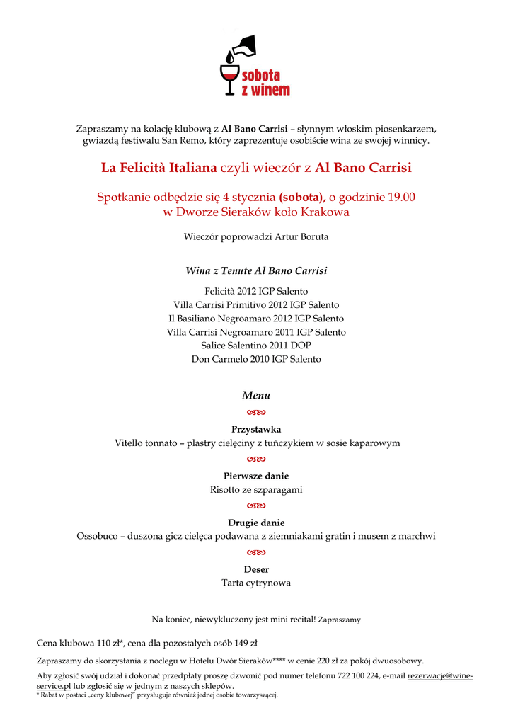 Zapraszamy na kolację klubową z Al Bano Carrisi – słynnym włoskim piosenkarzem, gwiazdą festiwalu San Remo, który zaprezentuje osobiście wina ze swojej winnicy. La Felicità Italiana czyli wieczór z Al Bano Carrisi Spotkanie odbędzie się 4 stycznia (sobota), o godzinie 19.00 w Dworze Sieraków koło Krakowa Wieczór poprowadzi Artur Boruta Wina z Tenute Al Bano Carrisi Felicità 2012 IGP Salento Villa Carrisi Primitivo 2012 IGP Salento Il Basiliano Negroamaro 2012 IGP Salento Villa Carrisi Negroamaro 2011 IGP Salento Salice Salentino 2011 DOP Don Carmelo 2010 IGP Salento Menu Przystawka Vitello tonnato – plastry cielęciny z tuńczykiem w sosie kaparowym Pierwsze danie Risotto ze szparagami Drugie danie Ossobuco – duszona gicz cielęca podawana z ziemniakami gratin i musem z marchwi Deser Tarta cytrynowa Na koniec, niewykluczony jest mini recital! Zapraszamy Cena klubowa 110 zł*, cena dla pozostałych osób 149 zł Zapraszamy do skorzystania z noclegu w Hotelu Dwór Sieraków**** w cenie 220 zł za pokój dwuosobowy. Aby zgłosić swój udział i dokonać przedpłaty proszę dzwonić pod numer telefonu 722 100 224, e-mail [email protected] lub zgłosić się w jednym z naszych sklepów. * Rabat w postaci „ceny klubowej” przysługuje również jednej osobie towarzyszącej.