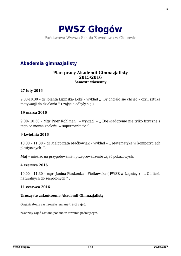1 PWSZ Głogów Państwowa Wyższa Szkoła Zawodowa w Głogowie Akademia gimnazjalisty Plan pracy Akademii Gimnazjalisty 2015/2016 Semestr wiosenny 27 luty 2016 9.00-10.30 – dr Jolanta Lipińska- Lokś – wykład ,, By chciało się chcieć – czyli sztuka motywacji do działania ’’ ( zajęcia odbyły się ). 19 marca 2016 9.00- 10.30 – Mgr Piotr Kohlman – wykład – ,, Doświadczenie nie tylko fizyczne z tego co można znaleźć w supermarkecie ”. 9 kwietnia 2016 10.00 – 11.30 – dr Małgorzata Maćkowiak – wykład – ,, Matematyka w kompozycjach plastycznych ”. Maj – miesiąc na przygotowanie i przeprowadzenie zajęć pokazowych. 4 czerwca 2016 10.00 – 11.30 – mgr Janina Płaskonka – Fietkowska ( PWSZ w Legnicy ) – ,, Od liczb naturalnych do zespolonych ” . 11 czerwca 2016 Uroczyste zakończenie Akademii Gimnazjalisty Organizatorzy zastrzegają zmianę treści zajęć. *Godziny zajęć zostaną podane w terminie późniejszym. PWSZ Głogów -1/3- 20.02.2017 2 DYREKTOR GŁOGOWSKIEJ FUNDACJI AKADEMICKIEJ dr Ewa Czaińska Państwowa Wyższa Szkoła Zawodowa w Głogowie i Głogowska Fundacja Akademicka zapraszają gimnazjalistów do udziału w IV edycji Akademii Gimnazjalisty. ,, ODWAŻNIE MYŚLĄCY – ROZUMIEM I ROZWIJAM SIĘ ” Akademia Gimnazjalisty to projekt edukacyjny przewidziany dla gimnazjalistów pragnących rozwijać postawy twórcze i zainteresowania naukowe. Zajęcia w Akademii będą odbywać się bezpłatnie w systemie rocznym, na który przypadają 2 semestry. Na każdy semestr składają się cztery lub pięć spotkań. Zajęcia będą prowadzone przez nauczycieli akademickich PWSZ w Głogowie a w tym wydaniu, również wykładowców PWSZ w Legnicy i ekspertów zewnętrznych. Kolejna edycja Akademii Gimnazjalisty nietypowo łączy nauki ścisłe oraz artystyczne. Student AG otrzyma indeks oraz dyplom potwierdzający ukończenie Akademii. Zapisy pod adresem e-mile [email protected] do 6 listopada. Zapraszamy Plan pracy Akademii Gimnazjalisty 2015/2016 Semestr jesień/ zima 1. 7 listopada 2015 10.30 – Rejestracja uczestników projektu Akademia Gimnazjalisty 11.00 – uroczyste rozpoczęcie i wręczenie indeksów słuchaczom AG. 11.30-12.15 – wykład inauguracyjny mgr Wojciech Janisio ( dyr. Zespołu Szkół Ekonomicznych w Głogowie) – ,, Jak nazwać, zrozumieć i zmienić rzeczywistość w biegu…czyli odpowiednie dać rzeczy słowo… ’’. 2. 21 listopada 2015 PWSZ Głogów -2/3- 20.02.2017 3 Mgr inż. Zofia Rogalska – Sykała (PWSZ w Głogowie ) – wykład – ,, Fizyka wokół NAS ”. * 3. 5 grudnia 2015 10.00 – mgr inż. Lucyna Kukła ( PWSZ w Głogowie ) – wykład – ,, Kryptografia ”. 4. 16 stycznia 2016 10.00 – mgr Dorota Drozd ( MOK w Głogowie ) – ,, Muzyka rozrywkowa kiedyś i dziś ” Organizatorzy zastrzegają zmianę treści zajęć. *Godziny zajęć zostaną podane w terminie późniejszym. DYREKTOR GŁOGOWSKIEJ FUNDACJI AKADEMICKIEJ dr Ewa Czaińska PWSZ Głogów -3/3- 20.02.2017
