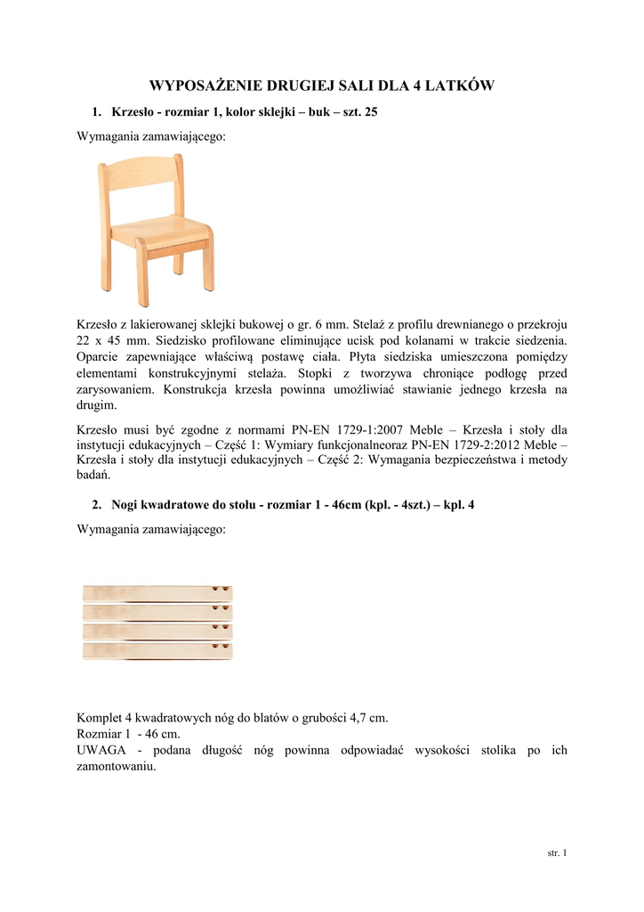 WYPOSAŻENIE DRUGIEJ SALI DLA 4 LATKÓW 1. Krzesło - rozmiar 1, kolor sklejki – buk – szt. 25 Wymagania zamawiającego: Krzesło z lakierowanej sklejki bukowej o gr. 6 mm. Stelaż z profilu drewnianego o przekroju 22 x 45 mm. Siedzisko profilowane eliminujące ucisk pod kolanami w trakcie siedzenia. Oparcie zapewniające właściwą postawę ciała. Płyta siedziska umieszczona pomiędzy elementami konstrukcyjnymi stelaża. Stopki z tworzywa chroniące podłogę przed zarysowaniem. Konstrukcja krzesła powinna umożliwiać stawianie jednego krzesła na drugim. Krzesło musi być zgodne z normami PN-EN 1729-1:2007 Meble – Krzesła i stoły dla instytucji edukacyjnych – Część 1: Wymiary funkcjonalneoraz PN-EN 1729-2:2012 Meble – Krzesła i stoły dla instytucji edukacyjnych – Część 2: Wymagania bezpieczeństwa i metody badań. 2. Nogi kwadratowe do stołu - rozmiar 1 - 46cm (kpl. - 4szt.) – kpl. 4 Wymagania zamawiającego: Komplet 4 kwadratowych nóg do blatów o grubości 4,7 cm. Rozmiar 1 - 46 cm. UWAGA - podana długość nóg powinna odpowiadać wysokości stolika po ich zamontowaniu. str. 1 3. Blat stołu – szt. 4 Wymagania zamawiającego: Blat stołu wraz z oskrzynią z płyty laminowanej o gr. 18 mm w tonacji buku, obrzeżem PCV o gr. 2 mm. Oskrzynia z metalowymi narożnikami, przystosowanymi do montażu nóg • wym. blatu 120 x 74 cm Kształt blatu - prostokątny, Kolor obrzeża PCV: bukowy 4. Zestaw mebli – 1 kpl. Wymagania zamawiającego: - Korpusy, półki i przegrody z płyty laminowanej o grubości 18 mm, w odcieniu brzozy, z trwałym obrzeżem multiplex o grubości 2mm imitującym strukturę sklejki - Plecy z dwóch płyt HDF brzoza o gr.3 mm każda, wsuwane w nafrezowane rowki w bokach, wieńcu dolnym i górnym szafki, W skład zestawu wchodzi: Nadstawka z 3 półkami - 1 szt. - Z dwiema wzmocnionymi półkami (3 przestrzenie), które mają 5-stopniową możliwość regulacji wysokości i posiadają blokadę chroniącą półki przed wypadaniem. - Do zamontowania na regale. - Wymiary: 89,1 x 41,5 x 115,9 cm Produkt musi posiadać certyfikat potwierdzający zgodność z normą EN 16121/11.13 str. 2 Drzwiczki do nadstawki - brzozowe - 1 szt. - Z płyty MDF. Wyposażone w zaookrąglone uchwyty z tworzywa sztucznego w kolorze srebrnym. Zawiasy umożliwiające otwarcie szafki na 180 stopni. • 1 para • Wymiary: 42 x 113,5 m Produkt musi posiadać certyfikat potwierdzający zgodność z normą EN 16121/11.13 Szafka z 3 półkami na cokole - 1 szt. - Z 3 wzmocnionymi półkami (4 przestrzenie), które mają możliwość 5 stopniowej regulacji i posiadają blokadę chroniącą przed wypadaniem. - Wnęka na listwę podłogową oraz cokół o wys. 80 mm ze stopkami chroniącymi przed zarysowaniem podłogi. • Wymiary: 89,1 x 41,5 x 87,1 cm Produkt musi posiadać certyfikat potwierdzający zgodność z normą EN 16121/11.13 Drzwiczki do szafki z półkami - brzoza - 1 szt. - Z płyty MDF. Wyposażone w zaokrąglone uchwyty z tworzywa sztucznego w kolorze srebrnym. Zawiasy umożliwiające otwarcie szafki na 180 stopni. • 1 para • Wymiary: 42 x 74,9 cm Produkt musi posiadać certyfikat potwierdzający zgodność z normą EN 16121/11.13 5. Szafka z przegrodami na pojemniki i szuflady na cokole – szt. 2 Wymagania zamawiającego: - Korpus, półki i przegrody z płyty laminowanej o grubości 18 mm, w odcieniu brzozy, z trwałym obrzeżem multiplex o grubości 2mm imitującym strukturę sklejki. - Plecy .z dwóch płyt HDF brzoza o gr.3 mm każda, wsuwane w nafrezowane rowki w bokach, wieńcu dolnym i górnym szafki. - Z dwiema przegrodami pionowymi tworzącymi 3 przestrzenie, które należy uzupełnić 12 pojemnikami lub 24 szufladami z litego drewna bukowego. - Wnęka na listwę podłogową oraz cokół o wys. 80 mm ze stopkami chroniącymi przed zarysowaniem podłogi. - Wymiary: 89,1 x 41,5 x 87,1 cm Produkt musi posiadać certyfikat potwierdzający zgodność z normą EN 16121/11.13. str. 3 6. Pojemnik naturalny – szt. 24 Wymagania zamawiającego: Pojemnik z litego drewna bukowego, lakierowanego Dostarczany zmontowany. • wym. 26,5 x 35 x 16,5 cm Front z otworem funkcjonującym jako uchwyt pojemnika, ułatwiającm przenoszenie. 7. Prowadnice plastikowe – szt. 24 Wymagania zamawiającego: Prowadnice plastikowe pasujące do pojemników i szuflad z litego drewna bukowego. Wykonane z tworzywa sztucznego. Wraz z prowadnicami należy dostarczyć ograniczniki zabezpieczające przed wypadaniem szuflad i pojemników. • 1 para str. 4 8. Biurko – szt. 1 Wymagania zamawiającego: Z płyty laminowanej o grubości 18 mm. w tonacji brzozy, wykończone obrzeżem o grubości 2 mm. Blat ze sklejki o grubości 19mm. Z zaokrąglonymi narożnikami. Z szafką i szufladą, obydwie zamykane na zamek. Front szafki i szuflady w kolorze brzozy. Wewnątrz szafki jedna półka. • wym. 124 x 70 x 76 cm • wym. wewn. szafki 45 x 59 x 46,5 cm • wym. wewn. szuflady 40,5 x 51,5 x 12,5 cm 9. Krzesło – szt. 2 Wymagania zamawiającego: Krzesło na stelażu metalowym z siedziskiem i oparciem pokrytym trwałą tkaniną PCV - Siedzisko wyprofilowane eliminujące ucisk pod kolanami w trakcie siedzenia. - Zaokrąglone oparcie, wpasowane i zamocowane w stelażu. - Tylne nóżki odchylone do tyłu, aby zwiększyć stabilność. -Zatyczki na nóżkach z tworzywa sztucznego chroniące podłogę przed zarysowaniem. - Możliwość sztaplowania krzeseł max. 8 szt. Stelaż wykonany z rury okrągłej o śr 25 mm w kolorze aluminium. Tkanina PCV w kolorze błękitnym. Szerokość siedziska 38 cm Wysokość siedziska 47 cm str. 5 Wysokość krzesła 83,5 cm 10. Biblioteczka stojąca – szt. 1 Wymagania zamawiającego: Szafka wykonana z płyty wiórowej obustronnie melaminowanej o grubości 18mm, w kolorze buk, - tyły mebli, tzw. plecy, z płyty HDF buk o grubości 3mm, w kolorze buk, - korpus obrzeże PCV o grubości 2 mm, w kolorze buk, Szafka o wym. 736 x 400 x 1210 mm, wyposażona 