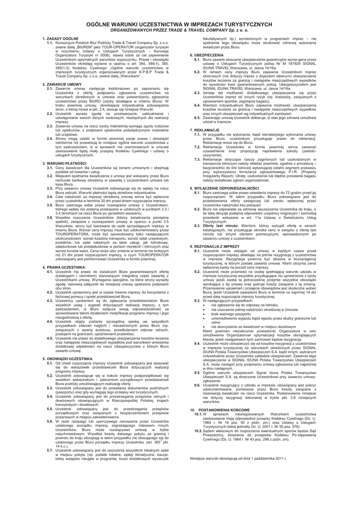 OGÓLNE WARUNKI UCZESTNICTWA W IMPREZACH TURYSTYCZNYCH ORGANIZOWANYCH PRZEZ TRADE & TRAVEL COMPANY Sp. z o. o. 1. ZASADY OGÓLNE 1.1. Konsorcjum Polskich Biur Podróży Trade & Travel Company Sp. z o.o. zwane dalej „BIUREM” jako TOUR-OPERATOR (organizator turystyki w rozumieniu Ustawy o Usługach Turystycznych – Koncesja Organizatora Turystyki nr 0006), stawia sobie za cel zapewnienie Uczestnikom optymalnych warunków wypoczynku. Prawa i obowiązki Uczestników określają wydane w oparciu o art. 384, 384(1), 385, 385(1-3) Kodeksu Cywilnego „Ogólne warunki uczestnictwa w imprezach turystycznych organizowanych przez K.P.B.P Trade & Travel Company Sp. z o.o. zwane dalej „Warunkami”. 2. ZAWARCIE UMOWY 2.1. Zawarcie umowy następuje każdorazowo po zapoznaniu się Uczestnika z ofertą, podpisaniu zgłoszenia uczestnictwa na warunkach określonych w umowie oraz potwierdzeniu zgłoszenia uczestnictwa przez BIURO (osoby działające w imieniu Biura). W braku pisemnej umowy, określającej indywidualnie zobowiązania stron, o której mowa w pkt. 2.4, stosuje się niniejsze Warunki. 2.2. Uczestnik wyraża zgodę na przetwarzanie, uaktualnianie i udostępnianie swoich danych osobowych, niezbędnych dla realizacji imprezy. 2.3. Zawarcie umowy na rzecz osoby małoletniej wymaga zgody rodziców lub opiekunów, z podpisami opiekunów poświadczonymi notarialnie lub urzędowo. 2.4. Strony mogą ustalić w formie pisemnej swoje prawa i obowiązki odmiennie niż przewidują to niniejsze ogólne warunki uczestnictwa z tym zastrzeżeniem, iż w sprawach nie unormowanych w umowie zastosowanie będą miały przepisy Kodeksu Cywilnego i ustawy o usługach turystycznych. 3. WARUNKI PŁATNOŚCI 3.1. Ceny świadczeń dla Uczestników są cenami umownymi i obejmują podatek od towarów i usług. 3.2. Miejscem spełnienia świadczenia z umowy jest wskazany przez Biuro rachunek bankowy określony w zawartej z Uczestnikiem umowie lub kasa Biura. 3.3. Przy zawarciu umowy Uczestnik zobowiązuje się do wpłaty na rzecz Biura zaliczki. Warunki płatności będą określone indywidualnie. 3.4. Cała należność za imprezę określoną umową winna być wpłacona przez uczestnika w terminie 30 dni przed dniem rozpoczęcia imprezy. 3.5. Biuro zastrzega sobie prawo rozwiązania umowy z Uczestnikiem, którego wpłaty nie zostaną przekazane w ustalonych w punktach 3.3 i 3.4 terminach na rzecz Biura po uprzednim wezwaniu. 3.6. Wszelkie roszczenia Uczestników (którzy świadczenia pieniężne spełnili), związane z rozwiązaniem umowy w oparciu o punkt 3.5 Warunków, winny być kierowane do osób sprzedających imprezy w imieniu Biura. Wzrost ceny imprezy musi być udokumentowany przez TOUROPERATORA, może być spowodowany tylko następującymi okolicznościami: wzrost kosztów transportu, wzrost opłat urzędowych, podatków, lub opłat należnych za takie usługi, jak lotniskowe, załadunkowe lub przeładunkowe w portach morskich i lotniczych oraz wzrost kursów walut. Cena może ulec zmianie w terminie nie krótszym niż 21 dni przed rozpoczęciem imprezy, o czym TOUROPERATOR zobowiązany jest poinformować Uczestnika w formie pisemnej. 4. PRAWA UCZESTNIKA 4.1. Uczestnik ma prawo do świadczeń Biura gwarantowanych ofertą (katalogiem i cennikiem) stanowiącym integralną część zawartej z Uczestnikami umowy. Wymagania specjalne, na które strony wyraziły zgodę, stanowią załącznik do niniejszej umowy opatrzone podpisami obu stron. 4.2. Uczestnik uprawniony jest w czasie trwania imprezy do korzystania z fachowej pomocy i opieki przedstawicieli Biura. 4.3. Uczestnicy uprawnieni są do zgłaszania przedstawicielom Biura wszelkich uwag i sugestii dotyczących realizacji imprezy, z tym zastrzeżeniem, iż Biuro wyłącza swoją odpowiedzialność za spowodowane takimi działaniami modyfikacje programu imprezy i jego niezgodnością z ofertą. 4.4. Uczestnik objęty zostanie szczególną opieką we wszystkich przypadkach zdarzeń nagłych i niezawinionych przez Biuro (np. związanych z awarią autobusu, przedłużeniem odpraw celnych, postojami na granicach, opóźnieniami przelotów). 4.5. Uczestnik ma prawo do dodatkowego ubezpieczenia kosztów leczenia oraz następstw nieszczęśliwych wypadków pod warunkiem wniesienia dodatkowej odpłatności na rzecz Ubezpieczyciela z którym Biuro zawarło umowę. 5. OBOWIĄZKI UCZESTNIKA 5.1. Od chwili rozpoczęcia imprezy Uczestnik zobowiązany jest stosować się do wskazówek przedstawicieli Biura dotyczących realizacji programu imprezy. 5.2. Uczestnik zobowiązuje się w trakcie imprezy podporządkować się wszelkim wskazówkom i zaleceniom porządkowym przedstawicieli Biura podróży umożliwiającym realizację oferty. 5.3. Uczestnik zobowiązany jest do posiadania dokumentów podróżnych (paszportu) oraz gdy wymagają tego przepisy wiz turystycznych. 5.4. Uczestnik zobowiązany jest do przestrzegania przepisów celnych i dewizowych obowiązujących w Rzeczpospolitej Polskiej, krajach tranzytowych i docelowych. 5.5. Uczestnik zobowiązany jest do przestrzegania przepisów porządkowych oraz związanych z bezpieczeństwem przepisów pożarowych w miejscu zakwaterowania. 5.6. W razie rażącego lub uporczywego naruszania przez Uczestnika ustalonego porządku imprezy zagrażającego interesom innych Uczestników, Biuro może rozwiązywać umowę w trybie natychmiastowym. Wszelkie koszty dalszego pobytu za granicą i powrotu do kraju obciążają w takim przypadku nie stosującego się do 3 ustalonego przez Biuro porządku imprezy Uczestnika. (art. 385 pkt. 14 k.c.). 5.7. Uczestnik zobowiązany jest do uiszczenia wszystkich lokalnych opłat w miejscu pobytu (np. podatki lokalne, opłaty klimatyczne, kaucje, bilety wstępów nieujęte w programie, koszt dodatkowych wycieczek fakultatywnych itp.) wymienionych w programach imprez – nie spełnienie tego obowiązku może skutkować odmową wykonania świadczeń przez Biuro. 6. UBEZPIECZENIA 6.1. Biuro zawarło st