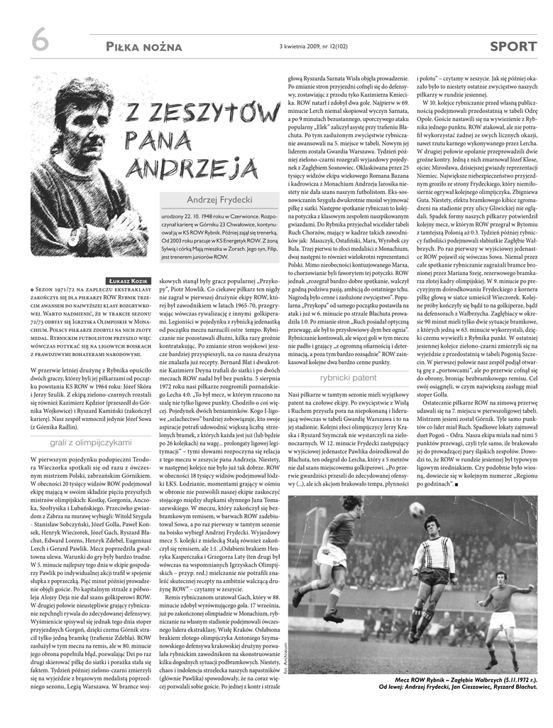 6 Piłka nożna głową Ryszarda Sarnata Wisła objęła prowadzenie. Po zmianie stron przyjezdni cofnęli się do defensywy, zostawiając z przodu tyko Kazimierza Kmiecika. ROW natarł i zdobył dwa gole. Najpierw w 69. minucie Lerch niemal skopiował wyczyn Sarnata, a po 9 minutach bezustannego, uporczywego ataku popularny „Elek” zaliczył asystę przy trafieniu Błachuta. Po tym zasłużonym zwycięstwie rybniczanie awansowali na 5. miejsce w tabeli. Nowym jej liderem została Gwardia Warszawa. Tydzień później zielono-czarni rozegrali wyjazdowy pojedynek z Zagłębiem Sosnowiec. Oklaskiwana przez 25 tysięcy widzów ekipa wiekowego Romana Bazana i kadrowicza z Monachium Andrzeja Jarosika niestety nie dała szans naszym futbolistom. Eks-sosnowiczanin Szyguła dwukrotnie musiał wyjmować piłkę z siatki. Następne spotkanie rybniczan to kolejna potyczka z klasowym zespołem naszpikowanym gwiazdami. Do Rybnika przyjechał wicelider tabeli Ruch Chorzów, mający w kadrze takich zawodników jak: Maszczyk, Ostafiński, Marx, Wyrobek czy Bula. Trzej pierwsi to złoci medaliści z Monachium, dwaj następni to również wielokrotni reprezentanci Polski. Mimo nieobecności kontuzjowanego Marxa, to chorzowianie byli faworytem tej potyczki. ROW jednak „rozegrał bardzo dobre spotkanie, walczył z godną podziwu pasją, ambicją do ostatniego tchu. Nagrodą było cenne i zasłużone zwycięstwo”. Popularna „Przykopa” od samego początku postawiła na atak i już w 6. minucie po strzale Błachuta prowadziła 1:0. Po zmianie stron „Ruch posiadał optyczną przewagę, ale był to przysłowiowy dym bez ognia”. Rybniczanie kontrowali, ale więcej goli w tym meczu nie padło i grający „z ogromną ofiarnością i determinacją, a poza tym bardzo rozsądnie” ROW zainkasował kolejne dwa bardzo cenne punkty. Andrzej Frydecki urodzony 22. 10. 1948 roku w Czerwionce. Rozpoczynał karierę w Górniku 23 Chwałowice, kontynuował ją w KS ROW Rybnik. Później zajął się trenerką. Od 2003 roku pracuje w KS Energetyk ROW. Z żoną Sylwią i córką Mają mieszka w Żorach. Jego syn, Filip, jest trenerem juniorów ROW. W przerwie letniej drużynę z Rybnika opuściło dwóch graczy, którzy byli jej piłkarzami od początku powstania KS ROW w 1964 roku: Józef Skóra i Jerzy Szulik. Z ekipą zielono-czarnych rozstali się również Kazimierz Kędzior (przeszedł do Górnika Wojkowice) i Ryszard Kamiński (zakończył karierę). Nasz zespół wzmocnił jedynie Józef Sowa (z Górnika Radlin). grali z olimpijczykami W pierwszym pojedynku podopieczni Teodora Wieczorka spotkali się od razu z ówczesnym mistrzem Polski, zabrzańskim Górnikiem. W obecności 20 tysięcy widzów ROW podejmował ekipę mającą w swoim składzie pięciu przyszłych mistrzów olimpijskich: Kostkę, Gorgonia, Anczoka, Szołtysika i Lubańskiego. Przeciwko gwiazdom z Zabrza na murawę wybiegli: Witold Szyguła - Stanisław Sobczyński, Józef Golla, Paweł Konsek, Henryk Wieczorek, Józef Gach, Ryszard Błachut, Edward Lorens, Henryk Zdebel, Eugeniusz Lerch i Gerard Pawlik. Mecz poprzedziła gwałtowna ulewa. Warunki do gry były bardzo trudne. W 5. minucie najlepszy tego dnia w ekipie gospodarzy Pawlik po indywidualnej akcji trafił w spojenie słupka z poprzeczką. Pięć minut później prowadzenie objęli goście. Po kapitalnym strzale z półwoleja Alojzy Deja nie dał szans golkiperowi ROW. W drugiej połowie nieustępliwie grający rybniczanie zepchnęli rywala do zdecydowanej defensywy. Wyśmienicie spisywał się jednak tego dnia stoper przyjezdnych Gorgoń, dzięki czemu Górnik stracił tylko jedną bramkę (trafienie Zdebla). ROW zasłużył w tym meczu na remis, ale w 80. minucie jego obrona popełniła błąd, pozwalając Dei po raz drugi skierować piłkę do siatki i porażka stała się faktem. Tydzień później zielono-czarni zmierzyli się na wyjeździe z brązowym medalistą poprzedniego sezonu, Legią Warszawa. W bramce woj- skowych stanął były gracz popularnej „Przykopy”, Piotr Mowlik. Co ciekawe piłkarz ten nigdy nie zagrał w pierwszej drużynie ekipy ROW, której był zawodnikiem w latach 1965-70, przegrywając wówczas rywalizację z innymi golkiperami. Legioniści w pojedynku z rybnicką jedenastką od początku meczu narzucili ostre tempo. Rybniczanie nie pozostawali dłużni, kilka razy groźnie kontratakując. Po zmianie stron wojskowi jeszcze bardziej przyspieszyli, na co nasza drużyna nie znalazła już recepty. Bernard Blat i dwukrotnie Kazimierz Deyna trafiali do siatki i po dwóch meczach ROW nadal był bez punktu. 5 sierpnia 1972 roku nasi piłkarze rozgromili poznańskiego Lecha 4:0. „To był mecz, w którym rzucono na szalę nie tylko ligowe punkty. Chodziło o coś więcej. Pojedynek dwóch beniaminków. Kogo I-ligowe „szlachectwo” bardziej zobowiązuje, kto swoje aspiracje potrafi udowodnić większą liczbą strzelonych bramek, z których każda jest już (lub będzie po 26 kolejkach) na wagę... prolongaty ligowej legitymacji” – tymi słowami rozpoczyna się relacja z tego meczu w zeszycie pana Andrzeja. Niestety, w następnej kolejce nie było już tak dobrze. ROW w obecności 18 tysięcy widzów podejmował łódzki ŁKS. Łodzianie, momentami grający w ośmiu w obronie nie pozwolili naszej ekipie zaskoczyć stojącego między słupkami słynnego Jana Tomaszewskiego. W meczu, który zakończył się bezbramkowym remisem, w barwach ROW zadebiutował Sowa, a po raz pierwszy w tamtym sezonie na boisko wybiegł Andrzej Frydecki. Wyjazdowy mecz 5. kolejki z mielecką Stalą również zakończył się remisem, ale 1:1. „Osłabieni brakiem Henryka Kasperczaka i Grzegorza Laty (ten drugi był wówczas na wspomnianych Igrzyskach Olimpijskich – przyp. red.) mielczanie nie potrafi li znaleźć skutecznej recepty na ambitnie walczącą drużynę ROW” – czytamy w zeszycie. Remis rybniczanom uratował Gach, który w 88. minucie zdobył wyrównującego 