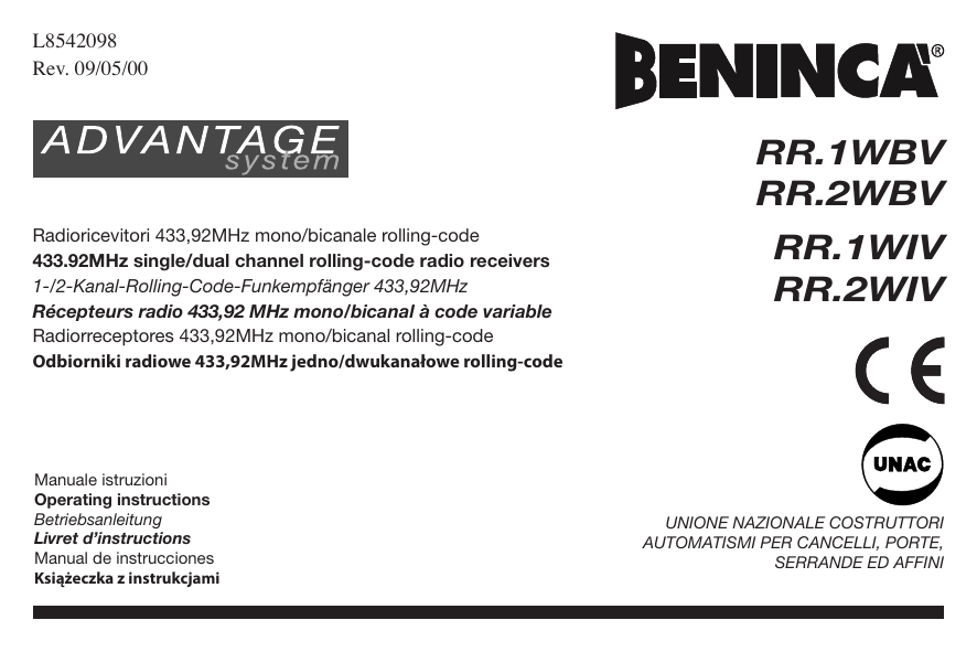 L8542098 Rev. 09/05/00 RR.1WBV RR.2WBV Radioricevitori 433,92MHz mono/bicanale rolling-code 433.92MHz single/dual channel rolling-code radio receivers 1-/2-Kanal-Rolling-Code-Funkempfänger 433,92MHz Récepteurs radio 433,92 MHz mono/bicanal à code variable Radiorreceptores 433,92MHz mono/bicanal rolling-code Odbiorniki radiowe 433,92MHz jedno/dwukanałowe rolling-code Manuale istruzioni Operating instructions Betriebsanleitung Livret d’instructions Manual de instrucciones Książeczka z instrukcjami RR.1WIV RR.2WIV UNIONE NAZIONALE COSTRUTTORI AUTOMATISMI PER CANCELLI, PORTE, SERRANDE ED AFFINI ���� � � ���� ���� * � � ���� �������� �������� � � � � ��� � �� *solo RR.2WIV *only RR.2WBV *nur RR.2WIV *uniquement RR.2WIV *sólo RR.2WIV *tylko RR.2WIV RR.1WIV RR.2WIV LED P ��� ��� 3 ���� � � ����* � � �������� �������� � � ��� 4 � � ���� *solo RR.2WBV *only RR.2WBV *nur RR.2WBV *uniquement RR.2WBV *sólo RR.2WBV *tylko RR.2WBV P LED ���� 12 ��� ��� RR.1WBV RR.2WBV 34 56 78 POLSKI Odbiorniki radiowe 433,92MHz jedno/dwukanałowe rolling-code kompatybilne z systemem ADVANTAGE Dostępne ze złączem sprzęgającym molex lub w skrzynce plastykowej z listwą zaciskową. Pamięć standardowa może pomieścić maksymum 512 modułów transmisyjnych rolling-code. Dostępna jest wersja specjalna z pamięcią mogącą pomieścić 2048 modułów transmisyjnych. Wypełnienie pamięci sygnalizowane jest przez 10 mignięć światła Pomarańczowego. Uwaga: Ręczny komunikator programowania Advantage i odpowiadający mu system sterowania umożliwiają stosowanie niektórych funkcji zaawansowanych, opisanych w specjalnych instrukcjach do których odsyłamy dla uzyskania dodatkowych informacji. Wskazówki dla użytkowania Dla zapewnienia dobrego odbioru zaleca się instalowanie anteny z dala od mas metalowych i ustawianie odbiorników z zachowaniem należytych pomiędzy nimi odstępów. Przy braku anteny odbiór jest znacznie ograniczony. Wpisywanie do pamięci modułów transmisyjnych Procedura uproszczona Dla prostego wpisania do pamięci jednego lub kilku modułów transmisyjnych służących do uaktywniania pierwszego kanału, należy wykonać poniższą procedurę uproszczoną: 1 Nacisnąć przycisk P odbiornika po czym zwolnić go. 2 Zaświeci się na 3sek Czerwony LED, po czym zgaśnie on na 1sek i ponownie zaświeci się na 5sek. 3 Nacisnąć, podczas świecącego się Czerwonego LEDA, przycisk modułu transmisyjnego wybranego do zestawienia z kanałem 1. 4 Pozostałe moduły transmisyjne można w następnej kolejności wpisywać do pamięci po naciśnięciu przycisku w przeciągu 5sek od poprzedniego wpisywania. 5 Po zakończeniu procedury odczekać 5sek, odbiornik wyłączy się z programowania. Wpisywanie do pamięci modułów transmisyjnych zdalne Przywoływanie Jeśli któryś z modułów transmisyjnych został już wpisany do pamięci odbiornika to można przywoływać go zdalnie radiem (bez używania przycisku P na odbiorniku). Postępować według poniższych wskazań: 1 Nacisnąć zakryty przycisk wywoławczy wpisanego już do pamięci modułu transmisyjnego. 2 Trzymać wciśnięty, przez 5sek, przycisk wpisanego do pamięci modułu transmisyjnego odpowiadającego kanałowi wyznaczonemu do zestawienia z nowym modułem transmisyjnym. 3 Trzymać wciśnięty, przez 5sek, przycisk nowego modułu transmisyjnego do zestawienia z wybranym kanałem, zob. punkt 2. 4 Odbiornik utrwala w pamięci wpisywane moduły transmisyjne i natychmiast wyłącza się z programowania. Programowanie Wpisywanie do pamięci modułów transmisyjnych i nastawianie układów poszczególnych kanałów wykonywane jest za pomocą przycisku “P” (zob. Rys.1/2). By przejść z jednej fazy programowania do następnej należy naciskać przycisk P z przerwami nie dłuższymi niż 3sek pomiędzy jednym naciśnięciem a drugim. Po wybraniu odpowiedniej fazy, odczekać przez około 3/4sek, sygnalizujący LED wskaże wejście do programu (zob. kolumna “Czynności”). W Tabeli 1 wskazane są różne fazy programowania. 25 TABELA 1 Faza 0 LED Funkcja Czynności Zgaszony Bez funkcji Stan normalny. Wcisnąć przycisk 1 2 3 4 5 0 26 Zaświeci się Czerwony LED, odczekać3sek, LED zgaśnie i ponownie się Utrwalanie w pamięci 1-go kanału zaświeci, nacisnąć w przeciągu5sek przycisk modułu transmisyjnego radiowego wybranego do zestawienia z kanałem 1.* Nacisnąć w ciągu3sek przycisk P Utrwalanie w pamięci 2-go kanału Zaświeci się LED Zielony, odczekać3sek, LED zgaśnie i ponownie Zielony radiowego (tylko dla odbiorników się zaświeci, nacisnąć w ciągu5sek przycisk modułu transmisyjnego dwukanałowych “RR.2”) wybranego do zestawienia z kanałem 2.* Nacisnąć w ciągu3sek przycisk P Zaświeci się LED Pomarańczowy, odczekać3sek, LED zgaśnie i ponownie Automatyczne wpisywanie się zaświeci, nacisnąć w ciągu5sek jakikolwiek przycisk modułu do pamięci 1-go i 2-go kanału Pomarańczowy transmisyjnego. radiowego (tylko dla odbiorników Przycisk 1 zostanie zestawiony z kanałem 1, przycisk 2 zostanie dwukanałowych “RR.2”) zestawiony z kanałem 2.* Nacisnąć w ciągu3sek przycisk P LED mignie szybko 5 razy. Naciskając przycisk P podczas tych 5-ciu Czerwony Nastawianie czasów kanału 1 mignięć przechodzi się do fazy następnej. Po 5-ciu szybkich mignięciach migający wchodzi się do menu Czasowy. Zob. Paragraf “Układy czasowe Nacisnąć w ciągu3sek przycisk P Nastawianie czasów kanału 2 LED mignie szybko 5 razy. Naciskając przycisk P podczas tych 5-ciu Zielony (tylko dla odbiorników mignięć przechodzi się do fazy następnej. Po upływie 5-ciu szybkich migający dwukanałowych “RR.2”) mignięć wchodzi się do menu Czasowy. Zob. Paragraf “Układy czasow Nacisnąć w ciągu3sek przyc