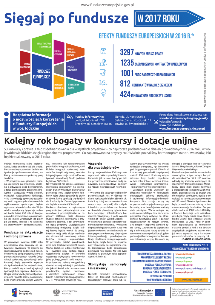www.funduszeeuropejskie.gov.pl W 2017 ROKU Efekty funduszy europejskich w 2016 r.* INFRASTRUKTURA I ŚRODOWISKO POLSKA CYFROWA pomoc techniczna Wiedza Edukacja Rozwój 3297 nowych miejsc pracy 1235 zagranicznych kontraktów handlowych 1001 prac badawczo-rozwojowych 812 kontraktów nauki z biznesem 424 innowacyjne produkty i usługi POLSKA WSCHODNIA FUNDUSZE EUROPEJSKIE programy regionalne Bezpłatna informacja o możliwościach korzystania z Funduszy Europejskich w woj. łódzkim INTELIGENTNY ROZWÓJ Punkty informacyjne: Łódź, ul. Moniuszki 7/9 Brzeziny, ul. Sienkiewicza 16 Sieradz, ul. Kościuszki 6 Bełchatów, ul. Kościuszki 17 Łowicz, ul. Świętojańska 1 *Szacowane na podstawie podpisanych umów o dofinansowanie Sięgaj po fundusze Pełne dane kontaktowe znajdziesz na: www.funduszeeuropejskie.gov.pl/punkty Więcej informacji: www.rpo.lodzkie.pl www.funduszeeuropejskie.gov.pl Kolejny rok bogaty w konkursy i dotacje unijne 53 konkursy i prawie 3 mld zł dofinansowania dla wszystkich projektów – to najkrótsze podsumowanie działań prowadzonych w 2016 roku w województwie łódzkim dzięki regionalnemu programowi. Co zaplanowano na przyszły rok? Właśnie poznaliśmy harmonogram naboru wniosków, jaki będzie realizowany w 2017 roku. Pośród konkursów, które zaplanowano, każdy znajdzie coś dla siebie. Bardzo ważnym punktem będzie aktywizacja społeczno-zawodowa, na którą zarezerwowano pokaźną pulę środków. – W przyszłym roku pieniądze zostaną skierowane na inwestycje, szkolenia i aktywizację osób bezrobotnych, a także profilaktyczne programy zdrowotne – zapowiada Witold Stępień, marszałek województwa łódzkiego. – Na aktywizację społeczno-zawodową osób zagrożonych ubóstwem lub wykluczeniem społecznym będzie ogłaszana cała seria konkursów. Wojewódzki urząd pracy dysponuje na ten cel kwotą bliską 250 mln zł. Kolejne pieniądze przewidziane są na ułatwienia dla matek wracających do pracy po urodzeniu dziecka i na szkolenia dla pracowników – dodaje marszałek. Fundusze na aktywizację i ochronę zdrowia W pierwszym kwartale 2017 roku przewidziano dwa konkursy na aktywizację zawodową. W jednym do rozdysponowania będzie 36,8 mln zł. Premiowane będą programy, które za pomocą różnorodnych narzędzi (aktywizacji społecznej, zawodowej i edukacyjnej) będą stanowiły wsparcie dla tych mieszkańców województwa, którzy znaleźli się w trudnej sytuacji życiowej lub są zagrożeni ubóstwem. Drugi z konkursów będzie miał podobny profil. Ponadto szansę na realizację będą miały projekty służące wspiera- niu, tworzeniu lub funkcjonowaniu podmiotów integracji społecznej, czyli klubów integracji społecznej, war-sztatów terapii zajęciowej, centrów integracji społecznej czy zakładów aktywności zawodowej. Tu do podziału będzie ok. 58,9 mln zł. Na tym jednak nie koniec. Jak jeszcze skorzystają mieszkańcy na pieniądzach z Unii? W każdym z kwartałów przyszłego roku zaplanowano konkursy, które ułatwią powrót do pracy osobom, które opiekują się dziećmi do 3 roku życia. Do rozdysponowania będzie w sumie 45,5 mln zł. Konkursy określone w regionalnym programie jako „Adaptacyjność pracowników i przedsiębiorstw w regionie” zakładają także działania służące ochronie, utrzymaniu i przywróceniu zdrowia. I tak premiowane będą programy uwzględniające rehabilitację medyczną, dzięki której łatwiej będzie wrócić do pracy. Projekty mają także służyć wydłużeniu aktywności zawodowej mieszkańców naszego województwa. W przypadku działań prozdrowotnych pula środków wynosi 20 mln zł. Warto dodać, że jeden z konkursów w I kwartale roku zakłada rozpowszechnienie działań w kierunku wczesnego wykrywania nowotworów jelita grubego, piersi i szyjki macicy. Przyszłoroczne nabory uwzględniają również rozwój edukacji i podniesienie jakości kształcenia. Na nauczanie przedszkolne, ogólne, zawodowe i dorosłych zaplanowano prawie 84 mln zł. Konkursy zostaną ogłoszone w I, II i IV kwartale przyszłego roku. Wsparcie dla przedsiębiorców Zarząd województwa łódzkiego nie zapomniał także o przedsiębiorcach. Podobnie jak w roku bieżącym tak i w przyszłym premiowane będą innowacje, niestandardowe pomysły na rozwój nowoczesnych technologii. – W sumie dla tej grupy odbiorców przewidzianych jest w różnego rodzaju konkursach blisko 250 mln zł. I nie liczę tutaj instrumentów finansowych (np. pożyczek) dla małych i średnich przedsiębiorstw. Jeszcze w I kwartale planujemy ogłosić konkurs dotyczący infrastruktury badawczo-rozwojowej, a pula wynosi 40 mln zł – mówi Witold Stępień. W II kwartale zostanie ogłoszony nabór na podobne działania. Tym razem do podziału będzie 64,9 mln zł. Na tym jednak nie koniec. W II i III kwartale zostaną ogłoszone konkursy obejmujące internacjonalizację przedsiębiorstw. Dzięki nim firmy z naszego województwa będą mogły liczyć na wsparcie przy wkraczaniu na zagraniczne rynki. Jednocześnie będą gospodarczo promować nasz region. Na tego typu działania w przyszłym roku zaplanowano 34,4 mln zł. Skorzystają samorządy i mieszkańcy Niemałe pieniądze przewidziano także na transport multimodalny (oznaczający przewóz osób lub to- warów przy użyciu dwóch lub więcej rodzajów transportu, np. kolejowego i drogowego) – ponad 200 mln zł i na rozwój gospodarki turystycznej – około 150 mln zł. Konkursy w tym zakresie były bardzo popularne w tym roku. Z kolei ochrona środowiska i technologie informacyjno-komunikacyjne wręcz przeciwnie. – Zachęcam przede wszystkim do składania wniosków w konkursach dotyczących ochrony środowiska i technologii informacyjno-komunikacyjnych. Oba rodzaje cieszyły się w poprzednich edycjach małą popularnością, a na beneficjentów czekają duże pieniądze. Warto ubiegać się o nie również dlatego, że w pierwszym przypadku mogą wpłyną