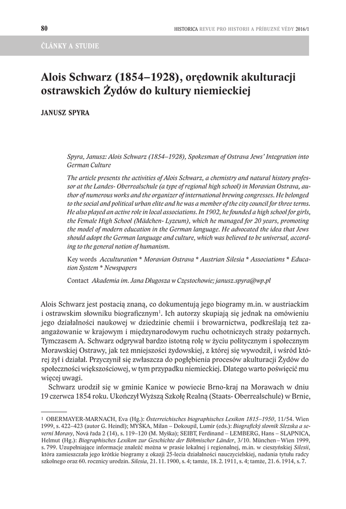 80 HISTORICA Revue pro historii a příbuzné vědy 2016/1 ČLÁNKY A STUDIE Alois Schwarz (1854–1928), orędownik akulturacji ostrawskich Żydów do kultury niemieckiej JANUSZ SPYRA Spyra, Janusz: Alois Schwarz (1854–1928), Spokesman of Ostrava Jews’ Integration into German Culture The article presents the activities of Alois Schwarz, a chemistry and natural history professor at the Landes- Oberrealschule (a type of regional high school) in Moravian Ostrava, author of numerous works and the organizer of international brewing congresses. He belonged to the social and political urban elite and he was a member of the city council for three terms. He also played an active role in local associations. In 1902, he founded a high school for girls, the Female High School (Mädchen- Lyzeum), which he managed for 20 years, promoting the model of modern education in the German language. He advocated the idea that Jews should adopt the German language and culture, which was believed to be universal, according to the general notion of humanism. Key words Acculturation * Moravian Ostrava * Austrian Silesia * Associations * Education System * Newspapers Contact Akademia im. Jana Długosza w Częstochowie; [email protected] Alois Schwarz jest postacią znaną, co dokumentują jego biogramy m.in. w austriackim i ostrawskim słowniku biograficznym1. Ich autorzy skupiają się jednak na omówieniu jego działalności naukowej w dziedzinie chemii i browarnictwa, podkreślają też zaangażowanie w krajowym i międzynarodowym ruchu ochotniczych straży pożarnych. Tymczasem A. Schwarz odgrywał bardzo istotną rolę w życiu politycznym i społecznym Morawskiej Ostrawy, jak też mniejszości żydowskiej, z której się wywodził, i wśród której żył i działał. Przyczynił się zwłaszcza do pogłębienia procesów akulturacji Żydów do społeczności większościowej, w tym przypadku niemieckiej. Dlatego warto poświęcić mu więcej uwagi. Schwarz urodził się w gminie Kanice w powiecie Brno-kraj na Morawach w dniu 19 czerwca 1854 roku. Ukończył Wyższą Szkołę Realną (Staats- Oberrealschule) w Brnie, 1 OBERMAYER-MARNACH, Eva (Hg.): Österreichisches biographisches Lexikon 1815–1950, 11/54. Wien 1999, s. 422–423 (autor G. Heindl); MYŠKA, Milan – Dokoupil, Lumír (eds.): Biografický slovník Slezska a severní Moravy, Nová řada 2 (14), s. 119–120 (M. Myška); SEIBT, Ferdinand – LEMBERG, Hans – SLAPNICA, Helmut (Hg.): Biographisches Lexikon zur Geschichte der Böhmischer Länder, 3/10. München – Wien 1999, s. 799. Uzupełniające informacje znaleźć można w prasie lokalnej i regionalnej, m.in. w cieszyńskiej Silesii, która zamieszczała jego krótkie biogramy z okazji 25-lecia działalności nauczycielskiej, nadania tytułu radcy szkolnego oraz 60. rocznicy urodzin. Silesia, 21. 11. 1900, s. 4; tamże, 18. 2. 1911, s. 4; tamże, 21. 6. 1914, s. 7. MATERIÁLY JANUSZ SPYRA Alois Schwarz (1854–1928) 81 później chemię i technologię na niemieckiej politechnice (Technische Hochschule) także w Brnie. W latach 1874–1875 był asystentem w katedrze technologii chemicznej2. W czasie studiów był członkiem studenckiego zrzeszenia Corps Austria Brünn, założonego w 1873 roku przy wsparciu starszej korporacji Corps Marchia Brünn, która skupiała byłych słuchaczy różnych niemieckich uczelni3. Po ukończeniu studiów od 18 listopada 1875 r. pracował jako zastępca profesora (suplent) w Wyższej Szkole Realnej w Bielsku4, od początku roku szkolnego 1877/1878 w Wyższej Szkole Realnej w Brnie. Ostatecznie w lipcu 1879 r. znalazł stałe zatrudnienie w Krajowej Wyższej Szkole Realnej w Morawskiej Ostrawie. W powstałej dwa lata wcześniej pierwszej szkole średniej na terenie miasta uczył chemii, chemii analitycznej i historii naturalnej, czasami matematyki. W 1881 r. otrzymał nominację na profesora szkoły średniej5. Czasami publikował swoje prace w sprawozdaniach szkolnych6, był też członkiem i rewizorem stowarzyszenia wspierającego uczniów szkoły7. Później był także członkiem podobnego stowarzyszenia w gimnazjum komunalnym, które zostało powołane do życia w 1896. Także w tej szkole Schwarz uczył chemii na godziny8. Obejmując posadę profesora chemii i historii naturalnej w Krajowej Wyższej Szkole Realnej w Morawskiej Ostrawie Schwarz, mimo młodego wieku, był już znanym niemieckim naukowcem9. Zapewne w okresie swojej asystentury prowadził własne badania z zakresu chemii i browarnictwa, o których jego biogramy milczą. W każdym razie już wiosną 1878 r. został wysłany przez morawską Izbę Handlową i Przemysłową w Brnie na wystawę światową w Paryżu dla zapoznania się z postępami nauki w zakresie rafinacji cukru oraz produkcji piwa10. W następnych latach Schwarz kontynuował podróże studyjne po Niemczech, Belgii, Anglii, Danii i Holandii, które miały na celu zapoznawanie się z postępami w dziedzinach związanych z browarnictwem oraz najważniejszymi ośrodkami produkcji piwa. Będące efektem tych studiów prace z chemii organicznej 2 ŠIŠMA, Pavel: Učitelé na německé technice v Brně 1849–1945. Praha 2004, s. 88, 190. 3 W 1886 został także członkiem Corps Marchia Brünn. Por. KONIAKOWSKY, Norbert: Corps Marchia Brünn 1865–1995. Trier 1995. 4 Już tutaj angażował się w organizację III Generalnego zebrania nauczycieli należących do Krajowego Związku Nauczycieli Śląska Austriackiego (österr.-schles. Landes-Lehrerverein) z siedzibą w Opawie, które w tym roku odbyło się w Bielsku. Schlesisches Schulblatt 5, 1876, s. 181. 5 Erster Jahres-Bericht der Landes- Oberrealschule Mähr.-Ostrau für das Schuljahr 1883/1884. MährischOstrau 1884, s. 26 i kolejne roczniki sprawozdań szkolnych. Por. HANACEK, Wladimir: Geschichte der LandesOberrealschule im 1. Vierteljahrhundert ihres Bestehens (1877–1902). In: XIX. Jahresbericht der Landes-Oberrealschule… für das Schuljahr 1901/02. Mährisch-Ostrau 1