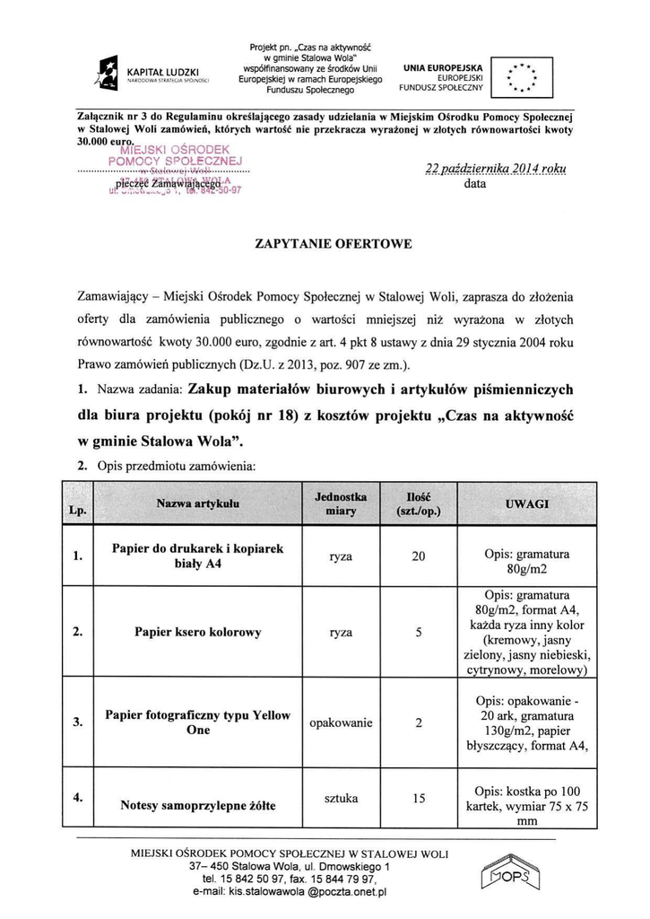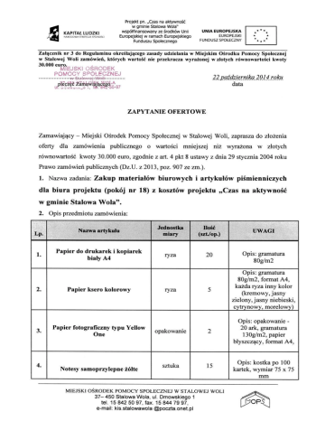 g KAPITAŁ LUDZKI NARODOWA STRATEGIA SPOjNOSO Projekt pn. „Czas na aktywność w gminie Stalowa Wola" współfinansowany ze środków Unii Europejskiej w ramach Europejskiego Funduszu Społecznego UNIA EUROPEJSKA EUROPEJSKI F U N D U S Z SPOŁECZNY Załącznik nr 3 do Regulaminu określającego zasady udzielania w Miejskim Ośrodku Pomocy Społecznej w Stalowej Woli zamówień, których wartość nie przekracza wyrażonej w złotych równowartości kwoty 30.000 euro. MIEJSKI OŚRODEK P O M O C Y SPOŁECZNEJ ,, . w-StaWej-WoW- ., , ^^.P^CfKl^ZUJ.I^.JPjJ.IMfCM d a t a ZAPYTANIE O F E R T O W E Zamawiający - M i e j s k i Ośrodek P o m o c y Społecznej w S t a l o w e j W o l i , z a p r a s z a d o złożenia oferty d l a zamówienia p u b l i c z n e g o o wartości m n i e j s z e j niż wyrażona w złotych równowartość k w o t y 3 0 . 0 0 0 e u r o , z g o d n i e z a r t . 4 p k t 8 u s t a w y z d n i a 2 9 s t y c z n i a 2 0 0 4 r o k u P r a w o zamówień p u b l i c z n y c h ( D z . U . z 2 0 1 3 , p o z . 9 0 7 z e z m . ) . 1. N a z w a z a d a n i a : Zakup materiałów biurowych i artykułów piśmienniczych dla biura projektu (pokój nr 18) z kosztów projektu „Czas na aktywność w gminie Stalowa Wola". 2. O p i s p r z e d m i o t u zamówienia: Lp. 1. Nazwa artykułu Jednostka miary Ilość (szt./op.) UWAGI Papier do drukarek i kopiarek biały A 4 ryza 20 Opis: gramatura 80g/m2 5 Opis: gramatura 80g/m2, format A 4 , każda r y z a i n n y k o l o r (kremowy, jasny zielony, jasny niebieski, cytrynowy, morelowy) opakowanie 2 Opis: opakowanie 2 0 ark, gramatura 130g/m2, papier błyszczący, f o r m a t A 4 , sztuka 15 2. Papier ksero kolorowy 3. Papier fotograficzny typu Yellow One 4. Notesy samoprzylepne żółte ryza MIEJSKI O Ś R O D E K P O M O C Y SPOŁECZNEJ W STALOWEJ WOLI 3 7 - 450 Stalowa Wola, ul. Dmowskiego 1 tel. 15 842 50 97, fax. 15 844 79 97, e-mail: kis.stalowawola ©poczta.onet.pl Opis: kostka p o100 kartek, w y m i a r 75 x 7 5 mm KAPITAŁ LUDZKI NARODOWA SIPATfcCIA SPOINOWI 5. 6. 7. 8. 9. 10. Projekt pn. „Czas na aktywność w gminie Stalowa Wola" współfinansowany ze środków Unii Europejskiej w ramach Europejskiego Funduszu Społecznego Zakładki indeksujące s z e r o k i e neon Zakładki indeksujące typu P E T Kołobrułion w kratkę typu I N T E R D R U K z kolorowymi marginesami Segregator z mechanizmem A4 typu Esselte No.l (kolor niebieski i szary) Koszulki krystaliczne A4 Koszulki groszkowe A4 sztuka sztuka UNIA EUROPEJSKA EUROPEJSKI F U N D U S Z SPOŁECZNY 15 Opis: w y m i a r 20 x 5 0 m m , ilość 4 x 5 0 s z t . 15 O p i s : w y m i a r y 12 x 4 5 m m , ilość 5 x 2 5 s z t . wielorazowe sztuka O p i s : środek: 4 s e k c j e kolorystyczne, otwory do segregatora, p e r f o r a c j a wzdłuż g r z b i e t u , ułatwiająca w y r y w a n i e kartek, twarda oprawa, p o k r y t a błyszcząca folią, i n t r o l i g a t o r s k a , B 5 , 160 kartek sztuka Opis: mechanizm z precyzyjnie dociskającymi szczękami, d w u s t r o n n e , w y m i e n n a etykieta do opisu n a grzbiecie, n a g r z b i e c i e otwór n a palec, n a d o l n y c h krawędziach m e t a l o w e okucia, dwa o t w o r y n a p r z e d n i e j okładce, grzbiet 75 m m ( k o l o r niebieski - 12 sztuk i k o l o r szary - 8 sztuk) 20 opakowanie opakowanie MIEJSKI O Ś R O D E K P O M O C Y S P O Ł E C Z N E J W S T A L O W E J WOLI 3 7 - 450 Stalowa Wola, ul. Dmowskiego 1 tel. 15 842 50 97, fax. 15 844 79 97, e-mail: kis.stalowawola @poczta.onet.pl Opis: krystaliczna folia, opakowanie - 100 szt, O p i s : o t w i e r a n e z góry, przezroczysta struktura folii, antystatyczne, antyrefleksyjne, w z m o c n i o n y pasek z perforacją, 8 KAPITAŁ LUDZKI NARODOWA SIRAtiGIA WOINOŚCI Projekt pn. „Czas na aktywność w gminie Stalowa Wola" współfinansowany ze środków Unii Europejskiej w ramach Europejskiego Funduszu Społecznego UNIA EUROPEJSKA EUROPEJSKI F U N D U S Z SPOŁECZNY o p a k o w a n i e - 1 0 0 szt., 11. Z s z y w k i 24/6 opakowanie 10 Opis: opakowanie 1 0 0 0 szt. 12. Z s z y w k i 24/8 opakowanie 10 Opis: opakowanie 1 0 0 0 szt. 13. S p i n a c z e m e t a l o w e okrągłe G r a n d 50 m m opakowanie 10 Opis: opakowanie 1 0 0 szt. 14. S p i n a c z e m e t a l o w e okrągłe G r a n d 28 m m opakowanie 10 Opis: opakowanie 1 0 0 szt. 20 O p i s : przeźroczysta, bezwonna, pokryta emulsyjnym klejem akrylowym, w z m o c n i o n a powloką taśmy, 18 m m x 1 O y d J Opis: pokryta emulsyjnym klejem akrylowym, odrywana ręcznie, w y m i a r y 50mm x 5 m Opis: d o mocowania plakatów, f o t o g r a f i i , rysunków w s a l a c h konferencyjnych p o d c z a s spotkań i szkoleń, n i e pozostawia plam, o p a k o w a n i e 35 g 15. 16. Taśma b i u r o w a G r a n d - Taśma d w u s t r o n n a G r a n d - sztuka sztuka 17. M a s a mocująca P r i t t opakowanie 3 18. K l e j w sztyfcie A M O S sztuka 12 MIEJSKI O Ś R O D E K P O M O C Y S P O Ł E C Z N E J W S T A L O W E J WOLI 3 7 - 450 Stalowa Wola, ul. Dmowskiego 1 tel. 15 842 50 97, fax. 15 844 79 97, e-mail: kis.stalowawola @poczta.onet.pl O p i s : biały w s z t y f c i e , pojemność 3 5 g s 19. 20. KAPITAŁ LUDZKI NARODOWA STRATfCIA SPÓJNOŚCI Projekt pn. „Czas na aktywność w gminie Stalowa Wola" współfinansowany ze środków Unii Europejskiej w ramach Europejskiego Funduszu Społecznego Deska A4 Bebop z klipem i okładką Leitz ( k o l o r n i e b i e s k i i pomarańczowy) Cienkopis żelowy typu P E N T E L EnerGel B L N 15 (niebieski) UNIA EUROPEJSKA EUROPEJSKI F U N D U S Z SPOŁECZNY sztuka 6 Opis: mocny mechanizm przytrzymujący k a r t k i , mieści 7 5 k a r t e k f o r m a t u A4 (3 s z t u k i - k o l o r niebieski, 3 sztuki k o l o r pomarańczowy) sztuka 12 O p i s : z płynnym t u s z e m żelowym 21. Cienkopis żelowy typu P E N T E L EnerGel B L N 15 (czarny) sztuka 6 O p i s : z płynnym t u s z e m żelowym 22. Ołówek automatyczny P E N T E L A315 sztuka 3 Opi