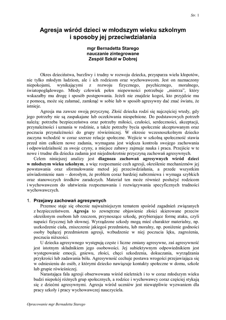 Str. 1 Agresja wśród dzieci w młodszym wieku szkolnym i sposoby jej przeciwdziałania mgr Bernadetta Starego nauczanie zintegrowane Zespół Szkół w Dobrej Okres dzieciństwa, burzliwy i trudny w rozwoju dziecka, przysparza wielu kłopotów, nie tylko młodym ludziom, ale i ich rodzicom oraz wychowawcom. Jest on naznaczony niepokojami, wynikającymi z rozwoju fizycznego, psychicznego, moralnego, światopoglądowego. Młody człowiek pełen niepewności potrzebuje „mistrza”, który wskazałby mu drogę i sposób postępowania. Jeżeli nie znajdzie kogoś, kto przyjdzie mu z pomocą, może się załamać, zamknąć w sobie lub w sposób agresywny dać znać światu, że istnieje. Agresja ma zawsze swoją przyczynę. Złość dziecka rodzi się najczęściej wtedy, gdy jego potrzeby nie są zaspakajane lub oczekiwania niespełnione. Do podstawowych potrzeb należą: potrzeba bezpieczeństwa oraz potrzeby miłości, czułości, serdeczności, akceptacji, przynależności i uznania w rodzinie, a także potrzeby bycia społecznie akceptowanym oraz poczucia przynależności do grupy rówieśniczej. W okresie wczesnoszkolnym dziecko zaczyna wchodzić w coraz szersze relacje społeczne. Wejście w szkolną społeczność stawia przed nim całkiem nowe zadania, wymagana jest większa kontrola swojego zachowania i odpowiedzialność za swoje czyny, a miejsce zabawy zajmuje nauka i praca. Przejście w te nowe i trudne dla dziecka zadania jest niejednokrotnie przyczyną zachowań agresywnych. Celem niniejszej analizy jest diagnoza zachowań agresywnych wśród dzieci w młodszym wieku szkolnym, a więc rozpoznanie cech agresji, określenie mechanizmów jej powstawania oraz sformułowanie metod jej przeciwdziałania, a przede wszystkim uświadomienie nam – dorosłym, że problem coraz bardziej nabrzmiewa i wymaga szybkich oraz stanowczych środków zaradczych. Materiał ten może również posłużyć rodzicom i wychowawcom do ułatwienia rozpoznawania i rozwiązywania specyficznych trudności wychowawczych. 1. Przejawy zachowań agresywnych Przemoc staje się obecnie najważniejszym tematem spośród zagadnień związanych z bezpieczeństwem. Agresja to zewnętrzne objawienie złości skierowane przeciw określonym osobom lub rzeczom, przynoszące szkodę, przybierające formę ataku, czyli napaści fizycznej lub słownej. Wyrządzone szkody mogą mieć charakter materialny, np. uszkodzenie ciała, zniszczenie jakiegoś przedmiotu, lub moralny, np. poniżenie godności osoby będącej przedmiotem agresji, wzbudzenie w niej poczucia lęku, zagrożenia, poczucia niższości. U dziecka agresywnego występują częste i liczne zmiany agresywne, zaś agresywność jest istotnym składnikiem jego osobowości. Jej subiektywnym odpowiednikiem jest występowanie emocji, gniewu, złości, chęci szkodzenia, dokuczania, wyrządzania przykrości lub zadawania bólu. Agresywność cechuje postawa wrogości przejawiająca się w odniesieniu do osób, z którymi dziecko nawiązuje kontakty społeczne w domu, szkole lub grupie rówieśniczej. Narastająca fala agresji obserwowana wśród nieletnich i to w coraz młodszym wieku budzi niepokój różnych grup społecznych, a rodzice i wychowawcy coraz częściej stykają się z dziećmi agresywnymi. Agresja wśród uczniów jest niewątpliwie wyzwaniem dla pracy szkoły i pracy wychowawczej nauczyciela. Opracowanie mgr Bernadetta Starego Str. 2 W szkole (i poza nią) coraz częściej spotyka się uczniów, którzy przejawiają zachowania agresywne w formie agresji fizycznej, bądź też słownej. Przejawem agresji fizycznej mogą być pojedyncze zachowania, takie jak wszczynanie przez ucznia bójki, uderzenia, kopnięcia lub ukłucie kolegi, szarpanie, podstawianie nogi oraz reakcje mimiczne, np. wykrzywianie się, przedrzeźnianie. Wymienione zachowania to tzw. agresja fizyczna bezpośrednia skierowana na kogoś lub coś. Spotykamy się również z tzw. agresją fizyczną pośrednią, której objawami są: przeszkadzanie komuś w wykonywaniu jakiejś czynności, zakłócanie spokoju, sporządzanie obraźliwych rysunków, chowanie lub psucie przedmiotów należących do określonej osoby. Obiektem, na który może być skierowana agresja fizyczna, nie jest tylko osoba, lecz wszystkie inne przedmioty z otoczenia. Wówczas ujawnia się ona uszkadzaniem oraz niszczeniem mienia społecznego i prywatnego, dewastacją przyrody, znęcaniem się nad zwierzętami, łamaniem roślin lub kwiatów. Agresja słowna przejawia się w inicjowaniu kłótni, złośliwych plotek, pomówień, grożeniu, straszeniu, przezywaniu. Są to bardzo częste zachowania występujące w grupach rówieśniczych, raniące godność osoby będącej przedmiotem agresji, narażają ją na ośmieszenie i upokorzenie. Agresją słowną jest również rozpowszechnianie nieprawdziwych informacji o danej osobie: plotkowanie, obmawianie, wydawanie krzywdzących opinii. W młodszym wieku szkolnym często spotyka się specyficzny typ zachowań zwanych skarżeniem wypływającym nie z troski o przestrzeganie zasad współżycia, lecz mającym na celu zaszkodzenie określonej osobie w nadziei, że spotkają ją przykre konsekwencje. Zachowanie agresywne może przejawiać się również w słownym zachęcaniu innych do agresji, tj. podżeganiu do ataku fizycznego lub słownego. Zachowanie ucznia agresywnego cechuje brak zdyscyplinowania, naruszanie zasad regulaminu szkolnego oraz obowiązujących norm współżycia w danej społeczności. Znaczna ruchliwość, agresywność, skłonność do szybkiego, bardzo impulsywnego reagowania jest źródłem agresywnego zachowania dziecka, które nie potrafi jeszcze kontrolować emocji i nie panuje nad ich wpływem na swoje zachowanie. Niski jest też poziom dojrzałości społecznej, przez co wychowanek łatwo popada w konflikty z rówieśnikami. 2. Przyczyny agresji Często zastanawiamy się, co jest powodem zachowań agresywnych wśród dzieci. Dla wyjaśnienia