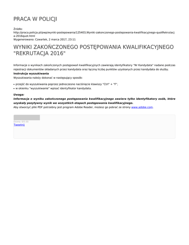 PRACA W POLICJI Źródło: http://praca.policja.pl/pwp/wyniki-postepowania/125403,Wyniki-zakonczonego-postepowania-kwalifikacyjnego-quotRekrutacj a-2016quot.html Wygenerowano: Czwartek, 2 marca 2017, 23:11 WYNIKI ZAKOŃCZONEGO POSTĘPOWANIA KWALIFIKACYJNEGO "REKRUTACJA 2016" Informacje o wynikach zakończonych postępowań kwalifikacyjnych zawierają identyfikatory "Nr Kandydata" nadane podczas rejestracji dokumentów składanych przez kandydata oraz łączną liczbę punktów uzyskanych przez kandydata do służby. Instrukcja wyszukiwania Wyszukiwania należy dokonać w następujący sposób: ● przejść do wyszukiwania poprzez jednoczesne naciśnięcie klawiszy "Ctrl" + "F", ● w okienku "wyszukiwanie" wpisać identyfikator kandydata. Uwaga: Informacja o wyniku zakończonego postępowania kwalifikacyjnego zawiera tylko identyfikatory osób, które uzyskały pozytywny wynik we wszystkich etapach postępowania kwalifikacyjnego. Aby otworzyć pliki PDF potrzebny jest program Adobe Reader, możesz go pobrać ze strony www.adobe.com. Ocena: 0/5 (0) Tweetnij