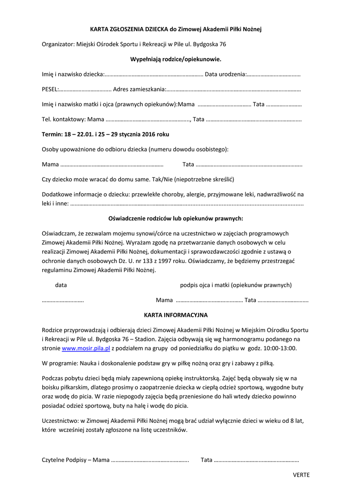 KARTA ZGŁOSZENIA DZIECKA do Zimowej Akademii Piłki Nożnej Organizator: Miejski Ośrodek Sportu i Rekreacji w Pile ul. Bydgoska 76 Wypełniają rodzice/opiekunowie. Imię i nazwisko dziecka:………………………………………………………… Data urodzenia:……………………………… PESEL:…………………………….. Adres zamieszkania:……………………………………………………………………………… Imię i nazwisko matki i ojca (prawnych opiekunów):Mama ……………………………… Tata …………………… Tel. kontaktowy: Mama ……………………………………………….., Tata ………………………………………………………. Termin: 18 – 22.01. i 25 – 29 stycznia 2016 roku Osoby upoważnione do odbioru dziecka (numeru dowodu osobistego): Mama …………………………………………………………… Tata …………………………………...……………………….. Czy dziecko może wracać do domu same. Tak/Nie (niepotrzebne skreślić) Dodatkowe informacje o dziecku: przewlekłe choroby, alergie, przyjmowane leki, nadwrażliwość na leki i inne: ………………………………………………………………….......................................................................... Oświadczenie rodziców lub opiekunów prawnych: Oświadczam, że zezwalam mojemu synowi/córce na uczestnictwo w zajęciach programowych Zimowej Akademii Piłki Nożnej. Wyrażam zgodę na przetwarzanie danych osobowych w celu realizacji Zimowej Akademii Piłki Nożnej, dokumentacji i sprawozdawczości zgodnie z ustawą o ochronie danych osobowych Dz. U. nr 133 z 1997 roku. Oświadczamy, że będziemy przestrzegać regulaminu Zimowej Akademii Piłki Nożnej. data ………………………. podpis ojca i matki (opiekunów prawnych) Mama ……………………………………… Tata ……………………………. KARTA INFORMACYJNA Rodzice przyprowadzają i odbierają dzieci Zimowej Akademii Piłki Nożnej w Miejskim Ośrodku Sportu i Rekreacji w Pile ul. Bydgoska 76 – Stadion. Zajęcia odbywają się wg harmonogramu podanego na stronie www.mosir.pila.pl z podziałem na grupy od poniedziałku do piątku w godz. 10:00-13:00. W programie: Nauka i doskonalenie podstaw gry w piłkę nożną oraz gry i zabawy z piłką. Podczas pobytu dzieci będą miały zapewnioną opiekę instruktorską. Zajęć będą obywały się w na boisku piłkarskim, dlatego prosimy o zaopatrzenie dziecka w ciepłą odzież sportową, wygodne buty oraz wodę do picia. W razie niepogody zajęcia będą przeniesione do hali wtedy dziecko powinno posiadać odzież sportową, buty na halę i wodę do picia. Uczestnictwo: w Zimowej Akademii Piłki Nożnej mogą brać udział wyłącznie dzieci w wieku od 8 lat, które wcześniej zostały zgłoszone na listę uczestników. Czytelne Podpisy – Mama ……………………………………………. Tata ………………………………………………… VERTE ZGODA NA WYKORZYSTANIE WIZERUNKU Miejscowość i data ..................................... Imię i nazwisko matki i ojca (prawnych opiekunów):Mama ……………………………… Tata …………………… Imię, Nazwisko Dziecka ……………………………………...……………………………………. Wyrażam zgodę na nieodpłatne wykorzystanie wizerunku mojego dziecka. Zgoda obejmuje zdjęcia, filmy oraz ich obróbkę. Zdjęcia będą wykorzystane na stronie internetowej www.pile.pl oraz www.mosir.pila.pl i w materiałach promocyjnych wydawanych przez Urząd Miasta Piły oraz Miejski Ośrodek Sportu i Rekreacji w Pile. Czytelne Podpisy – Mama ……………………………………………. Tata …………………………………………………