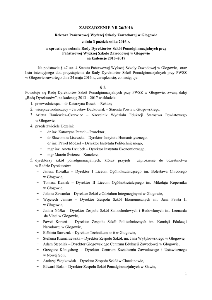 ZARZĄDZENIE NR 26/2016 Rektora Państwowej Wyższej Szkoły Zawodowej w Głogowie z dnia 3 października 2016 r. w sprawie powołania Rady Dyrektorów Szkół Ponadgimnazjalnych przy Państwowej Wyższej Szkole Zawodowej w Głogowie na kadencję 2013–2017 Na podstawie § 47 ust. 4 Statutu Państwowej Wyższej Szkoły Zawodowej w Głogowie, oraz listu intencyjnego dot. przystąpienia do Rady Dyrektorów Szkół Ponadgimnazjalnych przy PWSZ w Głogowie zawartego dnia 24 maja 2016 r., zarządza się, co następuje: § 1. Powołuje się Radę Dyrektorów Szkół Ponadgimnazjalnych przy PWSZ w Głogowie, zwaną dalej „Radą Dyrektorów”, na kadencję 2013 – 2017 w składzie: 1. przewodnicząca – dr Katarzyna Rusak – Rektor; 2. wiceprzewodniczący – Jarosław Dudkowiak – Starosta Powiatu Głogowskiego; 3. Arletta Haniewicz–Czerwiec – Naczelnik Wydziału Edukacji Starostwa Powiatowego w Głogowie, 4. przedstawiciele Uczelni: dr inż. Katarzyna Pantoł – Prorektor , dr Sławomira Lisewska – Dyrektor Instytutu Humanistycznego, dr inż. Paweł Modzel – Dyrektor Instytutu Politechnicznego, mgr inż. Aneta Dziubek – Dyrektor Instytutu Ekonomicznego, mgr Marcin Świercz – Kanclerz, 5. dyrektorzy szkół ponadgimnazjalnych, którzy przyjęli zaproszenie do uczestnictwa w Radzie Dyrektorów: Janusz Kosałka – Dyrektor I Liceum Ogólnokształcącego im. Bolesława Chrobrego w Głogowie, Tomasz Kuziak – Dyrektor II Liceum Ogólnokształcącego im. Mikołaja Kopernika w Głogowie, Jolanta Zawartka – Dyrektor Szkół z Odziałam Integracyjnymi w Głogowie, Wojciech Janisio – Dyrektor Zespołu Szkół Ekonomicznych im. Jana Pawła II w Głogowie, Janina Nóżka – Dyrektor Zespołu Szkół Samochodowych i Budowlanych im. Leonarda da Vinci w Głogowie, Paweł Korzeń – Dyrektor Zespołu Szkół Politechnicznych im. Komisji Edukacji Narodowej w Głogowie, Elżbieta Sawczak – Dyrektor Technikum nr 6 w Głogowie, Stefania Kramarzewska – Dyrektor Zespołu Szkół. im. Jana Wyżykowskiego w Głogowie, Adam Stępniak – Dyrektor Głogowskiego Centrum Edukacji Zawodowej w Głogowie, Grzegorz Königsberg – Dyrektor Centrum Kształcenia Zawodowego i Ustawicznego w Nowej Soli, Andrzej Wojtkowiak – Dyrektor Zespołu Szkół w Chocianowie, Edward Boks – Dyrektor Zespołu Szkół Ponadgimnazjalnych w Sławie, 1 Zbigniew Gołębiowski – Dyrektor Zespołu Szkół im. Narodów Zjednoczonej Europy w Polkowicach. § 2. 1. Rada Dyrektorów jest ciałem opiniodawczym i doradczym Rektora PWSZ w Głogowie. Zasadniczym celem działania Rady Dyrektorów jest zbliżenie środowiska szkolnego z regionu głogowskiego i środowiska akademickiego Uczelni oraz wspieranie rozwoju dydaktycznego, naukowego, materialnego i organizacyjnego Uczelni i szkół ponadgimnazjalnych. 2. Do zadań Rady Dyrektorów należy w szczególności: 1) doradzanie w zakresie podnoszenia efektywności i atrakcyjności kształcenia oraz dalszych 2) 3) 4) 5) 6) 1. 2. 3. 4. 5. 6. kierunków rozwoju Uczelni; przybliżenie uczniów do środowiska akademickiego przez organizowanie dla uczniów m.in. wykładów, warsztatów, a także imprez kulturalnych i sportowych; inicjowanie działań mających na celu zachęcenie wybitnie uzdolnionych uczniów do uczestnictwa w zajęciach prowadzonych w ramach studiów pierwszego stopnia; proponowanie możliwości dopasowania oferty edukacyjnej Uczelni w odniesieniu do oferty dydaktycznej szkół ponadgimnazjalnych (kierunki studiów i specjalności kształcenia); inicjowanie działań zmierzających do zacieśnienia współpracy ze szkołami ponadgimnazjalnymi (zapewnienie dostępu do praktycznego przygotowania zawodowego studentów kierunków nauczycielskich); wskazywanie obszarów aktualizacji strategii rozwoju Uczelni. § 3. Pracami Rady Dyrektorów kieruje przewodniczący, który organizuje pracę, w tym w szczególności: 1) zwołuje posiedzenia Rady; 2) ustala harmonogram działań na dany rok akademicki. Rada Dyrektorów obraduje w obecności co najmniej 1/3 swojego składu i spotyka się nie rzadziej niż dwa razy w ciągu roku akademickiego. Dyrektor szkoły może być reprezentowany przez swojego zastępcę. W posiedzeniach Rady Dyrektorów oprócz jej członków mogą uczestniczyć inni pracownicy Uczelni i zaproszeni goście, jeśli przedmiot sprawy tego wymaga. O miejscu, terminie i porządku obrad posiedzeń członkowie Rady Dyrektorów powiadamiani są z dwutygodniowym wyprzedzeniem. Posiedzenia Rady Dyrektorów są protokołowane. Protokoły przyjmowane są z ewentualnymi poprawkami na początku każdego kolejnego posiedzenia. Obsługę merytoryczną, organizacyjno-prawną, techniczną i kancelaryjno-biurową zapewnia Biuro Rektora. § 4. Wnioski i opinie Rady Dyrektorów Rektor przedkłada Senatowi i Konwentowi PWSZ w Głogowie. § 5. Zarządzenie wchodzi w życie z dniem podpisania. 2 3