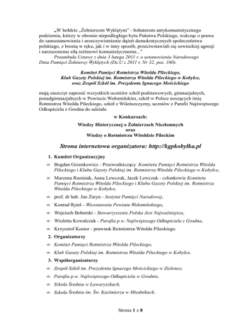 „W hołdzie „Żołnierzom Wyklętym” - bohaterom antykomunistycznego podziemia, którzy w obronie niepodległego bytu Państwa Polskiego, walcząc o prawa do samostanowienia i urzeczywistnienie dążeń demokratycznych społeczeństwa polskiego, z bronią w ręku, jak i w inny sposób, przeciwstawiali się sowieckiej agresji i narzuconemu siłą reżimowi komunistycznemu...” Preambuła Ustawy z dnia 3 lutego 2011 r. o ustanowieniu Narodowego Dnia Pamięci Żołnierzy Wyklętych (Dz.U z 2011 r. Nr 32, poz. 160). Komitet Pamięci Rotmistrza Witolda Pileckiego, Klub Gazety Polskiej im. Rotmistrza Witolda Pileckiego w Kobyłce, oraz Zespół Szkół im. Prezydenta Ignacego Mościckiego mają zaszczyt zaprosić wszystkich uczniów szkół podstawowych, gimnazjalnych, ponadgimnazjalnych w Powiecie Wołomińskim, szkół w Polsce noszących imię Rotmistrza Witolda Pileckiego, szkół z Wileńszczyzny, uczniów z Parafii Najświętszego Odkupiciela z Grodna do udziału w Konkursach: Wiedzy Historycznej o Żołnierzach Niezłomnych oraz Wiedzy o Rotmistrzu Witoldzie Pileckim Strona internetowa organizatora: http://kgpkobyłka.pl 1. Komitet Organizacyjny • Bogdan Grzenkowicz - Przewodniczący Komitetu Pamięci Rotmistrza Witolda Pileckiego i Klubu Gazety Polskiej im. Rotmistrza Witolda Pileckiego w Kobyłce, • Marzena Rusiniak, Anna Lewczuk, Jacek Lewczuk - członkowie Komitetu Pamięci Rotmistrza Witolda Pileckiego i Klubu Gazety Polskiej im. Rotmistrza Witolda Pileckiego w Kobyłce, • prof. dr hab. Jan Żaryn - Instytut Pamięci Narodowej, • Konrad Rytel - Wicestarosta Powiatu Wołomińskiego, • Wojciech Boberski - Stowarzyszenie Polska Jest Najważniejsza, • Wioletta Kowalczuk - Parafia p.w. Najświętszego Odkupiciela z Grodna, • Krzysztof Kosior - prawnuk Rotmistrza Witolda Pileckiego. 2. Organizatorzy • Komitet Pamięci Rotmistrza Witolda Pileckiego, • Klub Gazety Polskiej im. Rotmistrza Witolda Pileckiego w Kobyłce. 3. Współorganizatorzy • Zespół Szkół im. Prezydenta Ignacego Mościckiego w Zielonce, • Parafia p.w. Najświętszego Odkupiciela w Grodnie, • Szkoła Średnia w Ławaryszkach, • Szkoła Średnia im. Św. Kazimierza w Miednikach. Strona 1 z 8 4. Patronat Honorowy • Arcybiskup Henryk Hoser - Ordynariusz Diecezji Warszawsko-Praskiej, • Ksiądz Dziekan Jan Andrzejewski - Proboszcz parafii św. Trójcy w Kobyłce, • Zofia Pilecka-Optułowicz - córka Rotmistrza Witolda Pileckiego, • Andrzej Pilecki - syn Rotmistrza Witolda Pileckiego, • Janusz Wojciechowski - poseł do Parlamentu Europejskiego, • Zdzisław Krasnodębski - poseł do Parlamentu Europejskiego, • Mariusz Błaszczak - poseł na Sejm RP, • Starosta Powiatu Wołomińskiego, • Światowy Związek Żołnierzy Armii Krajowej, • Instytut Pamięci Narodowej, • Stowarzyszenie Łagierników Żołnierzy Armii Krajowej. 5. Patronaty • Międzynarodowy Motocyklowy Rajd Katyński, • Fundacja „Łączka”, • Fundacja „Polskiego Państwa Podziemnego”, • Stowarzyszenie Pamięci Powstania Warszawskiego 1944, • Stowarzyszenie Pamięci Żołnierzy Wyklętych, • Stowarzyszenie Polska Jest Najważniejsza, • Forteca, • Stowarzyszenie Auschwitz Memento, • Muzeum Niepodległości, • Wrota Bitwy Warszawskiej Ossów 1920. 6. Patronat medialny • Gazety Polska Codziennie, • Niezależna.pl, • Patria, • W Sieci Historii, • Życie Powiatu na Mazowszu, • Blogpress. 7. Uczestnicy • Uczniowie szkół podstawowych kl. I-III, • Uczniowie szkół podstawowych kl. IV-VI, • Uczniowie szkół gimnazjalnych kl. I- III, Strona 2 z 8 • Uczniowie szkół ponadgimnazjalnych, • Uczniowie szkół średnich (Wileńszczyzna) kl. I-III, • Uczniowie szkół średnich (Wileńszczyzna) kl. IV-VI, • Uczniowie szkół średnich (Wileńszczyzna) kl. VII- I, • Uczniowie szkół średnich (Wileńszczyzna) kl. X-XII, • Parafia p.w. Najświętszego Odkupiciela w Grodnie na Białorusi kl. VII- IX, • Parafia p.w. Najświętszego Odkupiciela w Grodnie na Białorusi kl. X- XI. 8. Forma Konkursu • Dla uczniów szkół podstawowych kl. I-III oraz szkół średnich (Wileńszczyzna) kl. I-III, • Dla uczniów szkół podstawowych kl. IV-VI oraz szkół średnich (Wileńszczyzna) kl. IV-VI, • Dla uczniów szkół gimnazjalnych kl. I-III oraz szkół średnich (Wileńszczyzna) kl. VII-IX, uczniów z Parafii p.w. Najświętszego Odkupiciela z Grodna kl. VII- IX, • Dla uczniów szkół ponadgimnazjalnych oraz szkół średnich (Wileńszczyzna) kl. X-XII, uczniów z Parafii p.w. Najświętszego Odkupiciela z Grodna kl. X- XI. 9. Cele Konkursu 9.1. Upamiętnienie Narodowego Dnia Pamięci Żołnierzy Niezłomnych. Kultywowanie wartości, ideałów i postaw żołnierzy Polskiego Państwa Podziemnego po II wojnie światowej. 9.2. Kształtowanie postaw patriotycznych młodzieży poprzez propagowanie i pogłębianie wiedzy o działalności drugiej konspiracji w latach 1944-1963. 9.3. Upowszechnianie wśród uczniów wiedzy o żołnierzach Wojska Polskiego, którzy walczyli o niepodległość Polski po II wojnie światowej. 9.4. Budzenie i utrwalanie dumy z dziedzictwa narodowego. 9.5. Zainteresowanie uczniów historią naszego narodu oraz budzenie w nich poczucia dumy z bycia Polakiem. 9.6. Doskonalenie umiejętności samodzielnego poszukiwania, gromadzenia i selekcjonowania informacji w różnych źródłach. 9.7. Upowszechnianie wiedzy historycznej istotnej dla tożsamości narodowej, regionalnej oraz kształtowania postaw obywatelskich i patriotycznych, 9.8. Udowodnienie poczucia byciem Polakiem na Kresach, 9.9. Poczucie bycia Polakiem poza granicami Polski. 10. Organizacja Konkursu 10.1. Przedmiotem Konkursu jest przygotowanie pracy na temat Żołnierzy Niezłomnych lub Rotmistrza Witolda Pileckiego. 10.2. Tematem pracy może być postać wybranego dowódcy, żołnierza, oddziału, formacji zbrojnej. Strona 3 z 8 10.3. Praca może również dotyczyć wybranego wydarzenia