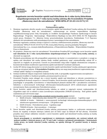 Regulamin zwrotu kosztów opieki nad dzieckiem do 6 roku życia/dzieckiem niepełnosprawnym do 7 roku życia/osobą zależną dla Uczestników Projektu „Skuteczny start do zatrudnienia” WND-RPSL.07.01.03-24-0172/15 1. 2. 3. 4. 5. 6. 7. 8. 9. §1 Postanowienia ogólne Niniejszy regulamin określa zasady zwrotu kosztów opieki nad dzieckiem*/osobą zależną dla Uczestników Projektu „Skuteczny start do zatrudnienia”, realizowanego na terenie województwa śląskiego współfinansowanego przez Unię Europejską ze środków Europejskiego Funduszu Społecznego w ramach Regionalnego Programu Operacyjnego Województwa Śląskiego na lata 2014-2020, Oś VII: Regionalny rynek pracy, Działanie 7.1: Aktywne formy przeciwdziałania bezrobociu, Poddziałanie 7.1.3 Poprawa zdolności do zatrudnienia osób poszukujących pracy i pozostających bez zatrudnienia Niniejszy regulamin, ustalony zostaje w oparciu o umowę o dofinansowanie projektu „Skuteczny start do zatrudnienia” RPSL.07.01.03-24-0172/15-00, zwaną dalej Umową, zawartą pomiędzy Navigator International Sp. z o.o., zwanym dalej Beneficjentem, a Województwem Śląskim – Wojewódzkim Urzędem Pracy w Katowicach. W projekcie „Skuteczny start do zatrudnienia” Uczestnikom Projektu/UP przysługuje zwrot kosztów opieki nad dzieckiem do 6 roku życia/dzieckiem niepełnosprawnym do 7 roku życia/osobą zależną za obecność na zajęciach. Wydatek przewidziany jest dla przypadków pojawienia się barier w uczestnictwie w projekcie z uwagi na opiekę nad dzieckiem lub osobą zależną kiedy rozkład godzinowy zajęć uniemożliwiłby udział UP w zajęciach ze względu na powyższe. Czasem na przeszkodzie stają także względy ekonomiczne związane z kosztem lub brakiem możliwości zapewnienia opieki nad dziećmi*/osobami zależnymi. Liczba UP, którzy mogą skorzystać ze zwrotu kosztów opieki nad dzieckiem*/osobą zależną jest ograniczona i może go otrzymać jedynie 5 Uczestników Projektu, którzy nie mają innej możliwości zapewnienia tego rodzaju opieki i będący w szczególnej sytuacji. Istnieje możliwość objęcia wsparciem większej liczby osób, w przypadku wygenerowania oszczędności i dostępności środków w budżecie projektu, przeznaczonych na ten cel. Uczestnik Projektu może ubiegać się o zwrot kosztów opieki nad dzieckiem w okresie uczestnictwa w poszczególnych formach wsparcia w ramach Projektu. Zwrot kosztów opieki nad dzieckiem*/osobą zależną przysługuje w przypadku uczestnictwa w Indywidualnych planach działań IPD + poradnictwo zawodowe, Szkoleniu z nowoczesnych technologii informacyjno-komunikacyjnych (ICT) zakończonym egzaminem zewnętrznym, Stażu zawodowym, Pośrednictwie pracy. Zwrot kosztów opieki nad dzieckiem/osobą zależną za udział w zajęciach wynosi maksymalnie 20 zł/godzina zajęć zaś za udział w stażu zawodowym maksymalnie 2500,00 zł/miesiąc. Ilość godzin opieki uzależniona jest od trwania zajęć. W związku z powyższym maksymalna wysokość zwrotu kosztów opieki wynosi: 80,00 zł brutto - Indywidualny plan działań IPD + poradnictwo zawodowe - 4 godziny zajęć 2400,00 zł brutto - Szkolenie z nowoczesnych technologii informacyjno-komunikacyjnych (ICT) zakończone egzaminem zewnętrznym - 120 godzin zajęć 60,00 zł brutto - Pośrednictwo pracy - 3 godziny zajęć 7500,00 zł brutto - Staż zawodowy – 3 miesiące Zwrot kosztów opieki nad dzieckiem*/osobą zależną przyznawany będzie w rozliczeniu miesięcznym. Kwota do wypłaty w danym miesiącu zależna jest od ilości zajęć na których UP był obecny. Uczestnik projektu musi złożyć oddzielne wnioski o zwrot kosztów opieki nad dzieckiem*/osobą zależną na każdą formę wsparcia Zwrot przysługuje w wysokości uzgodnionej w niniejszym regulaminie, nie wyższej jednak niż połowa zasiłku, o którym mowa w art. 72 ust.1 pkt 1 ustawy o promocji zatrudnienia i instytucjach rynku pracy, na każde dziecko*/osobę zależną, na opiekę którego UP poniósł koszty w danym miesiącu. 10. Zwrotowi podlegać będą koszty opieki nad dzieckiem*/osobą zależną w wysokości odpowiadającej faktycznym i udokumentowanym wydatkom, jednak do kwoty nie wyższej niż określona w §1 pkt. 7. 11. Za osobę zależną uznaje się osobę wymagającą ze względu na stan zdrowia lub wiek stałej opieki, połączoną więzami rodzinnymi lub powinowactwem z osobą wnioskującą lub pozostającą z nią we wspólnym gospodarstwie domowym. (Art. 2 ust. 1 pkt. 21 Ustawy o promocji zatrudnienia i instytucjach rynku pracy). 12. UP ma prawo do uzyskania zwrotu kosztów opieki nad jednym dzieckiem*/jedną osobą zależną. W wyjątkowych przypadkach UP może otrzymać zwrot kosztów opieki nad większą liczbą dzieci*/osób zależnych, pod warunkiem spełnienia wszystkich warunków określonych w niniejszych zasadach oraz dostępności środków w budżecie projektu, przeznaczonych na ten cel. §2 Przyznanie prawa do zwrotu kosztów opieki nad dzieckiem*/osobą zależną Informacje ogólne 1. 2. Refundacji podlegają koszty: a) Opieki nad dzieckiem* (dziećmi) poniesione z tytułu: koszt opłaty za pobyt dziecka w przedszkolu, żłobku klubie dziecięcym lub innej instytucji uprawnionej do sprawowania opieki w czasie korzystania ze wsparcia w ramach Projektu, w tym także koszt wyżywienia dziecka, opłaty za opiekę nad dzieckiem* (dziećmi) świadczoną w ramach umowy cywilnoprawnej zawartej z osobą fizyczną, która nie jest spokrewniona z zleceniodawcą ani z dzieckiem* zleceniodawcy (dotyczy następujących stopni pokrewieństwa: rodzic, babcia, dziadek, rodzeństwo) i nie zamieszkuje pod tym samym adresem, co zleceniodawca. b) Opieki nad osobą zależną poniesione z tytułu: opłaty za opiekę nad osobą zależną świadczoną w ramach umowy cywilnoprawnej zawartej z osobą fizyczną, która nie jest spokrewniona ze zleceniodawcą ani osobą zależną (dotyczy następujących stopni pokrewieństwa: rodz