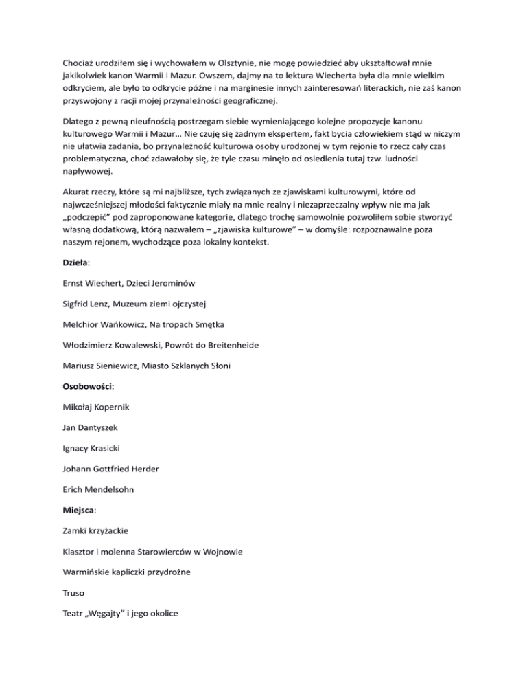 Chociaż urodziłem się i wychowałem w Olsztynie, nie mogę powiedzieć aby ukształtował mnie jakikolwiek kanon Warmii i Mazur. Owszem, dajmy na to lektura Wiecherta była dla mnie wielkim odkryciem, ale było to odkrycie późne i na marginesie innych zainteresowań literackich, nie zaś kanon przyswojony z racji mojej przynależności geograficznej. Dlatego z pewną nieufnością postrzegam siebie wymieniającego kolejne propozycje kanonu kulturowego Warmii i Mazur… Nie czuję się żadnym ekspertem, fakt bycia człowiekiem stąd w niczym nie ułatwia zadania, bo przynależność kulturowa osoby urodzonej w tym rejonie to rzecz cały czas problematyczna, choć zdawałoby się, że tyle czasu minęło od osiedlenia tutaj tzw. ludności napływowej. Akurat rzeczy, które są mi najbliższe, tych związanych ze zjawiskami kulturowymi, które od najwcześniejszej młodości faktycznie miały na mnie realny i niezaprzeczalny wpływ nie ma jak „podczepić” pod zaproponowane kategorie, dlatego trochę samowolnie pozwoliłem sobie stworzyć własną dodatkową, którą nazwałem – „zjawiska kulturowe” – w domyśle: rozpoznawalne poza naszym rejonem, wychodzące poza lokalny kontekst. Dzieła: Ernst Wiechert, Dzieci Jerominów Sigfrid Lenz, Muzeum ziemi ojczystej Melchior Wańkowicz, Na tropach Smętka Włodzimierz Kowalewski, Powrót do Breitenheide Mariusz Sieniewicz, Miasto Szklanych Słoni Osobowości: Mikołaj Kopernik Jan Dantyszek Ignacy Krasicki Johann Gottfried Herder Erich Mendelsohn Miejsca: Zamki krzyżackie Klasztor i molenna Starowierców w Wojnowie Warmińskie kapliczki przydrożne Truso Teatr „Węgajty” i jego okolice Wydarzenia: Ok. VI – V w. p. n. e. – zasiedlenie dzisiejszej Warmii przez plemiona Pruskie 1226 r. – zaproszenie przez Konrada Mazowieckiego na swoje ziemie Zakonu Szpitala Najświętszej Maryi Panny Domu Niemieckiego w Jerozolimie 1410 r. – bitwa pod Grunwaldem 1525 r. – powstanie Prus Książęcych 1807 – przemarsze wojsk napoleońskich przez tereny dzisiejszych Warmii i Mazur 1944 – nieudany zamach na Hitlera w Wilczym Szańcu 1945 – przyłączenie Warmii i Mazur do Polski Dodatkowo Zjawiska kulturowe: Pantomima Olsztyńska Pracownia Środowisko „Borussi” Środowisko „Portretu” szczególnie pierwsza ekipa, która zakładała pismo Stowarzyszenie „Tratwa”