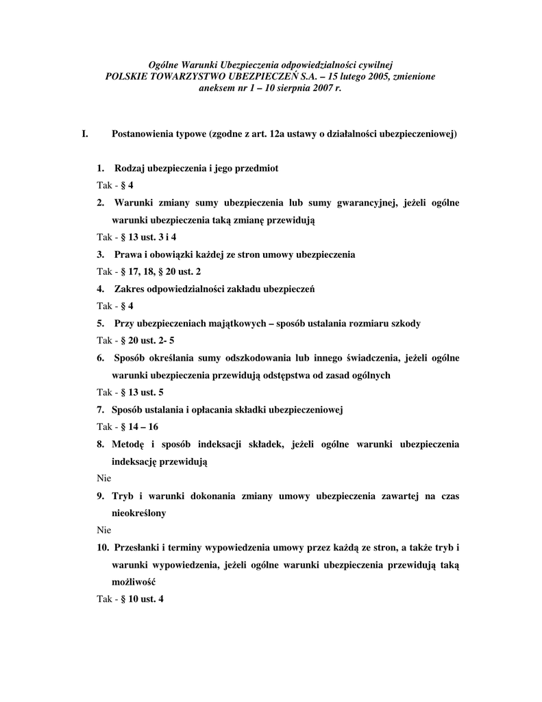 Ogólne Warunki Ubezpieczenia odpowiedzialności cywilnej POLSKIE TOWARZYSTWO UBEZPIECZEŃ S.A. – 15 lutego 2005, zmienione aneksem nr 1 – 10 sierpnia 2007 r. I. Postanowienia typowe (zgodne z art. 12a ustawy o działalności ubezpieczeniowej) 1. Rodzaj ubezpieczenia i jego przedmiot Tak - § 4 2. Warunki zmiany sumy ubezpieczenia lub sumy gwarancyjnej, jeżeli ogólne warunki ubezpieczenia taką zmianę przewidują Tak - § 13 ust. 3 i 4 3. Prawa i obowiązki każdej ze stron umowy ubezpieczenia Tak - § 17, 18, § 20 ust. 2 4. Zakres odpowiedzialności zakładu ubezpieczeń Tak - § 4 5. Przy ubezpieczeniach majątkowych – sposób ustalania rozmiaru szkody Tak - § 20 ust. 2- 5 6. Sposób określania sumy odszkodowania lub innego świadczenia, jeżeli ogólne warunki ubezpieczenia przewidują odstępstwa od zasad ogólnych Tak - § 13 ust. 5 7. Sposób ustalania i opłacania składki ubezpieczeniowej Tak - § 14 – 16 8. Metodę i sposób indeksacji składek, jeżeli ogólne warunki ubezpieczenia indeksację przewidują Nie 9. Tryb i warunki dokonania zmiany umowy ubezpieczenia zawartej na czas nieokreślony Nie 10. Przesłanki i terminy wypowiedzenia umowy przez każdą ze stron, a także tryb i warunki wypowiedzenia, jeżeli ogólne warunki ubezpieczenia przewidują taką możliwość Tak - § 10 ust. 4 II. Przedmiot i zakres odpowiedzialności ubezpieczyciela Przedmiotem ubezpieczenia jest ustawowa odpowiedzialność cywilna deliktowa ubezpieczającego za szkodę na osobie lub szkodę w mieniu wyrządzoną poszkodowanemu czynem niedozwolonym w związku z prowadzeniem przez ubezpieczającego określonej działalności lub posiadaniem mienia. O ile strony nie umówiły się inaczej, PTU ponosi odpowiedzialność za wypadki ubezpieczeniowe, które miały miejsce na terytorium RP, w lokalizacji wskazanej przez ubezpieczającego (§ 4). Zakresem ubezpieczenia może zostać objęta – na indywidualnie uzgodnionych warunkach odpowiedzialność cywilna ubezpieczającego za szkody wynikłe z niewykonania lub nienależytego wykonania zobowiązania. Zakres ubezpieczenia może być poszerzany na podstawie 20 klauzul dodatkowych: 1) rozszerzenie zakresu terytorialnego ubezpieczenia 2) ubezpieczenie OC najemcy nieruchomości 3) ubezpieczenie OC najemcy ruchomości 4) ubezpieczenie OC pracodawcy za wypadki przy pracy 5) ubezpieczenie OC za szkody w środkach transportu podczas prac ładunkowych 6) ubezpieczenie OC z tytułu przeprowadzania jazd próbnych 7) ubezpieczenie OC za szkody zalaniowe 8) ubezpieczenie OC za szkody środowiskowe 9) ubezpieczenie OC za produkt niebezpieczny 10) ubezpieczenie OC organizatora imprez 11) ubezpieczenie OC podwykonawców 12) ubezpieczenie OC w mieniu przyjętym w celu wykonania usługi 13) ubezpieczenie OC z tytułu prowadzenia robót budowlano – montażowych 14) ubezpieczenie OC członków zarządów i rad nadzorczych spółek kapitałowych 15) ubezpieczenie OC osoby fizycznej wykonującej zawód w służbie zdrowia 16) ubezpieczenie OC osoby wykonującej zawód lekarza weterynarii 17) ubezpieczenie OC osoby fizycznej wykonującej zawód nauczyciela, wychowawcy lub innego pracownika pedagogicznego 18) ubezpieczenie OC zarządcy drogi publicznej 19) ubezpieczenie OC osoby prowadzącej parking strzeżony 20) ubezpieczenie OC zakładu opieki zdrowotnej. III. Wyłączenia bądź ograniczania odpowiedzialności ubezpieczyciela O ile strony nie umówią się inaczej, PTU S.A. nie odpowiada za szkody: 1) wyrządzone poza terytorium Rzeczypospolitej Polskiej (Klauzula nr 1), 2) w nieruchomościach, z których Ubezpieczający korzystał na podstawie umowy najmu lub innej umowy cywilnoprawnej (Klauzula nr 2), 3) w ruchomościach, z których Ubezpieczający korzystał na podstawie umowy najmu lub innej umowy cywilnoprawnej (Klauzula nr 3), 4) będące następstwem wypadków przy pracy doznanych przez pracowników Ubezpieczającego (Klauzula nr 4), 5) wyrządzone w środkach transportu podczas prac ładunkowych (Klauzula nr 5), 6) powstałe w związku z przeprowadzaniem jazd próbnych (Klauzula nr 6), 7) powstałe w następstwie awarii urządzeń wodociągowych, kanalizacyjnych lub centralnego ogrzewania (Klauzula nr 7), 8) polegające na skażeniu lub zanieczyszczeniu środowiska naturalnego (Klauzula nr 8), 9} wyrządzone przez produkt niebezpieczny (Klauzula nr 9), 10)powstałe w związku z organizowaniem imprez (Klauzula nr 10), 11)wyrządzone przez podwykonawców Ubezpieczającego (Klauzula nr 11), 12)powstałe w mieniu przyjętym w celu wykonania usługi (Klauzula nr 12), 13)wyrządzone w związku z prowadzeniem robót budowlano - montażowych (Klauzula nr 13), 14)wyrządzone przez członka zarządu lub rady nadzorczej spółki kapitałowej (Klauzula nr 14), 15)wyrządzone przez osobę fizyczną wykonującą zawód w służbie zdrowia (Klauzula nr 15), 16)wyrządzone przez osobę fizyczną wykonującą zawód lekarza weterynarii (Klauzula nr 16), 17)wyrządzone przez osobę fizyczną wykonującą zawód nauczyciela, wychowawcy lub innego pracownika pedagogicznego (Klauzula nr 17), 18)wyrządzone przez Ubezpieczającego sprawującego funkcję zarządcy drogi publicznej (Klauzula nr 18), 19)wyrządzone przez Ubezpieczającego prowadzącego parking strzeżony (Klauzula nr 19), 20)wyrządzone w związku z prowadzeniem zakładu opieki zdrowotnej (Klauzula nr 20). Na wniosek Ubezpieczającego i za zapłatą dodatkowej składki, ryzyka dodatkowe wymienione w ust. 1 pkt 1)-20), mogą zostać objęte ochroną ubezpieczeniową. Rozszerzenie zakresu ubezpieczenia następuje poprzez włączenie wskazanych przez Ubezpieczającego ryzyk dodatkowych, w formie klauzul zawartych w załączniku do OWU (§ 6). PTU nie odpowiada za szkody: 1) wyrządzone umyślnie lub wskutek rażącego niedbalstwa Ubezpieczającego bądź osoby, z którą Ubezpieczający po zostaje we wspólnym gospodarstwie domowym lub za którą ponosi odpowiedzialność, 2) powodujące roszczenia pomiędzy