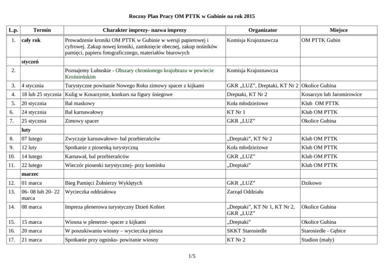 Roczny Plan Pracy OM PTTK w Gubinie na rok 2015 L.p. Termin