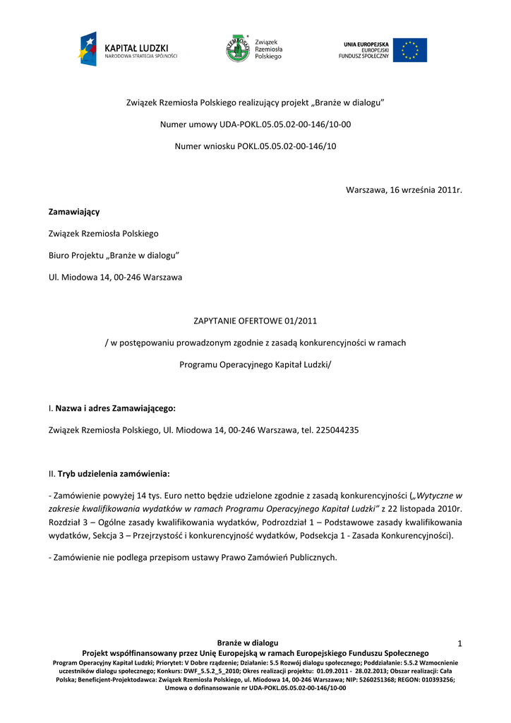 Związek Rzemiosła Polskiego realizujący projekt „Branże w dialogu” Numer umowy UDA-POKL.05.05.02-00-146/10-00 Numer wniosku POKL.05.05.02-00-146/10 Warszawa, 16 września 2011r. Zamawiający Związek Rzemiosła Polskiego Biuro Projektu „Branże w dialogu” Ul. Miodowa 14, 00-246 Warszawa ZAPYTANIE OFERTOWE 01/2011 / w postępowaniu prowadzonym zgodnie z zasadą konkurencyjności w ramach Programu Operacyjnego Kapitał Ludzki/ I. Nazwa i adres Zamawiającego: Związek Rzemiosła Polskiego, Ul. Miodowa 14, 00-246 Warszawa, tel. 225044235 II. Tryb udzielenia zamówienia: - Zamówienie powyżej 14 tys. Euro netto będzie udzielone zgodnie z zasadą konkurencyjności („Wytyczne w zakresie kwalifikowania wydatków w ramach Programu Operacyjnego Kapitał Ludzki” z 22 listopada 2010r. Rozdział 3 – Ogólne zasady kwalifikowania wydatków, Podrozdział 1 – Podstawowe zasady kwalifikowania wydatków, Sekcja 3 – Przejrzystość i konkurencyjność wydatków, Podsekcja 1 - Zasada Konkurencyjności). - Zamówienie nie podlega przepisom ustawy Prawo Zamówień Publicznych. Branże w dialogu Projekt współfinansowany przez Unię Europejską w ramach Europejskiego Funduszu Społecznego 1 Program Operacyjny Kapitał Ludzki; Priorytet: V Dobre rządzenie; Działanie: 5.5 Rozwój dialogu społecznego; Poddziałanie: 5.5.2 Wzmocnienie uczestników dialogu społecznego; Konkurs: DWF_5.5.2_5_2010; Okres realizacji projektu: 01.09.2011 - 28.02.2013; Obszar realizacji: Cała Polska; Beneficjent-Projektodawca: Związek Rzemiosła Polskiego, ul. Miodowa 14, 00-246 Warszawa; NIP: 5260251368; REGON: 010393256; Umowa o dofinansowanie nr UDA-POKL.05.05.02-00-146/10-00 - Zapytanie jest wysłane do co najmniej trzech potencjalnych Oferentów oraz zostaje umieszczone na stronie (www.zrp.pl) i w siedzibie Zamawiającego. - Zamówienie stanowiące przedmiot niniejszego postępowania jest współfinansowane przez Unię Europejską w ramach Europejskiego Funduszu Społecznego. III. Opis przedmiotu zamówienia: 1. Przedmiotem zamówienia jest usługa telekomunikacyjna mobilnego dostępu do sieci INTERNET, dla 26 osób w okresie 01.10.2011-28.02.2013. 2. Szczegółowy opis przedmiotu zamówienia: - Okres rozliczeniowy w ramach usługi – miesiąc kalendarzowy - Ilość wysłanych i odebranych danych, po przetransmitowaniu których w jednym okresie rozliczeniowym może nastąpić zmiana parametrów technicznych transmisji danych – min. 15 GB - Usługa świadczona w wybranych technologiach: GPRS, EDGE, UMTS/HSDPA, HSPA+, 3G Zakres zamówienia jest zgodny ze Wspólnym Słownikiem Zamówień: telekomunikacyjne, 72411000-4 Dostawcy usług internetowych (ISP). CPV: 64200000 – Usługi IV. Termin realizacji zamówienia: Usługa będzie realizowana w terminie 01.10.2011-28.02.2013r. V. Sposób przygotowania i złożenia oferty: - Oferent zobowiązany jest do złożenia oferty na druku stanowiącym załącznik do niniejszego zapytania ofertowego ; oferta złożona w odpowiedzi na zapytanie wiąże oferenta przez okres 14 dni. - Ofertę należy wysłać drogą elektroniczną na adres: [email protected] Branże w dialogu Projekt współfinansowany przez Unię Europejską w ramach Europejskiego Funduszu Społecznego 2 Program Operacyjny Kapitał Ludzki; Priorytet: V Dobre rządzenie; Działanie: 5.5 Rozwój dialogu społecznego; Poddziałanie: 5.5.2 Wzmocnienie uczestników dialogu społecznego; Konkurs: DWF_5.5.2_5_2010; Okres realizacji projektu: 01.09.2011 - 28.02.2013; Obszar realizacji: Cała Polska; Beneficjent-Projektodawca: Związek Rzemiosła Polskiego, ul. Miodowa 14, 00-246 Warszawa; NIP: 5260251368; REGON: 010393256; Umowa o dofinansowanie nr UDA-POKL.05.05.02-00-146/10-00 VII. Kryteria oceny oferty: Oferty będą oceniane wg następujących kryteriów: - Cena - 70% - Okres trwania umowy z usługodawcą – 10% - Ilość wysłanych i odebranych danych, po przetransmitowaniu których w jednym okresie rozliczeniowym może nastąpić zmiana parametrów technicznych transmisji danych - 10% - Zakres uprawnień Zamawiającego, w czasie trwania umowy i po jej zakończeniu (serwis) – 10% VIII. Termin składania ofert: Ofertę należy złożyć w terminie do dnia: 26.09.2011r. Godzina: 8:00 IX. Informacja o wyborze najkorzystniejszej oferty: - Informacja o wyborze najkorzystniejszej oferty zostanie opublikowana na stronie: www.zrp.pl, z podaniem nazwy, siedziby i adresu wykonawcy, - Zamawiający z wybranym wykonawcą zawrze umowę niezwłocznie po przekazaniu zawiadomienia o wyborze oferty. X. Osoba uprawniona do kontaktu: Szczegółowe informacje dotyczące zapytania ofertowego można uzyskać osobiście w siedzibie Związku Rzemiosła Polskiego przy ul. Miodowej 14 (biuro projektu „Branże w dialogu” III p. pokój 304), telefonicznie (22)5044235 lub drogą elektroniczną: [email protected]. Pracownikiem uprawnionym do kontaktów jest pan Sławomir Biedermann. XI. Załączniki Formularz oferty dotyczący zamówienia pn. „Usługa telekomunikacyjna mobilnego dostępu do sieci INTERNET, dla 26 osób w okresie 01.10.2011-28.02.2013” Niniejsze zapytanie ofertowe nie stanowi zobowiązania do zawarcia umowy. Branże w dialogu Projekt współfinansowany przez Unię Europejską w ramach Europejskiego Funduszu Społecznego 3 Program Operacyjny Kapitał Ludzki; Priorytet: V Dobre rządzenie; Działanie: 5.5 Rozwój dialogu społecznego; Poddziałanie: 5.5.2 Wzmocnienie uczestników dialogu społecznego; Konkurs: DWF_5.5.2_5_2010; Okres realizacji projektu: 01.09.2011 - 28.02.2013; Obszar realizacji: Cała Polska; Beneficjent-Projektodawca: Związek Rzemiosła Polskiego, ul. Miodowa 14, 00-246 Warszawa; NIP: 5260251368; REGON: 010393256; Umowa o dofinansowanie nr UDA-POKL.05.05.02-00-146/10-00