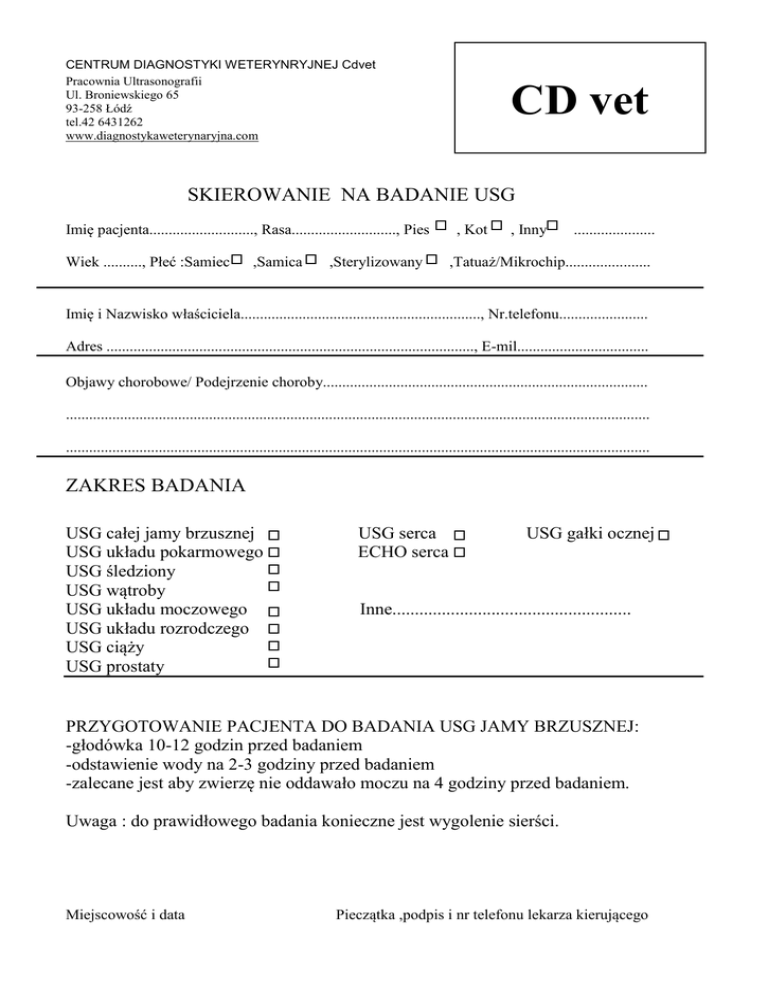 CENTRUM DIAGNOSTYKI WETERYNRYJNEJ Cdvet Pracownia Ultrasonografii Ul. Broniewskiego 65 93-258 Łódź tel.42 6431262 www.diagnostykaweterynaryjna.com CD vet SKIEROWANIE NA BADANIE USG Imię pacjenta..........................., Rasa..........................., Pies Wiek .........., Płeć :Samiec ,Samica ,Sterylizowany , Kot , Inny ..................... ,Tatuaż/Mikrochip...................... Imię i Nazwisko właściciela.............................................................., Nr.telefonu....................... Adres ..............................................................................................., E-mil.................................. Objawy chorobowe/ Podejrzenie choroby.................................................................................... ....................................................................................................................................................... ....................................................................................................................................................... ZAKRES BADANIA USG całej jamy brzusznej USG układu pokarmowego USG śledziony USG wątroby USG układu moczowego USG układu rozrodczego USG ciąży USG prostaty USG serca ECHO serca USG gałki ocznej Inne..................................................... PRZYGOTOWANIE PACJENTA DO BADANIA USG JAMY BRZUSZNEJ: -głodówka 10-12 godzin przed badaniem -odstawienie wody na 2-3 godziny przed badaniem -zalecane jest aby zwierzę nie oddawało moczu na 4 godziny przed badaniem. Uwaga : do prawidłowego badania konieczne jest wygolenie sierści. Miejscowość i data Pieczątka ,podpis i nr telefonu lekarza kierującego