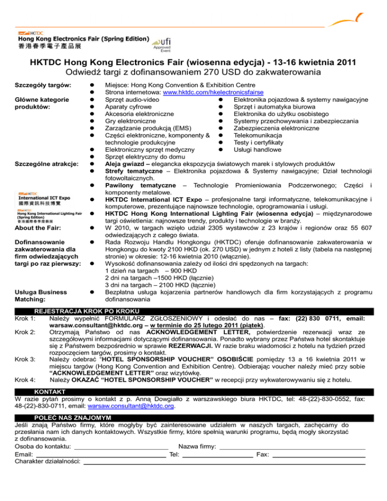HKTDC Hong Kong Electronics Fair (wiosenna edycja) - 13-16 kwietnia 2011 Odwiedź targi z dofinansowaniem 270 USD do zakwaterowania Szczegóły targów: Główne kategorie produktów: Szczególne atrakcje: l l l l l l l l l l l l l l l About the Fair: l Dofinansowanie zakwaterowania dla firm odwiedzających targi po raz pierwszy: l Usługa Business Matching: l l Miejsce: Hong Kong Convention & Exhibition Centre Strona internetowa: www.hktdc.com/hkelectronicsfairse Sprzęt audio-video l Elektronika pojazdowa & systemy nawigacyjne Aparaty cyfrowe l Sprzęt i automatyka biurowa Akcesoria elektroniczne l Elektronika do użytku osobistego Gry elektroniczne l Systemy przechowywania i zabezpieczania Zarządzanie produkcją (EMS) l Zabezpieczenia elektroniczne Części elektroniczne, komponenty & l Telekomunikacja technologie produkcyjne l Testy i certyfikaty Elektroniczny sprzęt medyczny l Usługi handlowe Sprzęt elektryczny do domu Aleja gwiazd – elegancka ekspozycja światowych marek i stylowych produktów Strefy tematyczne – Elektronika pojazdowa & Systemy nawigacyjne; Dział technologii fotowoltaicznych. Pawilony tematyczne – Technologie Promieniowania Podczerwonego; Części i komponenty metalowe. HKTDC International ICT Expo – profesjonalne targi informatyczne, telekomunikacyjne i komputerowe, prezentujące najnowsze technologie, oprogramowania i usługi. HKTDC Hong Kong International Lighting Fair (wiosenna edycja) – międzynarodowe targi oświetlenia: najnowsze trendy, produkty i technologie w branży. W 2010, w targach wzięło udział 2305 wystawców z 23 krajów i regionów oraz 55 607 odwiedzających z całego świata. Rada Rozwoju Handlu Hongkongu (HKTDC) oferuje dofinansowanie zakwaterowania w Hongkongu do kwoty 2100 HKD (ok. 270 USD) w jednym z hoteli z listy (tabela na następnej stronie) w okresie: 12-16 kwietnia 2010 (włącznie). Wysokość dofinansowania zależy od ilości dni spędzonych na targach: 1 dzień na targach – 900 HKD 2 dni na targach –1500 HKD (łącznie) 3 dni na targach – 2100 HKD (łącznie) Bezpłatna usługa kojarzenia partnerów handlowych dla firm korzystających z programu dofinansowania REJESTRACJA KROK PO KROKU Krok 1: Należy wypełnić FORMULARZ ZGŁOSZENIOWY i odesłać do nas – fax: (22) 830 0711, email: [email protected] – w terminie do 25 lutego 2011 (piątek). Krok 2: Otrzymają Państwo od nas ACKNOWLEDGEMENT LETTER, potwierdzenie rezerwacji wraz ze szczegółowymi informacjami dotyczącymi dofinansowania. Ponadto wybrany przez Państwa hotel skontaktuje się z Państwem bezpośrednio w sprawie REZERWACJI. W razie braku wiadomości z hotelu na tydzień przed rozpoczęciem targów, prosimy o kontakt. Krok 3: Należy odebrać “HOTEL SPONSORSHIP VOUCHER” OSOBIŚCIE pomiędzy 13 a 16 kwietnia 2011 w miejscu targów (Hong Kong Convention and Exhibition Centre). Odbierając voucher należy mieć przy sobie “ACKNOWLEDGEMENT LETTER” oraz wizytówkę. Krok 4: Należy OKAZAĆ “HOTEL SPONSORSHIP VOUCHER” w recepcji przy wykwaterowywaniu się z hotelu. KONTAKT W razie pytań prosimy o kontakt z p. Anną Dowgiałło z warszawskiego biura HKTDC, tel: 48-(22)-830-0552, fax: 48-(22)-830-0711, email: [email protected]. POLEĆ NAS ZNAJOMYM Jeśli znają Państwo firmy, które mogłyby być zainteresowane udziałem w naszych targach, zachęcamy do przesłania nam ich danych kontaktowych. Wszystkie firmy, które spełnią warunki programu, będą mogły skorzystać z dofinansowania. Osoba do kontaktu: Nazwa firmy: Email: Tel: Fax: Charakter działalności: ZASADY I WARUNKI DOFINANSOWANIA 1) Firma MUSI BYĆ ZWIĄZANA Z BRANŻĄ ELEKTRONICZNĄ i MUSI ODWIEDZAĆ TARGI Hong Kong Electronics Fair (Spring Edition) PO RAZ PIERWSZY, aby skorzystać z oferty dofinansowania hotelu. 2) Firma NIE MOŻE BYĆ WYSTAWCĄ na Hong Kong Electronics Fair (Spring Edition), International ICT Expo ani Hong Kong International Lighting Fair (Spring Edition), aby skorzystać z oferty dofinansowania. 3) Jeśli wystąpili Państwo o dofinansowanie na targi International ICT Expo lub Hong Kong International Lighting Fair (Spring Edition), niniejsza aplikacja nie zostanie rozpatrzona. 4) Każdej firmie przysługuje TYLKO JEDEN POKÓJ w JEDNYM HOTELU w okresie: 12-16 kwietnia 2011 (włącznie). Ilość miejsc w promocji ograniczona, decyduje kolejność zgłoszeń. 5) W przypadku braku wolnych pokoi w wybranym hotelu, zostanie zaproponowany Państwu inny hotel. 6) Formularze bez numeru karty kredytowej nie będą rozpatrzone. W przypadku, gdy nie pojawią się Państwo w wyznaczonym terminie, hotel obciąży Państwa kartę kredytową opłata za jedna dobę. 7) Aby otrzymać talon hotelowy ‘Hotel Sponsorship Voucher’ należy udać się do stoiska ‘Buying Mission Service Counter’ zlokalizowanego na targach, okazać „Acknowledgement Letter” i wyzytówkę, a następnie wypełnić kwestionariusz. 8) Targi mają charakter ściśle biznesowy. Wstęp na targi mają wyłącznie osoby pełnoletnie (powyżej 18 roku życia). 9) Organizatorzy zastrzegają sobie prawo do zmiany warunków programu oraz wstrzymania dotacji bez uprzedniego ostrzeżenia. 10) W przypadku jakichkolwiek sporów dotyczących programu dofinansowania, decyzję ostateczną i wiążącą podejmą Organizatorzy. Hotele do wyboru (Proszę zaznaczyć tylko JEDEN hotel stawiając przy nim “ü” ) Hotel o Regal Kowloon Hotel o o o o o o o http://regalhotel.com Harbour Grand Hong Kong # www.harbour-grand.com Traders Hotel, Hong Kong # www.tradershotels.com Metropark Hotel Causeway Bay # www.metroparkhotel.com The Royal Pacific Hotel & Towers www.royalpacific.com.hk The Kimberley Hotel www.kimberleyhotel.com.hk South Pacific Hotel # www.southpacifichotel.com.hk Ramada Hong Kong Hotel # www.ramadahongkong.com Adres Kontakt 71 Mody Road, Tsimshatsui, Kowloon, Hong Kong 23 Oil Street, North Point, Hong Kong 508 Queen’s Road West, Western District, Hong Kong 148 Tung Lo Wan Road, Causeway Bay, H