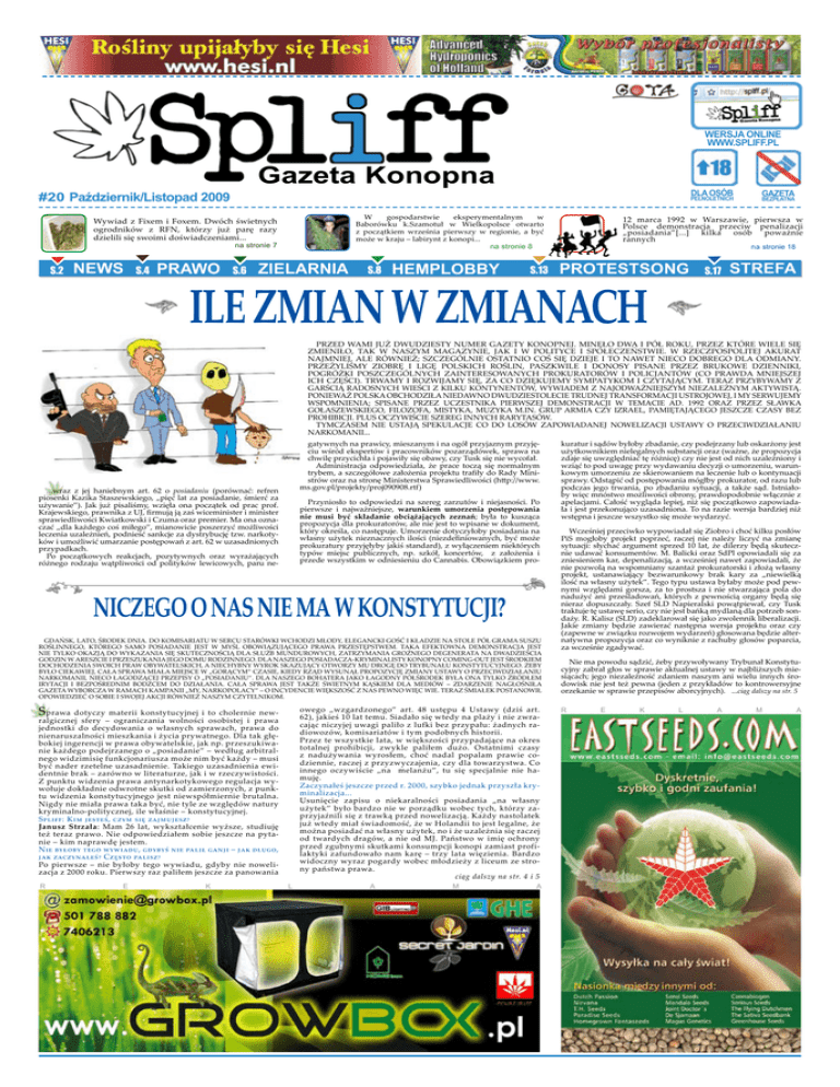 WERSJA ONLINE www.SPLIFF.PL Gazeta Konopna #20 Październik/Listopad 2009 W gospodarstwie eksperymentalnym w Baborówku k.Szamotuł w Wielkopolsce otwarto z początkiem września pierwszy w regionie, a być może w kraju – labirynt z konopi... na stronie 8 Wywiad z Fixem i Foxem. Dwóch świetnych ogrodników z RFN, którzy już parę razy dzielili się swoimi doświadczeniami... S.2 na stronie 7 NEWS S.4 PRAWO Dla osób pełnoletnich S.6 ZIELARNIA S.8 HEMPLOBBY S.13 GAZETA BEZPŁATNA 12 marca 1992 w Warszawie, pierwsza w Polsce demonstracja przeciw penalizacji „posiadania”[...] kilka osób poważnie rannych na stronie 18 PROTESTSONG Ile zmian w zmianach S.17 STREFA Przed Wami już dwudziesty numer Gazety Konopnej. Minęło dwa i pół roku, przez które wiele się zmieniło, tak w naszym magazynie, jak i w polityce i społeczeństwie. W Rzeczpospolitej akurat najmniej, ale również; szczególnie ostatnio coś się dzieje i to nawet nieco dobrego dla odmiany. Przeżyliśmy Ziobrę i Ligę Polskich Roślin, paszkwile i donosy pisane przez brukowe dzienniki, pogróżki poszczególnych zainteresowanych prokuratorów i policjantów (co prawda mniejszej ich części). Trwamy i rozwijamy się, za co dziękujemy sympatykom i czytającym. Teraz przybywamy z garścią radosnych wieści z kilku kontynentów, wywiadem z najodważniejszym niezależnym aktywistą. Ponieważ Polska obchodziła niedawno dwudziestolecie trudnej transformacji ustrojowej, i my serwujemy wspomnienia; spisane przez uczestnika pierwszej demonstracji w temacie AD. 1992 oraz przez Sławka Gołaszewskiego, filozofa, mistyka, muzyka m.in. grup Armia czy Izrael, pamiętającego jeszcze czasy bez prohibicji. Plus oczywiście szereg innych rarytasów. Tymczasem nie ustają spekulacje co do losów zapowiadanej nowelizacji Ustawy o przeciwdziałaniu narkomanii... gatywnych na prawicy, mieszanym i na ogół przyjaznym przyjęciu wśród ekspertów i pracowników pozarządówek, sprawa na chwilę przycichła i pojawiły się obawy, czy Tusk się nie wycofał. Administracja odpowiedziała, że prace toczą się normalnym trybem, a szczegółowe założenia projektu trafiły do Rady Ministrów oraz na stronę Ministerstwa Sprawiedliwości (http://www. ms.gov.pl/projekty/proj090908.rtf) ...wraz z jej haniebnym art. 62 o posiadaniu (porównać: refren piosenki Kazika Staszewskiego, „pięć lat za posiadanie, śmierć za używanie”). Jak już pisaliśmy, wzięła ona początek od prac prof. Krajewskiego, prawnika z UJ, firmują ją zaś wiceminister i minister sprawiedliwości Kwiatkowski i Czuma oraz premier. Ma ona oznaczać „dla każdego coś miłego”, mianowicie poszerzyć możliwości leczenia uzależnień, podnieść sankcje za dystrybucję tzw. narkotyków i umożliwić umarzanie postępowań z art. 62 w uzasadnionych przypadkach. Po początkowych reakcjach, pozytywnych oraz wyrażających różnego rodzaju wątpliwości od polityków lewicowych, paru ne- Przyniosło to odpowiedzi na szereg zarzutów i niejasności. Po pierwsze i najważniejsze, warunkiem umorzenia postępowania nie musi być składanie obciążających zeznań; była to kusząca propozycja dla prokuratorów, ale nie jest to wpisane w dokument, który określa, co następuje. Umorzenie dotyczyłoby posiadania na własny użytek nieznacznych ilości (niezdefiniowanych, być może prokuratury przyjęłyby jakiś standard), z wyłączeniem niektórych typów miejsc publicznych, np. szkół, koncertów, z założenia i przede wszystkim w odniesieniu do Cannabis. Obowiązkiem pro- Niczego o nas nie ma w konstytucji? Gdańsk, lato, środek dnia. Do komisariatu w sercu starówki wchodzi młody, elegancki gość i kładzie na stole pół grama suszu roślinnego, którego samo posiadanie jest w myśl obowiązującego prawa przestępstwem. Taka efektowna demonstracja jest nie tylko okazją do wykazania się skutecznością dla służb mundurowych, zatrzymania groźnego degenerata na dwadzieścia godzin w areszcie i przeszukania jego domu rodzinnego. Dla naszego posiadacza-kryminalisty konopny coming-out jest środkiem dochodzenia swoich praw obywatelskich, a niechybny wyrok skazujący otworzy mu drogę do Trybunału Konstytucyjnego. Żeby było ciekawiej, cała sprawa miała miejsce w „gorącym” czasie, kiedy rząd wysunął propozycję zmiany Ustawy o Przeciwdziałaniu Narkomanii, nieco łagodzącej przepisy o „posiadaniu”. Dla naszego bohatera jako łagodny półśrodek była ona tylko źródłem irytacji i bezpośrednim bodźcem do działania. Cała sprawa jest także świetnym kąskiem dla mediów – zdarzenie nagłośniła Gazeta Wyborcza w ramach kampanii „My, Narkopolacy” – o incydencie większość z nas pewno więc wie. Teraz śmiałek postanowił opowiedzieć o sobie i swojej akcji również naszym czytelnikom. S owego „wzgardzonego” art. 48 ustępu 4 Ustawy (dziś art. 62), jakieś 10 lat temu. Siadało się wtedy na plaży i nie zwracając niczyjej uwagi paliło z lufki bez przypału: żadnych radiowozów, komisariatów i tym podobnych historii. Przez te wszystkie lata, w większości przypadające na okres totalnej prohibicji, zwykle paliłem dużo. Ostatnimi czasy z nadużywania wyrosłem, choć nadal popalam prawie codziennie, raczej z przyzwyczajenia, czy dla towarzystwa. Co innego oczywiście „na melanżu”, tu się specjalnie nie hamuję. Zaczynałeś jeszcze przed r. 2000, szybko jednak przyszła kryminalizacja... Usunięcie zapisu o niekaralności posiadania „na własny użytek” było bardzo nie w porządku wobec tych, którzy zaprzyjaźnili się z trawką przed nowelizacją. Każdy nastolatek już wtedy miał świadomość, że w Holandii to jest legalne, że można posiadać na własny użytek, no i że uzależnia się raczej od twardych dragów, a nie od MJ. Państwo w imię ochrony przed zgubnymi skutkami konsumpcji konopi zamiast profilaktyki zafundowało nam karę – trzy lata więzienia. Bardzo widoczny wyraz