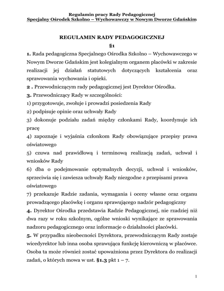 Regulamin pracy Rady Pedagogicznej Specjalny Ośrodek Szkolno – Wychowawczy w Nowym Dworze Gdańskim REGULAMIN RADY PEDAGOGICZNEJ §1 1. Rada pedagogiczna Specjalnego Ośrodka Szkolno – Wychowawczego w Nowym Dworze Gdańskim jest kolegialnym organem placówki w zakresie realizacji jej działań statutowych dotyczących kształcenia oraz sprawowania wychowania i opieki. 2 . Przewodniczącym rady pedagogicznej jest Dyrektor Ośrodka. 3. Przewodniczący Rady w szczególności: 1) przygotowuje, zwołuje i prowadzi posiedzenia Rady 2) podpisuje opinie oraz uchwały Rady 3) dokonuje podziału zadań między członkami Rady, koordynuje ich pracę 4) zapoznaje i wyjaśnia członkom Rady obowiązujące przepisy prawa oświatowego 5) czuwa nad prawidłową i terminową realizacją zadań, uchwał i wniosków Rady 6) dba o podejmowanie optymalnych decyzji, uchwał i wniosków, sprzeciwia się i zawiesza uchwały Rady niezgodne z przepisami prawa oświatowego 7) przekazuje Radzie zadania, wymagania i oceny własne oraz organu prowadzącego placówkę i organu sprawującego nadzór pedagogiczny 4. Dyrektor Ośrodka przedstawia Radzie Pedagogicznej, nie rzadziej niż dwa razy w roku szkolnym, ogólne wnioski wynikające ze sprawowania nadzoru pedagogicznego oraz informacje o działalności placówki. 5. W przypadku nieobecności Dyrektora, przewodniczącym Rady zostaje wicedyrektor lub inna osoba sprawująca funkcję kierowniczą w placówce. Osoba ta może również zostać upoważniona przez Dyrektora do realizacji zadań, o których mowa w ust. §1.3 pkt 1 – 7. 1 Regulamin pracy Rady Pedagogicznej Specjalny Ośrodek Szkolno – Wychowawczy w Nowym Dworze Gdańskim §2 1. W skład Rady Pedagogicznej wchodzą: 1) Dyrektor 2) wszyscy nauczyciele zatrudnieni w placówce 3) wychowawcy grup wychowawczych 4) pedagog, psycholog, logopeda 2. W zebraniach Rady Pedagogicznej mogą także mogą brać udział z głosem doradczym osoby zaproszone przez jej przewodniczącego, za zgodą lub na wniosek członków Rady. 3. Zebrania Rady Pedagogicznej organizowane są: 1) przed rozpoczęciem roku szkolnego 2) w każdym semestrze w związku z zatwierdzeniem wyników klasyfikowania i promowania uczniów 3) po zakończeniu rocznych zajęć szkolnych 4) w miarę bieżących potrzeb, według rocznego harmonogramu posiedzeń (rady szkoleniowe) 5) w miarę potrzeb zebrania mogą być organizowane na wniosek Kuratora, z inicjatywy przewodniczącego Rady Pedagogicznej, organu prowadzącego albo co najmniej 1/3 członków Rady Pedagogicznej. 4. Przewodniczący zwołuje, przygotowuje i prowadzi zebranie Rady Pedagogicznej oraz jest odpowiedzialny za zawiadomienie wszystkich jej członków o terminie i porządku zebrania zgodnie z Regulaminem Rady Pedagogicznej. 5. Ogłoszenia dotyczące terminu posiedzenia Pady Pedagogicznej są publikowane zarówno w księdze zarządzeń, na tablicy ogłoszeń w pokoju nauczycielskim, jak i na szkolnej stronie internetowej co najmniej tydzień przez zaplanowanym posiedzeniem. 2 Regulamin pracy Rady Pedagogicznej Specjalny Ośrodek Szkolno – Wychowawczy w Nowym Dworze Gdańskim 6. Dopuszcza się możliwość, z przyczyn istotnych dla właściwego funkcjonowania placówki, zwoływania posiedzeń Rady w trybie nadzwyczajnym, z pominięciem wymagań określonych w punkcie 3. W przypadku takim informacja o terminie i porządku posiedzenia może być podana tylko w formie zawiadomienia na tablicy ogłoszeń w pokoju nauczycielskim lub ustnie. §3 1. Rada Pedagogiczna może głosować zarówno w sposób jawny, jak i tajny: 1) głosowanie jawne przeprowadza Przewodniczący Rady Pedagogicznej lub osoba przez niego wyznaczona. W głosowaniu jawnym członkowie Rady głosują przez podniesienie ręki. 2) głosowanie tajne przeprowadza trzyosobowa komisja skrutacyjna wyłoniona spośród członków grona pedagogicznego i zatwierdzona w drodze jawnego głosowania. W głosowaniu tajnym członkowie Rady głosują kartami do głosowania przygotowanymi przez komisję skrutacyjną. 2. Głosowanie jawne przeprowadza się m.in. podczas: 1) zatwierdzania porządku obrad Rady Pedagogicznej 2) zatwierdzania egzaminów, klasyfikacji i promocji uczniów 3) zatwierdzania innowacji i eksperymentów pedagogicznych 4) ustalania organizacji doskonalenia zawodowego nauczycieli 5) skreślenia z listy uczniów pełnoletnich 6) zatwierdzania planów pracy 7) podejmowania uchwał 8) wydawania opinii 9) zatwierdzania wewnątrzszkolnych dokumentów 10) zatwierdzania zmian w Statucie 11) zatwierdzania organizacji pracy placówki 3 Regulamin pracy Rady Pedagogicznej Specjalny Ośrodek Szkolno – Wychowawczy w Nowym Dworze Gdańskim 12) opiniowania wniosków o przyznanie nauczycielom odznaczeń i wyróżnień. 13) przydzielania wytypowanym przez Dyrektora nauczycielom przydziału stałych [prac i zajęć w ramach wynagrodzenia zasadniczego oraz dodatkowo płatnych zajęć dydaktycznych, wychowawczych i opiekuńczych 14) i innych sprawach, które nie dotyczą spraw personalnych innych członków Rady Pedagogicznej, obsadzania stanowisk kierowniczych w placówce oraz delegowania przedstawicieli Rady do innych organów. 3. Głosowanie tajne Rada Pedagogiczna przeprowadza podczas wyrażania swojego stanowiska, które dotyczy one spraw personalnych innych członków Rady Pedagogicznej, obsadzania stanowisk kierowniczych oraz delegowania przedstawicieli Rady do innych organów. 4. Uchwały Rady są podejmowane zwykłą większością głosów w obecności co najmniej połowy jej członków. Zwykła większość głosów jest to taka liczba głosów "za", która przewyższa co najmniej o jeden głos liczbę głosów "przeciw". Pomija się głosy "wstrzymujące się", mające znaczenie wyłącznie dla ustalenia zachowania quorum (minimalnej frekwencji). Jeżeli pełny skład Rady stanowi liczbę nieparzystą, quorum oznacza frekwencję członków Rady przynajmniej równą pierwszej liczbie całkowitej po ½ pełnego składu Rady. 5.