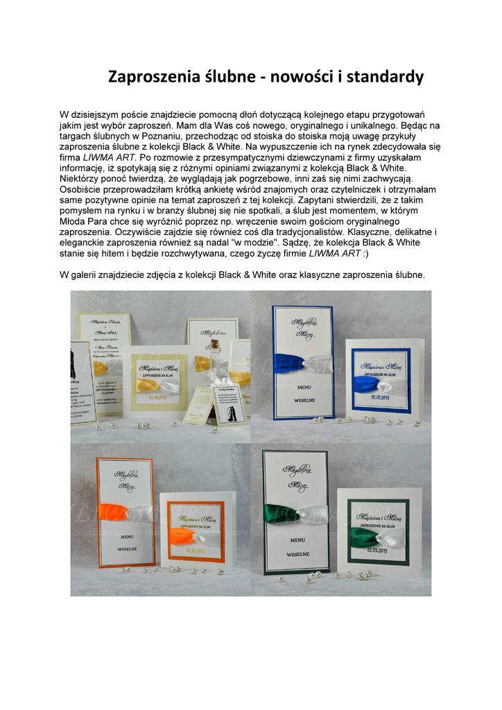 Zaproszenia ślubne - nowości i standardy W dzisiejszym poście znajdziecie pomocną dłoń dotyczącą kolejnego etapu przygotowań jakim jest wybór zaproszeń. Mam dla Was coś nowego, oryginalnego i unikalnego. Będąc na targach ślubnych w Poznaniu, przechodząc od stoiska do stoiska moją uwagę przykuły zaproszenia ślubne z kolekcji Black & White. Na wypuszczenie ich na rynek zdecydowała się firma LIWMA ART. Po rozmowie z przesympatycznymi dziewczynami z firmy uzyskałam informację, iż spotykają się z różnymi opiniami związanymi z kolekcją Black & White. Niektórzy ponoć twierdzą, że wyglądają jak pogrzebowe, inni zaś się nimi zachwycają. Osobiście przeprowadziłam krótką ankietę wśród znajomych oraz czytelniczek i otrzymałam same pozytywne opinie na temat zaproszeń z tej kolekcji. Zapytani stwierdzili, że z takim pomysłem na rynku i w branży ślubnej się nie spotkali, a ślub jest momentem, w którym Młoda Para chce się wyróżnić poprzez np. wręczenie swoim gościom oryginalnego zaproszenia. Oczywiście zajdzie się również coś dla tradycjonalistów. Klasyczne, delikatne i eleganckie zaproszenia również są nadal "w modzie". Sądzę, że kolekcja Black & White stanie się hitem i będzie rozchwytywana, czego życzę firmie LIWMA ART :) W galerii znajdziecie zdjęcia z kolekcji Black & White oraz klasyczne zaproszenia ślubne. Bardzo dziękujemy firmie LIWMA ART za udostępnienie zdjęć.