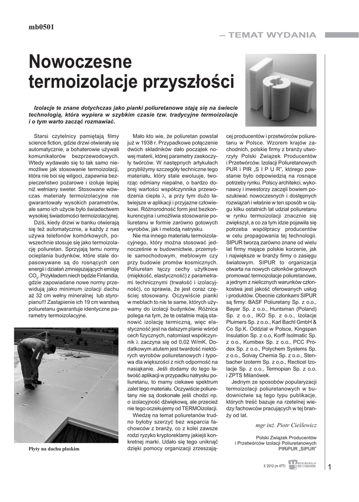 mb0501 – TEMAT WYDANIA Nowoczesne termoizolacje przyszłości Izolacje te znane dotychczas jako pianki poliuretanowe stają się na świecie technologią, która wypiera w szybkim czasie tzw. tradycyjne termoizolacje i o tym warto zacząć rozmawiać. Starsi czytelnicy pamiętają filmy science fiction, gdzie drzwi otwierały się automatycznie, a bohaterowie używali komunikatorów bezprzewodowych. Wtedy wydawało się to tak samo niemożliwe jak stosowanie termoizolacji, która nie boi się wilgoci, zapewnia bezpieczeństwo pożarowe i izoluje lepiej niż wełniany sweter. Stosowane wówczas materiały termoizolacyjne nie gwarantowały wysokich parametrów, ale samo ich użycie było świadectwem wysokiej świadomości termoizolacyjnej. Dziś, kiedy drzwi w banku otwierają się też automatycznie, a każdy z nas używa telefonów komórkowych, powszechnie stosuje się jako termoizolację poliuretan. Sprzyjają temu normy ocieplania budynków, które stale dopasowywane są do rosnących cen energii i działań zmniejszających emisję CO2. Przykładem niech będzie Finlandia, gdzie zapowiadane nowe normy przewidują jako minimum izolacji dachu aż 32 cm wełny mineralnej lub styropianu!!! Zastąpienie ich 19 cm warstwą poliuretanu gwarantuje identyczne parametry termoizolacyjne. Płyty na dachu płaskim Mało kto wie, że poliuretan powstał już w 1938 r. Przypadkowe połączenie dwóch składników dało początek nowej materii, której parametry zaskoczyły twórców. W następnych artykułach przybliżymy szczegóły techniczne tego materiału, który stale ewoluuje, tworząc odmiany niepalne, o bardzo dobrej wartości współczynnika przewodzenia ciepła λ, a przy tym dużo łatwiejsze w aplikacji i przyjazne człowiekowi. Różnorodność form jest bezkonkurencyjna i umożliwia stosowanie poliuretanu w formie zarówno gotowych wyrobów, jak i metodą natrysku. Nie ma innego materiału termoizolacyjnego, który można stosować jednocześnie w budownictwie, przemyśle samochodowym, meblowym czy przy budowie promów kosmicznych. Poliuretan łączy cechy użytkowe (miękkość, elastyczność) z parametrami technicznymi (trwałość i izolacyjność), co sprawia, że jest coraz częściej stosowany. Oczywiście pianki w meblach to nie te same, których używamy do izolacji budynków. Różnica polega na tym, że te ostatnie mają stanowić izolację termiczną, więc elastyczność jest na dalszym planie wśród cech fizycznych, natomiast współczynnik λ zaczyna się od 0,02 W/mK. Dodatkowym atutem jest twardość niektórych wyrobów poliuretanowych i typowa dla większości z nich odporność na nasiąkanie. Jeśli dodamy do tego łatwość aplikacji w przypadku natrysku poliuretanu, to mamy ciekawe spektrum zalet tego materiału. Oczywiście poliuretany nie są doskonałe jeśli chodzi np. o izolacyjność dźwiękową, ale przecież nie tego oczekujemy od TERMOizolacji. Wiedzę na temat poliuretanów trudno byłoby szerzyć bez wsparcia fachowców z branży, co z kolei zawsze rodzi ryzyko kryptoreklamy jakiejś konkretnej marki. Udało się tego uniknąć dzięki pomocy organizacji zrzeszają- cej producentów i przetwórców poliuretanu w Polsce. Wzorem krajów zachodnich, polskie firmy z branży utworzyły Polski Związek Producentów i Przetwórców. Izolacji Poliuretanowych PUR i PIR „S I P U R”, którego powstanie było odpowiedzią na rosnące potrzeby rynku. Polscy architekci, wykonawcy i inwestorzy zaczęli bowiem poszukiwać nowoczesnych i dostępnych rozwiązań i właśnie w ten sposób w ciągu kilku ostatnich lat udział poliuretanu w rynku termoizolacji znacznie się zwiększył, a co za tym idzie pojawiła się potrzeba współpracy producentów w celu propagowania tej technologii. SIPUR tworzą zarówno znane od wielu lat firmy mające polskie korzenie, jak i największe w branży firmy o zasięgu światowym. SIPUR to organizacja otwarta na nowych członków gotowych promować termoizolacje poliuretanowe, a jednym z nielicznych warunków członkostwa jest jakość oferowanych usług i produktów. Obecnie członkami SIPUR są firmy: BASF Poliuretany Sp. z o.o., Bayer Sp. z o.o., Huntsman (Poland) Sp. z o.o., IKO Sp. z o.o., Izolacje Pluimers Sp. z o.o., Karl Bachl GmbH & Co Sp.K. Oddział w Polsce, Kingspan Insulation Sp. z o.o, Korff Isolmatic Sp. z o.o., Kumibex Sp. z o.o., PCC Prodex Sp. z o.o., Polychem Systems Sp. z o.o., Solvay Chemia Sp. z o.o., Stenbacher Izoterm Sp. z o.o., Recticel Izolacje Sp. z o.o., Termopian Sp. z o.o. i ZPTS Milanówek. Jednym ze sposobów popularyzacji termoizolacji poliuretanowych w budownictwie są tego typu publikacje, których treść bazuje na rzetelnej wiedzy fachowców pracujących w tej branży od lat. mgr inż. Piotr Cieślewicz Polski Związek Producentów i Przetwórców Izolacji Poliuretanowych PIRiPUR „SIPUR” 5 ’2012 (nr 477) 1