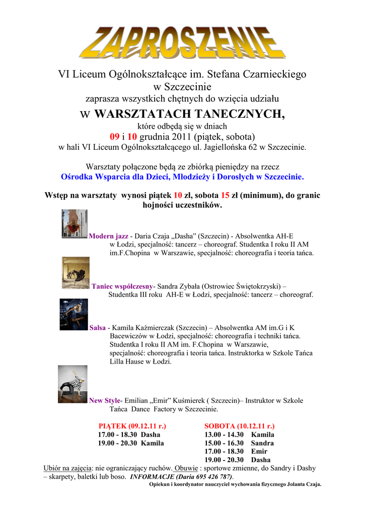 VI Liceum Ogólnokształcące im. Stefana Czarnieckiego w Szczecinie zaprasza wszystkich chętnych do wzięcia udziału w WARSZTATACH TANECZNYCH, które odbędą się w dniach 09 i 10 grudnia 2011 (piątek, sobota) w hali VI Liceum Ogólnokształcącego ul. Jagiellońska 62 w Szczecinie. Warsztaty połączone będą ze zbiórką pieniędzy na rzecz Ośrodka Wsparcia dla Dzieci, Młodzieży i Dorosłych w Szczecinie. Wstęp na warsztaty wynosi piątek 10 zł, sobota 15 zł (minimum), do granic hojności uczestników. Modern jazz - Daria Czaja „Dasha” (Szczecin) - Absolwentka AH-E w Łodzi, specjalność: tancerz – choreograf. Studentka I roku II AM im.F.Chopina w Warszawie, specjalność: choreografia i teoria tańca. Taniec współczesny- Sandra Zybała (Ostrowiec Świętokrzyski) – Studentka III roku AH-E w Łodzi, specjalność: tancerz – choreograf. Salsa - Kamila Kaźmierczak (Szczecin) – Absolwentka AM im.G i K Bacewiczów w Łodzi, specjalność: choreografia i techniki tańca. Studentka I roku II AM im. F.Chopina w Warszawie, specjalność: choreografia i teoria tańca. Instruktorka w Szkole Tańca Lilla Hause w Łodzi. New Style- Emilian „Emir” Kuśmierek ( Szczecin)– Instruktor w Szkole Tańca Dance Factory w Szczecinie. PIĄTEK (09.12.11 r.) 17.00 - 18.30 Dasha 19.00 - 20.30 Kamila SOBOTA (10.12.11 r.) 13.00 - 14.30 Kamila 15.00 - 16.30 Sandra 17.00 - 18.30 Emir 19.00 - 20.30 Dasha Ubiór na zajęcia: nie ograniczający ruchów. Obuwie : sportowe zmienne, do Sandry i Dashy – skarpety, baletki lub boso. INFORMACJE (Daria 695 426 787). Opiekun i koordynator nauczyciel wychowania fizycznego Jolanta Czaja. .