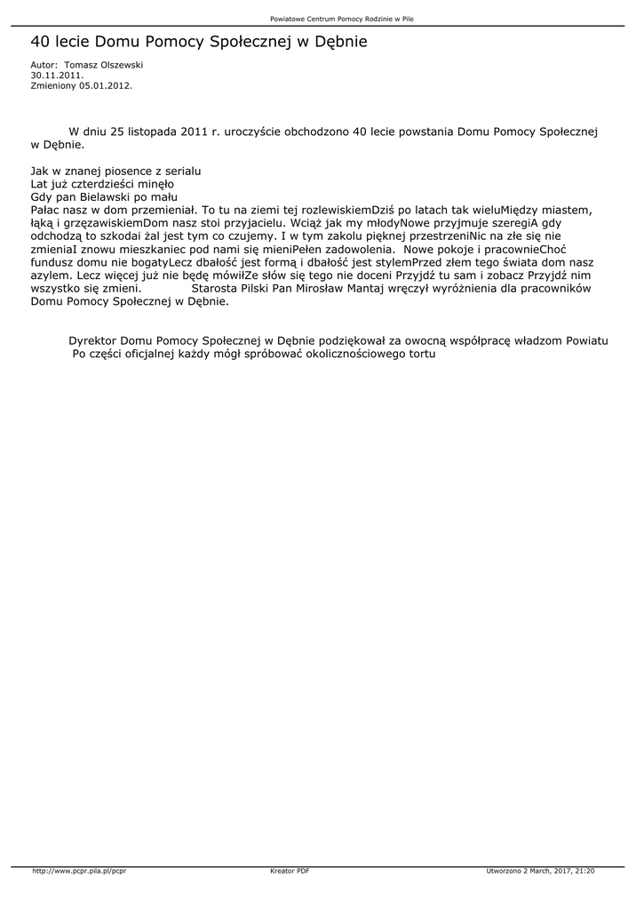Powiatowe Centrum Pomocy Rodzinie w Pile 40 lecie Domu Pomocy Społecznej w Dębnie Autor: Tomasz Olszewski 30.11.2011. Zmieniony 05.01.2012. W dniu 25 listopada 2011 r. uroczyście obchodzono 40 lecie powstania Domu Pomocy Społecznej w Dębnie. Jak w znanej piosence z serialu Lat już czterdzieści minęło Gdy pan Bielawski po mału Pałac nasz w dom przemieniał. To tu na ziemi tej rozlewiskiemDziś po latach tak wieluMiędzy miastem, łąką i grzęzawiskiemDom nasz stoi przyjacielu. Wciąż jak my młodyNowe przyjmuje szeregiA gdy odchodzą to szkodai żal jest tym co czujemy. I w tym zakolu pięknej przestrzeniNic na złe się nie zmieniaI znowu mieszkaniec pod nami się mieniPełen zadowolenia. Nowe pokoje i pracownieChoć fundusz domu nie bogatyLecz dbałość jest formą i dbałość jest stylemPrzed złem tego świata dom nasz azylem. Lecz więcej już nie będę mówiłZe słów się tego nie doceni Przyjdź tu sam i zobacz Przyjdź nim wszystko się zmieni. Starosta Pilski Pan Mirosław Mantaj wręczył wyróżnienia dla pracowników Domu Pomocy Społecznej w Dębnie. Dyrektor Domu Pomocy Społecznej w Dębnie podziękował za owocną współpracę władzom Powiatu Po części oficjalnej każdy mógł spróbować okolicznościowego tortu http://www.pcpr.pila.pl/pcpr Kreator PDF Utworzono 2 March, 2017, 21:20