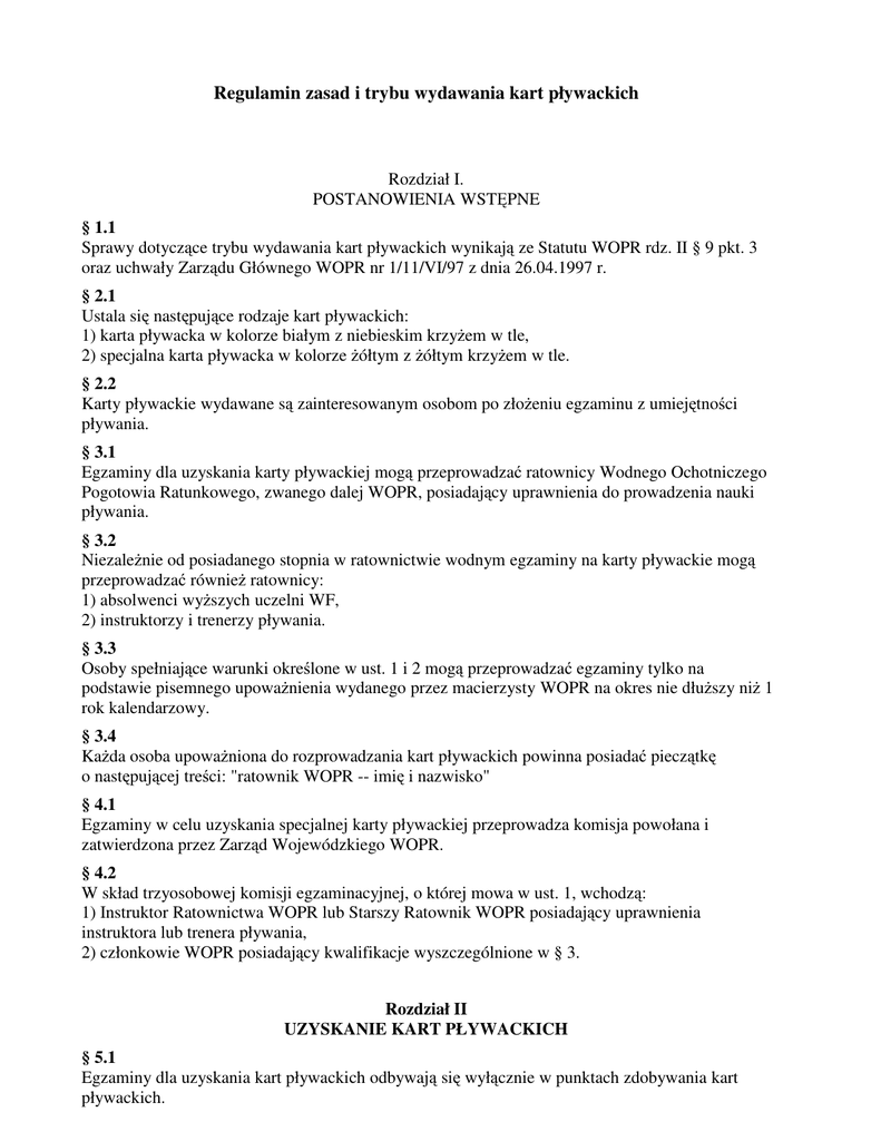 Regulamin zasad i trybu wydawania kart pływackich Rozdział I. POSTANOWIENIA WSTĘPNE § 1.1 Sprawy dotyczące trybu wydawania kart pływackich wynikają ze Statutu WOPR rdz. II § 9 pkt. 3 oraz uchwały Zarządu Głównego WOPR nr 1/11/VI/97 z dnia 26.04.1997 r. § 2.1 Ustala się następujące rodzaje kart pływackich: 1) karta pływacka w kolorze białym z niebieskim krzyżem w tle, 2) specjalna karta pływacka w kolorze żółtym z żółtym krzyżem w tle. § 2.2 Karty pływackie wydawane są zainteresowanym osobom po złożeniu egzaminu z umiejętności pływania. § 3.1 Egzaminy dla uzyskania karty pływackiej mogą przeprowadzać ratownicy Wodnego Ochotniczego Pogotowia Ratunkowego, zwanego dalej WOPR, posiadający uprawnienia do prowadzenia nauki pływania. § 3.2 Niezależnie od posiadanego stopnia w ratownictwie wodnym egzaminy na karty pływackie mogą przeprowadzać również ratownicy: 1) absolwenci wyższych uczelni WF, 2) instruktorzy i trenerzy pływania. § 3.3 Osoby spełniające warunki określone w ust. 1 i 2 mogą przeprowadzać egzaminy tylko na podstawie pisemnego upoważnienia wydanego przez macierzysty WOPR na okres nie dłuższy niż 1 rok kalendarzowy. § 3.4 Każda osoba upoważniona do rozprowadzania kart pływackich powinna posiadać pieczątkę o następującej treści: "ratownik WOPR -- imię i nazwisko" § 4.1 Egzaminy w celu uzyskania specjalnej karty pływackiej przeprowadza komisja powołana i zatwierdzona przez Zarząd Wojewódzkiego WOPR. § 4.2 W skład trzyosobowej komisji egzaminacyjnej, o której mowa w ust. 1, wchodzą: 1) Instruktor Ratownictwa WOPR lub Starszy Ratownik WOPR posiadający uprawnienia instruktora lub trenera pływania, 2) członkowie WOPR posiadający kwalifikacje wyszczególnione w § 3. Rozdział II UZYSKANIE KART PŁYWACKICH § 5.1 Egzaminy dla uzyskania kart pływackich odbywają się wyłącznie w punktach zdobywania kart pływackich. § 5.2 Egzaminator nie może przeprowadzać egzaminu w czasie pełnienia służby ratowniczej. § 5.3 Punkty zdobywania kart pływackich wyznaczają Zarządy Wojewódzkich WOPR. § 5.4 Punkt zdobywania kart pływackich powinien być oznakowany z podaniem godzin przeprowadzania egzaminów oraz nazwisk egzaminatorów. § 5.5 Egzaminy są przeprowadzane na wodach otwartych, pływalniach krytych i odkrytych - minimum 25 metrowych. §6 Do obowiązków egzaminatora należy: 2. 3. 4. 5. 6. 1. stwierdzenie tożsamości osoby przystępującej do egzaminu, zapewnienie bezpieczeństwa osobie egzaminowanej, przeprowadzenie egzaminu w sposób sumienny i zgodny z instrukcją, stemplowanie każdej karty pływackiej w momencie jej wystawienia pieczątką, o której mowa w § 3 ust.4, prowadzenie protokołów z przeprowadzonego egzaminu na kartę pływacką według wzoru nr 4, bieżące rozliczanie się z pobranych kart pływackich. § 7.1 Kartę pływacką może uzyskać osoba, która zda egzamin obejmujący: 1. przepłynięcie w wodzie stojącej 200 m w dowolny sposób i w dowolnym czasie w tym przynajmniej 50 m na plecach, albo przepłynięcie z prądem wody 400 m w dowolnym czasie i w dowolny sposób, w tym przynajmniej 100 m na plecach, 2. wykona skok do wody z wysokości co najmniej 0,7 m, 3. przepłynie pod lustrem wody przynajmniej 5 m w wodzie stojącej lub 15 m z prądem wody - start z wody. 4. Karta pływacka osoby niepełnoletniej ważna jest po poświadczeniu przez jednego z rodziców lub prawnego opiekuna. Poświadczenie, o którym mowa, następuje przez złożenie podpisu na karcie pływackiej. § 8.1 Specjalną kartę pływacką może uzyskać osoba pełnoletnia, która przedstawi aktualne zaświadczenie lekarskie o braku przeciwwskazań do pływania i nurkowania oraz zda egzamin : 1. przepłynie w wodzie stojącej 1500 m i wykaże się znajomością co najmniej 2 stylów, w tym przepłynie minimum 200 m stylem grzbietowym, 2. wykona skok do wody z wysokości co najmniej 0,7 m, 3. przepłynie pod lustrem wody 15 metrów z nurkowaniem na głębokość 3 m (start z wody). § 9.1 Kartę pływacką i specjalną kartę pływacką bez obowiązku zdawania egzaminu może uzyskać osoba, która ukończyła 12 lat oraz posiada aktualną klasę sportową w pływaniu (wydaje się je na podstawie dokumentu właściwego organu Polskiego Związku Pływackiego) oraz członek WOPR posiadający uprawnienia ratownicze. § 10.1 Posiadacz karty pływackiej zobowiązany jest: 1) przestrzegać postanowień regulaminu oraz przepisów porządkowych obowiązujących na danym akwenie, 2) podporządkować się zaleceniom organów uprawnionych do kontrolowania. § 10.2 Ponadto posiadacz specjalnej karty pływackiej powinien: 1) nieść pomoc w razie tonięcia innych osób, 2) pływać w specjalnym czepku pływackim. § 11.1 Opłata za przeprowadzenie egzaminu i wystawienie karty pływackiej, wydanie duplikatu karty pływackiej oraz wynagrodzenie ratowników i podział dochodów ustala Zarząd Główny WOPR. § 11.2 Karty pływackie wydane nieodpłatnie oznaczone są stemplem �BEZPŁATNA�. § 12.1 W razie uszkodzenia lub zagubienia karty pływackiej wydaje się nową kartę (duplikat). § 12.2 Duplikaty kart pływackich wydają Zarządy Wojewódzkich WOPR, które wydały oryginał. § 12.3 Wydanie duplikatu karty pływackiej może nastąpić po sprawdzeniu uprawnień odnotowanych w protokole z przeprowadzonego egzaminu. § 12.4 O wydaniu duplikatu karty pływackiej należy zamieścić adnotację w protokóle z przeprowadzonego egzaminu. § 12.5 Wydanie duplikatu karty pływackiej jest odpłatne. § 12.6 W przypadku zagubienia lub zniszczenia przez posiadacza specjalnej karty pływackiej - czepka, o którym mowa w § 9, ust. 2, pkt. 1, może on nabyć nowy czepek w Zarządzie Woj. WOPR. § 12.7 Zarząd Wojewódzkiego WOPR może wydać nowy czepek po stwierdzeniu uprawnień i wniesieniu opłaty w wysokości jego ceny. Rozdział III EWIDENCJA I OBROTY KARTAMI PŁYWACKIMI § 13.1 Druki kart pływackich rozprowadza centraln
