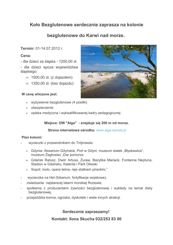 Koło Bezglutenowe serdecznie zaprasza na kolonie bezglutenowe do Karwi nad morze. Termin: 01-14.07.2012 r. Cena: - dla dzieci ze śląska - 1200,00 zł. - dla dzieci spoza województwa śląskiego: • 1500,00 zł. (z dojazdem) • 1350,00 zł. (bez dojazdu) W cenę wliczone jest: • wyżywienie bezglutenowe (4 posiłki) • ubezpieczenie • opieka medyczna i wykwalifikowanej kadry pedagogicznej Miejsce: DW "Alga" - znajduje się 200 m od morza. Strona internetowa ośrodka: www.alga-karwia.pl Plan kolonii: - wycieczki z przewodnikiem do Trójmiasta: • Gdynia: Akwarium Gdyńskie, Port w Gdyni, muzeum statek „Błyskawica”, muzeum Żaglowiec „Dar pomorza • Gdańsk Ratusz, Dwór Artusa, Żuraw, Bazylika Mariack, Fontanna Neptuna, Stadion w Gdańsku, Katerda i Park Oliwski • Sopot: molo, opera leśna, rejs statkiem pirackim,” - wycieczka na Hel (fokarium, fortyfikacje wojskowe), - zwiedzanie najstarszej latarni morskiej Rozewie, - spotkania z producentami żywności bezglutenowej i wykłady na temat diety bezglutenowej, - przejażdżka konna, ogniska, dyskoteki i wiele innych atrakcji. Serdecznie zapraszamy! Kontakt: Ilona Skucha 032/253 83 00