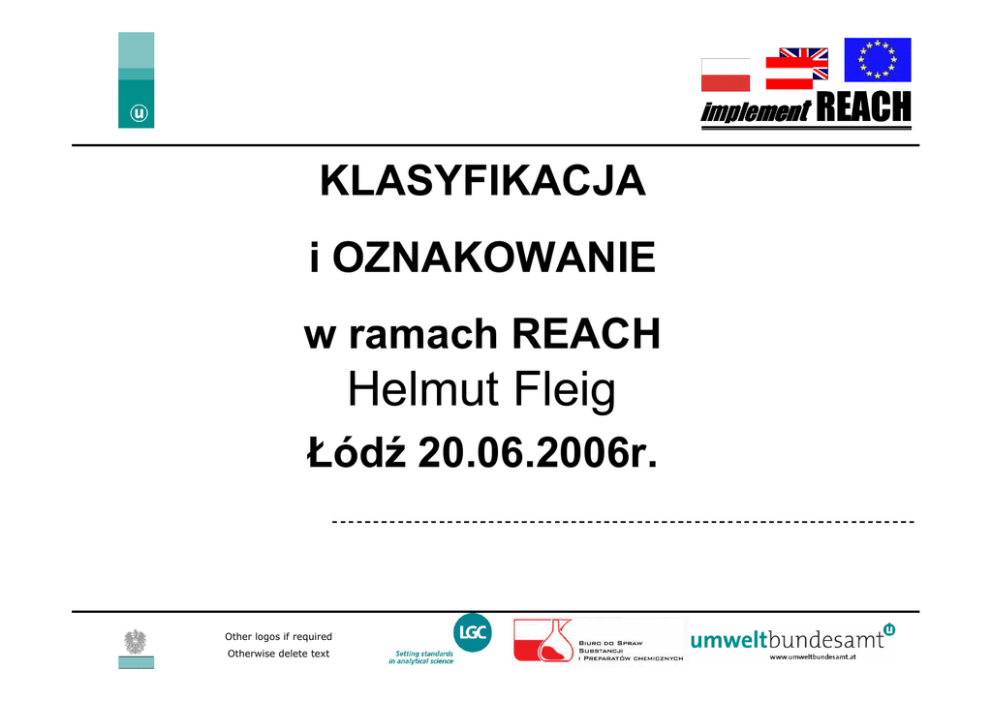 implement KLASYFIKACJA i OZNAKOWANIE w ramach REACH Helmut Fleig Łódź 20.06.2006r. Other logos if required Otherwise delete text REACH Klasyfikacja i Oznakowanie w ramach REACH - zarys Przepisy dotyczące Klasyfikacji i Oznakowania (C&L) Nowe Kryteria w oparciu o GHS Porównanie z obecnym Systemem Unijnym Wpływ Other logos if required Otherwise delete text implement REACH Odniesienia do Klasyfikacji i Oznakowania w Rozporządzeniu REACH implement REACH Cel Rozporządzenia REACH: Ochrona Zdrowia Ludzi i Środowiska • Narzędzia: Sposoby Zarządzania Ryzykiem w oparciu o • Ocenę Ryzyka / Bezpieczeństwa w oparciu o • Ocenę NaraŜenia i ZagroŜenia Cele Oceny ZagroŜenia: • Określenie Klasyfikacji i Oznakowania • Określenie DNEL Przypadki, gdy nie określa się DNEL, np: • ZagroŜenia wynikające z właściwości fizyko-chemicznych, Ŝrących/draŜniących • Stosowanie Klasyfikacji i Oznakowania Other logos if required Otherwise delete text Czym jest Klasyfikacja i Oznakowanie? implement REACH • Klasyfikacja i Oznakowanie: Skonsolidowana jakościowa Ocena ZagroŜenia obejmująca elementy Zarządzania Ryzykiem • Nowy system Klasyfikacji i Oznakowania (GHS): -Klasy/Zwroty wskazujące rodzaj zagroŜenia (UE: zwroty R) -Zwroty wskazujące środki ostroŜności (UE: zwroty S) • Przykłady: - Wywołuje powaŜne uszkodzenia oczu - Stosować osłonę oczu i twarzy -Wysoce łatwopalne płyny lub pary -Trzymać z dala od źródeł zapłonu takich jak …iskry Other logos if required Otherwise delete text Przepisy dotyczące Klasyfikacji i Oznakowania (1) implement REACH Zgłoszenie Klasyfikacji i Oznakowania podczas Rejestracji (§9, 109, 110) Jeśli nie ma konieczności Rejestracji: Zgłoszenie Klasyfikacji i Oznakowania do wykazu (§7) Zmiany w Klasyfikacji i Oznakowaniu(§20): Zgłoszenie uaktualnień ZróŜnicowana klasyfikacja (§35): Sprawozdawczość (dalszy uŜytkownik) Other logos if required Otherwise delete text Przepisy dotyczące Klasyfikacji i Oznakowania (2) implement REACH RBC: Ocena ZagroŜenia (§13) • Prezentacja Klasyfikacji i Oznakowania • Uzasadnienie dla proponowanej Klasyfikacji i Oznakowania • Powody – gdy brak klasyfikacji – dla których nie sklasyfikowano substancji/preparatu RBC = Raport Bezpieczeństwa Chemicznego Other logos if required Otherwise delete text Przepisy wynikające z Klasyfikacji substancji jako niebezpiecznej (1) implement REACH • Ocena Bezpieczeństwa Chemicznego obejmująca Ocenę NaraŜenia i Charakterystykę Ryzyka (§ 13) Uwaga: Brak zróŜnicowania ze względu na stopień zagroŜenia Other logos if required Otherwise delete text Przepisy wynikające z Klasyfikacji substancji jako niebezpiecznej (2)implement REACH Wymóg Karty Charakterystyki (§29) • Klasyfikacja i Oznakowanie obejmujące zwroty R (substancje i preparaty) • Spójność z wykazem Klasyfikacji i Oznakowania • Informacje w Transporcie, np. Grupa pakowania • Informacje obowiązkowe: Informacje dotyczące Zdrowia, Bezpieczeństwa i Środowiska zamieszczone na oznakowaniu Other logos if required Otherwise delete text Przepisy wynikające z klasyfikacji implement REACH substancji jako CMR kat 1 i 2 Ocena: (tytuł VI) - Priorytet - Ocena Protokołów Badań (równieŜ dla CMR kategorii 3) Zezwolenia: Wymóg (tytuł VII) Ograniczenia i Zakazy: Produkcja/Obrót (tytuł VIII) CMR=Carcinogen,Mutagen,Reproductive Toxicant Other logos if required Otherwise delete text Inne zagadnienia związane z Klasyfikacją i Oznakowaniem implement REACH Konsensus odnośnie Klasyfikacji i Oznakowania przez wszystkich producentów / importerów (SIEF*; §27, 110) Harmonizacja systemu Klasyfikacji i Oznakowania (§112) – CMRy i substancje działające uczulająco na układ oddechowy: UE – Inne parametry docelowe: przypadek za przypadkiem Wykaz Klasyfikacji i Oznakowania (Agencja; tytuł X) – Publiczny dostęp elektroniczny Publiczny dostęp do informacji o stopniu czystości susbtancji (zanieczyszczeniach), o ile jest to istotne dla Klasyfikacji i Oznakowania (§ 116) SIEF = Forum Wymiany Informacji nt. Substancji Other logos if required Otherwise delete text Wyłączenia w oparciu o Klasyfikację implement REACH Brak standardowych danych / Badania dla parametrów docelowych gdy sklasyfikowane jako... (np.) Parametr docelowy Klasyfikacja Toksyczność ostra (drogą pokarmową) substancja Ŝrąca V PodraŜnienie skóry (in vivo) – substancja Ŝrąca – substancja łatwopalna w temp. pokojowej – substancja bardzo toksyczna (T+) w kontakcie ze skórą VI Badanie rakotwórczości substancja mutagenna kat 1 lub 2 VII Badanie toksyczności reproduktywnej substancja rakotwórcza / mutagenna kat 1 lub 2 VIII Other logos if required Otherwise delete text Aneks Brak “GHS” w REACHu ?! implement REACH odwołuje się do obecnie obowiązujących przepisów dot. Klasyfikacji i Oznakowania: Substancje: 67/548/EEC Preparaty : 1999/45/EC Oświadczenie KE: Celem jest przyjęcie systemu GHS w tym samym czasie co REACH Uwaga: Niezbędne przyjęcie Nowych Kryteriów Klasyfikacji i Oznakowania! Other logos if required Otherwise delete text REACH Projekt KE Nowych Kryteriów w oparciu o system GHS implement REACH Przepisy prawne określające ogólne reguły i zasady Aneksy zawierające szczegółowe dane techniczne • Aneks I: Wymogi dot. Klasyfikacji i Oznakowania niebezpiecznych substancji i mieszanin • Aneks II: Specjalne zasady dot. oznakowania i pakowania • Aneks III: Wykaz zwrotów wskazujących rodzaj zagroŜenia (∆ zwroty R) • Aneks IV: Wykaz zwrotów wskazujących środki ostroŜności (∆ zwroty S) • Aneks V: Piktogramy • Aneks VI: Jednolita Lista Substancji Niebezpiecznych • Aneks VII: Tabela RównowaŜności Other logos if required Otherwise delete text Wpływ Nowych Kryteriów Klasyfikacji i Oznakowania (GHS) - Implementacjaimplement REACH Klasyfikacja Substancji i Mieszanin • Około 30,000 substancji w obrocie i około 2,000,000 mieszanin bę