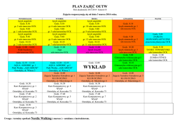 PLAN ZAJĘĆ OUTW Rok akademicki 2013/2014 Semestr II Zajęcia rozpoczynają się od dnia 3 marca 2014 roku. PONIEDZIAŁEK WTOREK ŚRODA Język angielski Godz. 8.30 gr. 2 sala taneczna OCK Godz. 9.00 gr. 1 sala kameralna OCK Język angielski Godz. 9.40 gr. 4 sala taneczna OCK Godz. 10.10 gr. 3 sala kameralna OCK Godz. 11.00 – 14.00 Klub brydżowy sala taneczna OCK Język angielski Godz. 8.30 gr. 6 sala taneczna OCK Godz. 9.00 gr. 5 sala kameralna OCK Język angielski Godz. 9.40 gr. 8 sala taneczna OCK Godz. 10.10 gr. 7 sala kameralna OCK Godz. 11.00 Joga sala taneczna OCK Język angielski Godz. 8.30 gr. 10 sala taneczna OCK Godz. 9.00 gr. 9 sala kameralna OCK Język angielski Godz. 9.40 gr. 12 sala taneczna OCK Godz. 10.10 gr. 11 sala kameralna OCK Godz. 11.00 Język rosyjski sala taneczna OCK Godz. 12.35 – 13.10 AQUA AEROBIC gr. 1 Park Wodny „AQUARIUM” Ostrołęka, ul. Witosa 3 Godz. 12.20 – 12.55 AQUA AEROBIC gr.1 Park Wodny „AQUARIUM” Ostrołęka, ul. Witosa 3 Godz. 14.00 Zajęcia Teatralno-Estradowe gr. 1 KLUB OCZKO Ostrołęka, ul. Sikorskiego 6 Godz. 16.30 Kurs Komputerowy gr. 4 WSAP Ostrołęka, ul. Korczaka 73 Godz. 17.40 Kurs Komputerowy gr. 5 WSAP Ostrołęka, ul. Korczaka 73 Godz. 12.00 Godz. 16.30 Kurs Komputerowy gr. 1 WSAP Ostrołęka, ul. Korczaka 73 Godz. 17.40 Kurs Komputerowy gr. 2 WSAP Ostrołęka, ul. Korczaka 73 Godz. 18.50 Kurs Komputerowy gr. 3 WSAP Ostrołęka, ul. Korczaka 73 WYKŁAD Godz. 14.00 Zajęcia Teatralno-Estradowe gr. 2 KLUB OCZKO Ostrołęka, ul. Sikorskiego 6 Godz. 16.30 Kurs Komputerowy gr. 6 WSAP Ostrołęka, ul. Korczaka 73 Godz. 17.40 Kurs Komputerowy gr. 7 WSAP Ostrołęka, ul. Korczaka 73 Uwaga : terminy spotkań Nordic Walking ( marsze ) - ustalane z instruktorem. CZWARTEK PIĄTEK Godz. 8.10 Język niemiecki gr. 1 sala taneczna OCK Godz. 9.20 Język niemiecki gr. 2 sala taneczna OCK Godz. 10.30 Język niemiecki gr. 3 sala taneczna OCK Godz. 9.00 Gimnastyka relaksacyjna gr.1 sala kameralna OCK Godz. 10.10 Gimnastyka relaksacyjna gr.2 sala kameralna OCK Godz. 14.00 Zajęcia Teatralno-Estradowe gr. 3 KLUB OCZKO Ostrołęka, ul. Sikorskiego 6 Godz. 9.00 ZAJĘCIA OGÓLNOPLASTYCZNE pracownia plastyczna OCK Godz. 9.30 TANIEC TOWARZYSKI sala kameralna OCK Godz. 11.00 ZUMBA FITNES sala kameralna OCK
