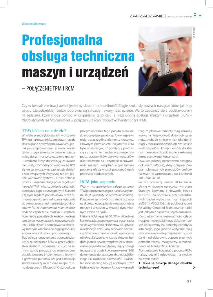 ZARZĄDZANIE | UTRZYMANIE RUCHU 1/2011 fot. Shutterstock WOJCIECH MĄCZYŃSKI Profesjonalna obsługa techniczna maszyn i urządzeń POŁĄCZENIE TPM I RCM Czy w kwestii eliminacji awarii jesteśmy skazani na bezsilność? Ciągle szuka się nowych narzędzi, które jak przy użyciu czarodziejskiej różdżki poprawią złą sytuację i awaryjność sprzętu. Warto zapoznać się z podstawowymi narzędziami, które mogą pomóc w osiągnięciu tego celu: z niezawodną obsługą maszyn i urządzeń (RCM – Reliability Centered Maintenance) w połączeniu z Total Productive Maintenance (TPM). TPM lekiem na całe zło? W wielu przedsiębiorstwach wdrożenie TPM jest traktowane jako antidotum na całe zło związane z przestojami i awariami, jednak po przeprowadzeniu szkoleń i warsztatów z tego zakresu (w głównej mierze polegających na wyczyszczeniu maszyn i urządzeń) firmy stwierdzają, że awarie nie ustały. Dochodzą do wniosku, że TPM się nie sprawdza, więc zaprzestają działań z nim związanych. Przyczyną nie jest jednak wadliwość systemu, a nieudolność procesu implementacji poszczególnych narzędzi TPM i niezrozumienie zależności pomiędzy jego poszczególnymi filarami. Częstym błędem popełnianym przez firmy jest ograniczenie wdrażania wyłącznie do pierwszego z siedmiu istniejących kroków w filarze Autonomous Maintenance, czyli do czyszczenia maszyn i urządzeń. Pominięcie pozostałych kroków skutkuje tym, że po wyczyszczeniu maszyny, naklejeniu kilku etykiet i odmalowaniu obudowy maszyna włączona do ciągłej produkcji szybko wraca do stanu poprzedniego. Błąd polega na przypisaniu odpowiedzialności za wdrażanie TPM w przedsiębiorstwie służbom utrzymania ruchu, co na samym starcie prowadzi do nieuniknionej porażki procesu implementacji. Jednym z głównych punktów AM jest eliminacja źródeł zanieczyszczeń oraz miejsc trudno dostępnych. Dlaczego? Otóż podczas przeprowadzania tego punktu pierwsze skrzypce grają operatorzy. To oni usprawniają poszczególne elementy maszyny. Głównym przesłaniem inicjatorów TPM było obalenie „muru” pomiędzy produkcją a utrzymaniem ruchu, oraz wzajemna praca pracowników obydwu wydziałów ukierunkowana na utrzymanie niezawodności maszyn i urządzeń, a tym samym poprawę efektywności poszczególnych procesów produkcyjnych. RCM jako wsparcie Ważnym uzupełnieniem całego systemu TPM jest rozszerzenie go o narzędzia systemu RCM (Reliability Centered Maintenance). Połączenie tych dwóch strategii pozwala na skuteczne zarządzanie niezawodnością maszyn i urządzeń w sytuacji dynamicznych zmian na rynku. Historia RCM sięga lat 60. XX w. Wcześniej konserwacja zapobiegawcza ograniczała się do wymieniania elementów po upływie określonego czasu, aby zapewnić bezpieczeństwo oraz niezawodność operacyjną obiektu. Założenie, w istocie słuszne, budziło jednak pewne wątpliwości w stosowaniu go jako bezwzględnej reguły. Uwagi te zawarto w opublikowanym w roku 1968 dokumencie dotyczącym eksploatacji Boeinga 747 o roboczej nazwie MSG-1 (Maintenance Steering Group), wydanym przez Federal Aviation Agency. Autorzy wysunęli tezę, że planowe remonty mają znikomy wpływ na niezawodność złożonych systemów, chyba że istnieje w nich jakiś dominujący rodzaj uszkodzenia, oraz że istnieje wiele zespołów i komponentów, dla których nie można określić żadnej efektywnej formy planowanej konserwacji. Dwa lata później opracowano następny dokument (MSG-2), który opisywał program planowanych przeglądów profilaktycznych w zastosowaniu do Lockhead 1011 oraz DC 10. Po raz pierwszy nazwa RCM znalazła się w raporcie opracowanym przez Stanleya Nowlana i Howarda Heapa w 1978 r., na podstawie przeprowadzonych badań wytycznych wynikających z MSG 1 i MSG 2. Od dnia publikacji raport Reliability Centered Maintenance nadal jest jednym z najważniejszych dokumentów o utrzymaniu niezawodności całego majątku trwałego. Mimo że dokument został opracowany na potrzeby przemysłu lotniczego, jego główne wytyczne mają zastosowanie w różnych gałęziach gospodarki – od elektrowni, poprzez przemysły petrochemiczny, maszynowy, samochodowy, na branży FMCG kończąc. Aby skutecznie korzystać z procesu RCM, należy udzielić odpowiedzi na siedem ważnych pytań: 1. Jakie są funkcje danego obiektu technicznego? 31 UTRZYMANIE RUCHU 1/2011 | ZARZĄDZANIE fot. Shutterstock Aby właściwie określić funkcje obiektu, należy dokonać jego podziału funkcjonalnego zgodnie z zasadą „od ogółu do szczegółu”. Po dokonaniu podziału wymagane jest określenie poszczególnych funkcji na każdym poziomie. Zadanie to ma bezpośredni wpływ na pozostałe kroki analizy RCM, np. funkcję pompy (jako jednego z elementów złożonego obiektu), można określić ją następująco: ma ona pompować ciecz z ciśnieniem 200 barów ±10 barów, 1000 l/h. 2. Jakie uszkodzenia funkcjonalne mogą pojawić się w obiekcie? Celem jest zidentyfikowanie wszelkich sytuacji awaryjnych, uszkodzeń, odchyleń powodujących utratę funkcjonalności analizowanego obiektu. Uszkodzenia mogą być częściowe i nie oznaczać całkowitej utraty funkcjonalności danego obiektu. Opisana poprzednio pompa może podlegać m.in. następującym uszkodzeniom funkcjonalnym: • pompowanie cieczy z tolerancją większą/mniejszą aniżeli ±10 barów, • pompowanie cieczy poniżej 1000 l/h, • pompowanie cieczy powyżej 1000 l/h. Przy określaniu uszkodzeń funkcjonalnych należy uwzględnić uszkodzenia, które wystąpiły w przeszłości, uszkodzenia uwzględnione w innych dokonywanych analizach oraz uszkodzenia, których wystąpienie jest wysoce prawdopodobne, choć w przeszłości nie występowały. 3. Co powoduje powstawanie każdego uszkodzenia funkcjonalnego (symptomy uszkodzeń)? Należy wymienić wszystkie potencjalne przyczyny powstawania uszkodzeń wymienionych poprzednio. Kluczowe jest powiązanie poszczeg