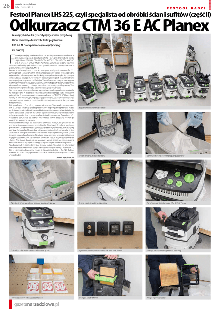 26 gazeta narzędziowa luty - marzec 2016 festool radzi Festool Planex LHS 225, czyli specjalista od obróbki ścian i sufitów (część II) Odkurzacz CTM 36 E AC Planex W niniejszych artykule z cyklu dotyczącego szlifierki przegubowej Planex omawiamy odkurzacze Festool i specjalny model CTM 36 E AC Planex przeznaczony do współpracujący z tą maszyną. F estool jako jedyny producent elektronarzędzi wytwarza własne odkurzacze przemysłowe i posiada bogatą ich ofertę. Fot. 1. przedstawia tylko część z niej (od lewej: CTL MIDI, CTM 36 LE, CTM 48 EC B22, CTH 26 E, CTM 36 AC HD, CTL 26 E, CTM 36 E AC, CTM 36 E AC Planex). Odkurzacze te różnią się wyposażeniem, wielkością i spełnianiem norm czystości powietrza, które wyznaczone są przez unijne normy klas pyłu (L, M i H). Festool w tych urządzeniach stosuje dwa systemy odsysania: otwarty (fot. 2.) i zamknięty (fot. 5.). W pierwszym z nich urobek zasysany jest do foliowego worka odpowiednio założonego w zbiorniku, który po napełnieniu zamyka się opaską zaciskową (fot. 3.), zaś jego otwór wlotowy – specjalną zasuwą (fot. 4.). System otwarty wykorzystuje się przy włączonej funkcji AC (AutoClean – automatyczne otrzepywanie filtra głównego). W przypadku systemu zamkniętego cały zassany urobek trafia do worka 2-warstwowego, który po napełnieniu zamyka się specjalną zasuwą. Worki z urobkiem w przypadku obu systemów oddaje się do utylizacji. Wszystkie swoje odkurzacze Festool wyposaża w czytelne panele sterowania (fot. 6). Różnią się one w zależności od wyposażenia technicznego liczbą funkcyjnych pokręteł. Fot. 6. przestawia panel sterowania odkurzacza CTM 36 E AC Planex. Znajdziemy w nim: włącznik, płynną regulację podciśnienia, ustawianie średnicy węża ssącego i płynną regulację częstotliwości czasowej otrzepywania (oczyszczania) filtra głównego. Każdy z odkurzaczy Festool przystosowany jest do współpracy z elektronarzędziami (fot. 7.). Do tego celu służy gniazdo przeznaczone do podłączenia przewodu maszyny. Jest ono częścią elektronicznego układu automatycznego uruchamiania i wyłączania odkurzacza. Układ ten ma funkcję łagodnego rozruchu i opóźnia załączenie turbiny w stosunku do momentu uruchomienia elektronarzędzia. Opóźnia też o 5 s wyłączenie odkurzacza, co pozwala mu odessać urobek zalegający w wężu po uprzednim wyłączeniu maszyny. Obok gniazda służącego do podłączenia przewodu maszyn jest gniazdo do zamontowania jednego z czterech modułów (fot. 8.), od lewej: (1) zasilania sprężonym powietrzem, (2) wysięgnika zasilającego, (3) gniazda wtykowego z automatyką włączenia/wyłączania lub (4) gniazda wtykowego ze stałym dopływem prądu. Festool zadbał także o bezpieczne i zajmujące niewiele miejsca przechowywanie 7,5-metrowego przewodu odkurzacza. Nawija się go na specjalny uchwyt znajdujący się w jego wyposażeniu (fot. 9.). Niemiecki producent stosuje 3-żyłowe przewody zasilające. Żyła służąca do uziemienia wykorzystywana jest także do odprowadzania ładunków elektrostatycznych powstających podczas pracy elektronarzędziami. W odkurzaczach Festool wykorzystuje się różne rodzaje filtrów (fot. 10.). Ich montaż/ demontaż jest bardzo łatwy i polega na wpięciu/wypięciu kasety z filtrem (fot. 11.). Filtr w zależności od operacji wyjmuje się lub wkłada do kasety (fot. 12.). Budowę wewnętrzną odkurzaczy i pozostałe ich funkcje omówimy w następnym odcinku „Festool radzi”. Sławomir Trojan (Festool), pins Bogata oferta odkurzaczy Festool System otwarty zbierania urobku Zamykanie worka otwartego opaską zaciskową Zamykanie otworu worka za pomocą specjalnej zasuwy System zamknięty zbierania urobku Panel sterowania odkurzacza CTM 36 E AC Planex Gniazdo podłączenia przewodu elektronarzędzia Wymienne moduły stosowane w odkurzaczach Festool Uchwyt na 7,5-metrowy przewód zasilający Filtry stosowane w odkurzaczach Festool Wypięcie kasety z filtrem Filtr po wyjęciu z kasety gazetanarzedziowa.pl