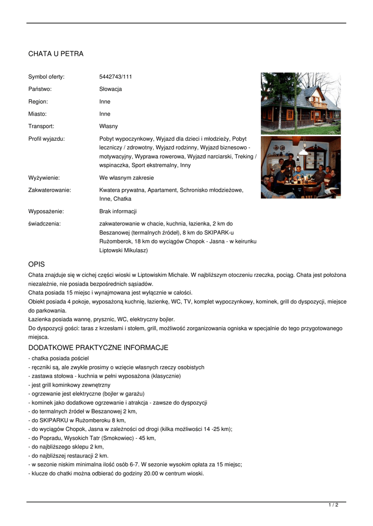 CHATA U PETRA Symbol oferty: 5442743/111 Państwo: Słowacja Region: Inne Miasto: Inne Transport: Własny Profil wyjazdu: Pobyt wypoczynkowy, Wyjazd dla dzieci i młodzieży, Pobyt leczniczy / zdrowotny, Wyjazd rodzinny, Wyjazd biznesowo - motywacyjny, Wyprawa rowerowa, Wyjazd narciarski, Treking / wspinaczka, Sport ekstremalny, Inny Wyżywienie: We własnym zakresie Zakwaterowanie: Kwatera prywatna, Apartament, Schronisko młodzieżowe, Wyposażenie: Brak informacji świadczenia: zakwaterowanie w chacie, kuchnia, łazienka, 2 km do Inne, Chatka Beszanowej (termalnych źródeł), 8 km do SKIPARK-u Rużomberok, 18 km do wyciągów Chopok - Jasna - w keirunku Liptowski Mikulasz) OPIS Chata znajduje się w cichej części wioski w Liptowiskim Michale. W najbliższym otoczeniu rzeczka, pociąg. Chata jest położona niezależnie, nie posiada bezpośrednich sąsiadów. Chata posiada 15 miejsc i wynajmowana jest wyłącznie w całości. Obiekt posiada 4 pokoje, wyposażoną kuchnię, łazienkę, WC, TV, komplet wypoczynkowy, kominek, grill do dyspozycji, miejsce do parkowania. Łazienka posiada wannę, prysznic, WC, elektryczny bojler. Do dyspozycji gości: taras z krzesłami i stołem, grill, możliwość zorganizowania ogniska w specjalnie do tego przygotowanego miejsca. DODATKOWE PRAKTYCZNE INFORMACJE - chatka posiada pościel - ręczniki są, ale zwykle prosimy o wzięcie własnych rzeczy osobistych - zastawa stołowa - kuchnia w pełni wyposażona (klasycznie) - jest grill kominkowy zewnętrzny - ogrzewanie jest elektryczne (bojler w garażu) - kominek jako dodatkowe ogrzewanie i atrakcja - zawsze do dyspozycji - do termalnych źródeł w Beszanowej 2 km, - do SKIPARKU w Rużomberoku 8 km, - do wyciągów Chopok, Jasna w zależności od drogi (kilka możliwości 14 -25 km); - do Popradu, Wysokich Tatr (Smokowiec) - 45 km, - do najbliższego sklepu 2 km, - do najbliższej restauracji 2 km. - w sezonie niskim minimalna ilość osób 6-7. W sezonie wysokim opłata za 15 miejsc; - klucze do chatki można odbierać do godziny 20.00 w centrum wioski. 1/2 DOKUMENTY PODRÓŻY Po otrzymaniu pełnej wpłaty wysyłamy: - vocher pobytowy - mapkę dojazdową - dodatkowe atrakcje wynegocjowane z gospodarzami. - weekendy objęte są specjalną promocją cenową INFORMACJE NASZEGO PARTNERA ZE SŁOWACJI Chata na skraju miejscowości. 4-osobowy pokój z dostawką, pokój gościnny z trzema łóżkami, dostawką, kominkiem i kolorową telewizją, na piętrze dwa pokoje max. 4-osobowe. Razem 15 miejsc. W ciągu roku minimalna ilość osób zakwaterowanych 8, w sylwestra minimum 15 osób. Dodatkowo chata posiada łazienkę, WC, kuchnię (kuchenka gazowa, lodówka, ekspres do kawy), ognisko, rożen w ogrodzie. Elektryczne CO. Zimą poza sezonem dopłata za energię 100,- Sk/ dzień. Sklep 300m. Autobus 1km. Pociąg (Stacja kolejowa Liptovská Teplá) 3km. TERMINY: od: 2017-11-04 do: 2017-11-11 (8 dni), miejsca: zamów cena od: 225 PLN od: 2017-11-04 do: 2017-11-18 (15 dni), miejsca: zamów cena od: 450 PLN od: 2017-11-11 do: 2017-11-18 (8 dni), miejsca: zamów cena od: 225 PLN od: 2017-11-11 do: 2017-11-25 (15 dni), miejsca: zamów cena od: 450 PLN od: 2017-11-18 do: 2017-11-25 (8 dni), miejsca: zamów cena od: 225 PLN od: 2017-11-18 do: 2017-12-02 (15 dni), miejsca: zamów cena od: 450 PLN od: 2017-11-25 do: 2017-12-02 (8 dni), miejsca: zamów cena od: 225 PLN od: 2017-11-25 do: 2017-12-09 (15 dni), miejsca: zamów cena od: 450 PLN od: 2017-12-02 do: 2017-12-09 (8 dni), miejsca: zamów cena od: 225 PLN od: 2017-12-14 do: 2017-12-18 (5 dni), miejsca: zamów cena od: 325 PLN CENNIK: Długość pobytu: 8 dni 15 dni 5 dni Grupa cenowa: A2003 A2003 S4 225 450 325 Pobyt w obiekcie (do wyboru) (*) miejsce turystyczne - schronisko Waluta: PLN Aktualne ceny z systemu S.A.R.T. (-) - cena usługi, podatku kalkulowana przy osobie lub gratis (*) - kwota wliczona w cenę standardową 2/2