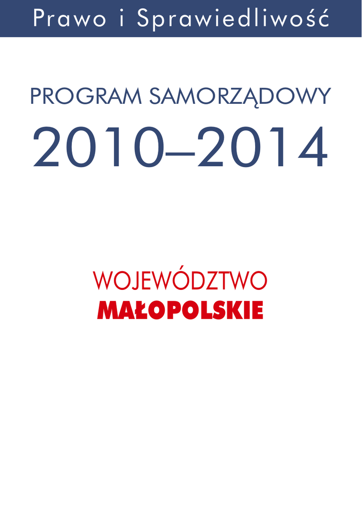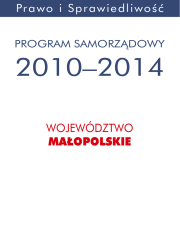 Pra w o i Sprawie d l i w o ś ć PROGRAM SAMORZĄDOWY 2010–2014 województwo małopolskie Spis treści Wprowadzenie��������������������������������������������������������������������������������������������������������� 4 Budżet województwa������������������������������������������������������������������������������������������������� 7 Fundusze unijne����������������������������������������������������������������������������������������������������� 12 Współpraca międzynarodowa ��������������������������������������������������������������������������������� 18 Gospodarka����������������������������������������������������������������������������������������������������������� 21 Infrastruktura ����������������������������������������������������������������������������������������������������������27 Kultura i dziedzctwo kulturowe����������������������������������������������������������������������������������36 Edukacja i nauka����������������������������������������������������������������������������������������������������40 Służba zdrowia��������������������������������������������������������������������������������������������������������47 Polityka społeczna����������������������������������������������������������������������������������������������������54 Rolnictwo i obszary wiejskie��������������������������������������������������������������������������������������59 Bezpieczeństwo publiczne ����������������������������������������������������������������������������������������64 Turystyka i rekreacja������������������������������������������������������������������������������������������������68 2 Program Samorządowy 2010–2014 Wstęp 21 listopada Polacy wybiorą nowe władze samorządowe wszystkich szczebli od gmin poprzez miasta i powiaty po sejmiki wojewódzkie. Prawo i Sprawiedliwość z pełnym zaangażowaniem bierze udział w tych ważnych dla Polaków wyborach. Przedstawiamy naszych kandydatów na prezydentów, burmistrzów, wójtów, radnych gminnych, powiatowych i wojewódzkich. Są wśród nich zarówno ci, którzy już skutecznie pełnili te funkcje, jak i wielu nowych, często młodych ludzi, pragnących służyć swym lokalnym społecznościom. Chcemy, aby w samorządach wszystkich szczebli było jak najwięcej osób kompetentnych, uczciwych, potrafiących wsłuchiwać się w oczekiwania swych współmieszkańców i rozumiejących potrzeby ludzi, których będą reprezentować. Wszystkich kandydatów Prawa i Sprawiedliwości łączy program samorządowy adresowany do wszystkich ludzi, nastawiony na rozwiązywanie ich codziennych problemów, niezależnie od miejsca ich występowania. Polska równych szans to kraj, który nie może być podzielony na obszary coraz bogatsze i pozostające w tyle – najczęściej małe miasta i wsie. Dla przedstawionej w programie polityki rozwoju ważne są wszystkie regiony, wszystkie gminy i miejscowości. Rozwinięciem ogólnopolskiego programu samorządowego jest 16 propozycji programów wojewódzkich. W ten sposób rozpoczynamy debatę samorządową, do udziału której zapraszamy wszystkich mieszkańców regionu. Województwo Małopolskie 3 Prawo i Sprawiedliwość Wprowadzenie „Samorząd terytorialny oznacza prawo i zdolność społeczności lokalnych, w granicach określonych prawem, do kierowania i zarządzania zasadniczą częścią spraw publicznych na ich własną odpowiedzialność i w interesie ich mieszkańców” (Europejska Karta S