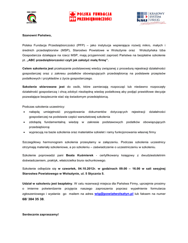 ISO 9001 ZETOM-CERT Szanowni Państwo, Polska Fundacja Przedsiębiorczości (PFP) – jako instytucja wspierająca rozwój mikro, małych i średnich przedsiębiorstw (MSP), Starostwo Powiatowe w Wolsztynie oraz Wolsztyńska Izba Gospodarcza działające na rzecz MSP, mają przyjemność zaprosić Państwa na bezpłatne szkolenie pt. „ABC przedsiębiorczości czyli jak założyć małą firmę”. Celem szkolenia jest przekazanie podstawowej wiedzy związanej z procedurą rejestracji działalności gospodarczej oraz z zakresu podatków obowiązujących przedsiębiorcę na podstawie przepisów podatkowych i przykładów z życia gospodarczego. Szkolenie skierowane jest do osób, które zamierzają rozpocząć lub niedawno rozpoczęły działalność gospodarczą i chcą zdobyć niezbędną wiedzę podatkową aby podjąć prawidłowe decyzje pozwalające bezpiecznie stać się świadomym przedsiębiorcą. Podczas szkolenia uczestnicy: nabędą umiejętność przygotowania dokumentów dotyczących rejestracji działalności gospodarczej na podstawie części warsztatowej szkolenia zdobędą fundamentalną wiedzę w zakresie podstawowych podatków obowiązujących przedsiębiorcę wypracują na bazie szkolenia oraz materiałów szkielet i ramy funkcjonowania własnej firmy Szczegółowy harmonogram szkolenia przesyłamy w załączeniu. Podczas szkolenia uczestnicy otrzymają materiały szkoleniowe, a po szkoleniu – zaświadczenie o uczestniczeniu w szkoleniu. Szkolenie poprowadzi pani Beata Kuśmierek - certyfikowany księgowy z dwudziestoletnim doświadczeniem, praktyk, właścicielka biura rachunkowego. Szkolenie odbędzie się w czwartek, 04.10.2012r. w godzinach 09.00 – 16.00 w sali sesyjnej Starostwa Powiatowego w Wolsztynie, ul. 5 Stycznia 5. Udział w szkoleniu jest bezpłatny. W celu rezerwacji miejsca dla Państwa Firmy, uprzejmie prosimy o imienne potwierdzenie przyjęcia naszego zaproszenia poprzez wypełnienie formularza zgłoszeniowego i wysłanie go mailem na adres [email protected] lub faksem na numer 68/ 384 35 38. Serdecznie zapraszamy! ZETOM-CERT Program szkolenia „ABC przedsiębiorczości czyli jak założyć małą firmę” Temat zajęć Godzina 09.00 – 09.15 Powitanie uczestników i wprowadzenie 09.15 – 10.30 URUCHOMIENIE DZIAŁALNOŚCI GOSPODARCZEJ Rejestracja działalności gospodarczej . Wybór formy opodatkowania. Zgłoszenie do Zakładu Ubezpieczeń Społecznych. Rejestracja do podatku od towarów i usług. 10.30 – 10.45 Przerwa 10.45 – 12.15 PODSTAWY PODATKU DOCHODOWEGO OD OSÓB FIZYCZNYCH Źródła przychodów w działalności gospodarczej. Koszty stanowiące i niestanowiące koszty uzyskania przychodu. Podstawowe zasady amortyzacji środków trwałych. Obliczenie zobowiązania podatkowego. 12.15 – 12.45 Przerwa 12.45 – 14.15 PODSTAWY PODATKU OD TOWARÓW I USŁUG Podatek należny i naliczony. Zwolnienia podmiotowe i przedmiotowe. Powstanie obowiązku podatkowego. Terminy odliczenia podatku naliczonego. Rejestry i deklaracje podatkowe. Działalność mieszana, ustalenie proporcji i roczna korekta. 14.15 – 14.30 Przerwa 14.30 – 16.00 INFORMACJE UZUPEŁNIAJĄCE Kasy fiskalne. Interpretacje podatkowe. 16.00 Zakończenie szkolenia