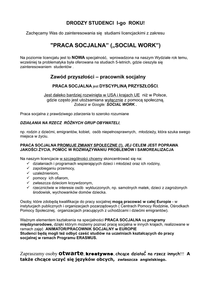DRODZY STUDENCI I-go ROKU! Zachęcamy Was do zainteresowania się studiami licencjackimi z zakresu "PRACA SOCJALNA” („SOCIAL WORK”) Na poziomie licencjatu jest to NOWA specjalność, wprowadzona na naszym Wydziale rok temu, wcześniej ta problematyka była oferowana na studiach 5-letnich, gdzie cieszyła się zainteresowaniem studentów . Zawód przyszłości – pracownik socjalny PRACA SOCJALNA jest DYSCYPLINĄ PRZYSZŁOŚCI. Jest daleko bardziej rozwinięta w USA i krajach UE niż w Polsce, gdzie często jest utożsamiana wyłącznie z pomocą społeczną. Zobacz w Google: SOCIAL WORK . Praca socjalna z prawdziwego zdarzenia to szeroko rozumiane DZIAŁANIA NA RZECZ RÓŻNYCH GRUP OBYWATELI, np. rodzin z dziećmi, emigrantów, kobiet, osób niepełnosprawnych, młodzieży, która szuka swego miejsca w życiu. PRACA SOCJALNA PROMUJE ZMIANY SPOŁECZNE (!), JEJ CELEM JEST POPRAWA JAKOŚCI ŻYCIA, POMOC W ROZWIĄZYWANIU PROBLEMÓW I SAMOREALIZACJA Na naszym licencjacie w szczególności chcemy skoncentrować się na:  działaniach i programach wspierających dzieci i młodzież oraz ich rodziny,  zapobieganiu przemocy,  uzależnieniom,  pomocy ich ofiarom,  zwłaszcza dzieciom krzywdzonym,  rzecznictwie w interesie osób wykluczonych, np. samotnych matek, dzieci z zagrożonych środowisk, wychowanków domów dziecka. Osoby, które zdobędą kwalifikacje do pracy socjalnej mogą pracować w całej Europie - w instytucjach publicznych i organizacjach pozarządowych ( Centrach Pomocy Rodzinie, Ośrodkach Pomocy Społecznej, organizacjach pracujących z uchodźcami i dziećmi emigrantów). Ważnym elementem kształcenia na specjalności PRACA SOCJALNA są programy międzynarodowe, dzięki którym możemy poznać pracę socjalna w innych krajach, realizowane w ramach zajęć ANIMATOR/PRACOWNIK SOCJALNY w EUROPIE Studenci będą mogli też odbyć cześć studiów na uczelniach kształcących do pracy socjalnej w ramach Programu ERASMUS. Zapraszamy osoby otwarte, kreatywne, chcące działaĆ na rzecz innych!!! A także chcące uczyć się języków obcych, zwłaszcza angielskiego.