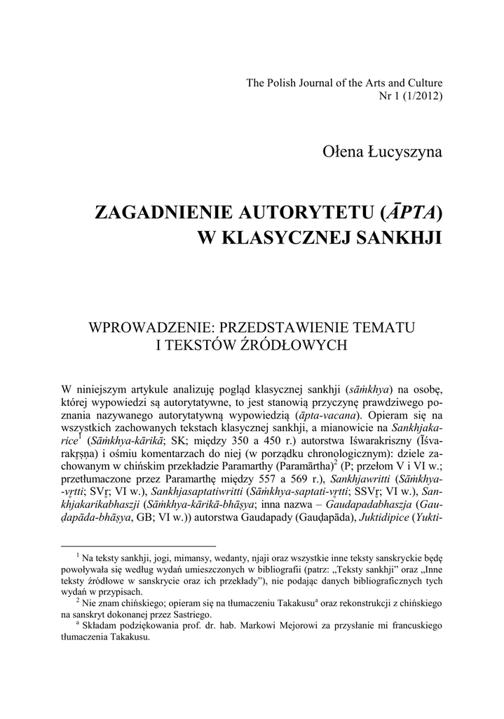 The Polish Journal of the Arts and Culture Nr 1 (1/2012) Ołena Łucyszyna ZAGADNIENIE AUTORYTETU (ĀPTA) W KLASYCZNEJ SANKHJI WPROWADZENIE: PRZEDSTAWIENIE TEMATU I TEKSTÓW ŹRÓDŁOWYCH W niniejszym artykule analizuję pogląd klasycznej sankhji (sāṁkhya) na osobę, której wypowiedzi są autorytatywne, to jest stanowią przyczynę prawdziwego poznania nazywanego autorytatywną wypowiedzią (āpta-vacana). Opieram się na wszystkich zachowanych tekstach klasycznej sankhji, a mianowicie na Sankhjakarice1 (Sāṁkhya-kārikā; SK; między 350 a 450 r.) autorstwa Iśwarakriszny (Īśvarakrṣṇa) i ośmiu komentarzach do niej (w porządku chronologicznym): dziele zachowanym w chińskim przekładzie Paramarthy (Paramārtha)2 (P; przełom V i VI w.; przetłumaczone przez Paramarthę między 557 a 569 r.), Sankhjawritti (Sāṁkhya-vrtti; SVr; VI w.), Sankhjasaptatiwritti (Sāṁkhya-saptati-vrtti; SSVr; VI w.), Sankhjakarikabhaszji (Sāṁkhya-kārikā-bhāṣya; inna nazwa – Gaudapadabhaszja (Gauḍapāda-bhāṣya, GB; VI w.)) autorstwa Gaudapady (Gauḍapāda), Juktidipice (Yukti- 1 Na teksty sankhji, jogi, mimansy, wedanty, njaji oraz wszystkie inne teksty sanskryckie będę powoływała się według wydań umieszczonych w bibliografii (patrz: „Teksty sankhji” oraz „Inne teksty źródłowe w sanskrycie oraz ich przekłady”), nie podając danych bibliograficznych tych wydań w przypisach. 2 Nie znam chińskiego; opieram się na tłumaczeniu Takakusua oraz rekonstrukcji z chińskiego na sanskryt dokonanej przez Sastriego. a Składam podziękowania prof. dr. hab. Markowi Mejorowi za przysłanie mi francuskiego tłumaczenia Takakusu. 28 Ołena Łucyszyna ____________________________________________________________________________________________________________________________________________________________________________________________________________________________________________ dīpikā; YD; VII w.)3, Dźajamangali (Jaya-maṅgalā; JM; przełom VII i VIII w. lub później), Matharawritti (Māṭhara-vrtti; MV; przełom VIII i IX w. lub później) autorstwa Mathary (Māṭhara), Tattwakaumudi (Tattva-kaumudī; TK; 850 lub 975 r.) autorstwa Waćaspatiego Miśry (Vācaspati Miśra)4. Po TK następuje długi okres stagnacji w rozwoju sankhji, kończący się w XIV w. pojawieniem się jej nowych (poklasycznych) form i tekstów. Pogląd sankhji klasycznej na autorytet epistemiczny rekonstruuję na podstawie komentarzy do trzech karik (kārikā) SK (4, 5 i 6) poświęconych źródłom prawdziwego poznania. Sankhja to jeden z systemów filozofii indyjskiej uznających autorytet Wed. Przyjmuje ona trzy źródła prawdziwego poznania (pramāṇa): postrzeżenie (drṣṭa, pratyakṣa), wnioskowanie (anumāna) i autorytatywną wypowiedź (āpta-vacana). Każde z nich ma niezależny zakres obowiązywania. Z autorytatywnej wypowiedzi poznajemy takie przedmioty, których nie da się poznać ani przez postrzeżenie, ani przez wnioskowanie, w tym również wnioskowanie sāmān at -drṣṭa5. Zakres obowiązywania autorytatywnej wypowiedzi obejmuje tylko przedmioty pozazmysłowe (parokṣa), nie należą do niego przedmioty dostępne postrzeżeniu zwykłych ludzi (zob. SK 6 wraz z komentarzami). Cechą charakterystyczną poznania z autorytatywnej wypowiedzi, stanowiącą jego specyfikę w porównaniu z innymi źródłami prawdziwego poznania, jest to, że zostaje spowodowane przez słowo, to jest przez zdanie językowe (wskazuje na to sama nazwa tej pramany – „autorytatywna wypowiedź”; zob. również komentarze klasycznej sankhji podające definicję autorytatywnej wypowiedzi jako szczególnego typu prawdziwego poznania6: YD 47, JM 5, TK 5). 3 O datowaniu YD zob. M. Mejor, S me Observati ns n the Date f the Yuktidīpikā (A propos of the New Edition), [w:] Essays in Indian Philosophy, Religion and Literature, eds. P. Balcerowicz, M. Mejor, Delhi 2004, s. 399–433. 4 Porządek chronologiczny oraz datowanie tekstów podaję według: G. J. Larson, The history and literature of Sāṁkhya, [w:] Encyclopedia of Indian Philosophies, eds. G. J. Larson, R. S. Bhattacharya, Vol. 4: Sāṁkhya. A Dualist Tradition in Indian Philosophy, Delhi, etc. 1987, s. 14–l8. 5 Sāmān at -drṣṭa (inna wersja pisowni tego terminu – sāmān at drṣṭa) to jeden z trzech typów wnioskowania sankhji. Sāmān at drṣṭam anumānam dosłownie znaczy ‘wnioskowanie [oparte na] dostrzeżeniu [czegoś] wspólnego’. Tłumaczone jest często jako ‘wnioskowanie przez analogię’. Wnioskowanie sāmān at -drṣṭa jest sposobem poznania rzeczy nadzmysłowych (atīndriya), to jest w ogóle niepostrzegalnych, ale mających jakąś poznawalną cechę wspólną z rzeczami postrzegalnymi, dzięki czemu można – na podstawie analogii do rzeczy postrzegalnych – wnioskować o innych cechach tych rzeczy niepostrzegalnych. Na mocy autorytatywnej wypowiedzi poznaje się takie rzeczy pozazmysłowe (parokṣa; w YD i JM używa się terminu atyantaparokṣa – ‘całkowicie pozazmysłowe’), które nie posiadają poznawalnej cechy wspólnej z rzeczami postrzegalnymi i dlatego nie mogą być poznawane przez wnioskowanie sāmānyat -drṣṭa (zob. SK 6 i komentarze do tej kariki). 6 Tylko niektóre teksty klasycznej sankhji zawierają definicję autorytatywnej wypowiedzi jako szczególnego typu prawdziwego poznania. Większość definicji (P 5, SVr 5, SSVr 5, GB 5, MV 5, YD 5, MV 4, JM 4) sprowadza się do przedstawienia źródeł jednostek językowych (to jest zdań) mających status autorytatywnych. Innymi słowy: komentatorzy sankhji w swoich definicjach najczęściej ujmują autorytatywną wypowiedź nie jako pewien typ prawdziwego poznania, a jako jednostkę językową. Zagadnienie autorytetu (āpta) w klasycznej sankhji 29 ____________________________________________________________________________________________________________________________________________________________________________