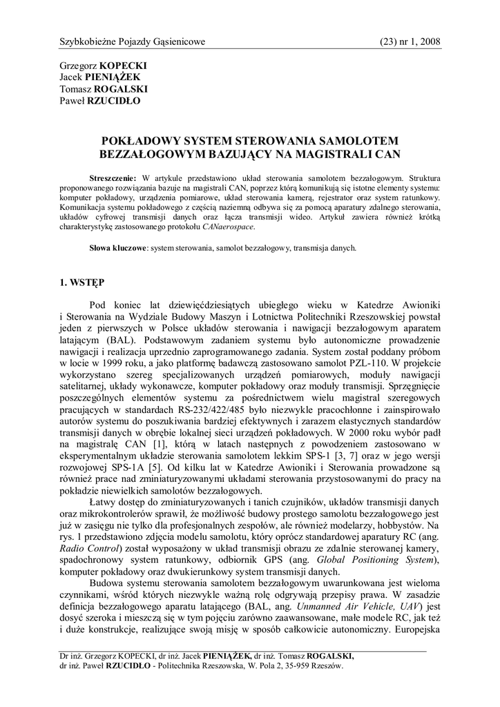 Szybkobieżne Pojazdy Gąsienicowe (23) nr 1, 2008 Grzegorz KOPECKI Jacek PIENIĄŻEK Tomasz ROGALSKI Paweł RZUCIDŁO POKŁADOWY SYSTEM STEROWANIA SAMOLOTEM BEZZAŁOGOWYM BAZUJĄCY NA MAGISTRALI CAN Streszczenie: W artykule przedstawiono układ sterowania samolotem bezzałogowym. Struktura proponowanego rozwiązania bazuje na magistrali CAN, poprzez którą komunikują się istotne elementy systemu: komputer pokładowy, urządzenia pomiarowe, układ sterowania kamerą, rejestrator oraz system ratunkowy. Komunikacja systemu pokładowego z częścią naziemną odbywa się za pomocą aparatury zdalnego sterowania, układów cyfrowej transmisji danych oraz łącza transmisji wideo. Artykuł zawiera również krótką charakterystykę zastosowanego protokołu CANaerospace. Słowa kluczowe: system sterowania, samolot bezzałogowy, transmisja danych. 1. WSTĘP Pod koniec lat dziewięćdziesiątych ubiegłego wieku w Katedrze Awioniki i Sterowania na Wydziale Budowy Maszyn i Lotnictwa Politechniki Rzeszowskiej powstał jeden z pierwszych w Polsce układów sterowania i nawigacji bezzałogowym aparatem latającym (BAL). Podstawowym zadaniem systemu było autonomiczne prowadzenie nawigacji i realizacja uprzednio zaprogramowanego zadania. System został poddany próbom w locie w 1999 roku, a jako platformę badawczą zastosowano samolot PZL-110. W projekcie wykorzystano szereg specjalizowanych urządzeń pomiarowych, moduły nawigacji satelitarnej, układy wykonawcze, komputer pokładowy oraz moduły transmisji. Sprzęgnięcie poszczególnych elementów systemu za pośrednictwem wielu magistral szeregowych pracujących w standardach RS-232/422/485 było niezwykle pracochłonne i zainspirowało autorów systemu do poszukiwania bardziej efektywnych i zarazem elastycznych standardów transmisji danych w obrębie lokalnej sieci urządzeń pokładowych. W 2000 roku wybór padł na magistralę CAN [1], którą w latach następnych z powodzeniem zastosowano w eksperymentalnym układzie sterowania samolotem lekkim SPS-1 [3, 7] oraz w jego wersji rozwojowej SPS-1A [5]. Od kilku lat w Katedrze Awioniki i Sterowania prowadzone są również prace nad zminiaturyzowanymi układami sterowania przystosowanymi do pracy na pokładzie niewielkich samolotów bezzałogowych. Łatwy dostęp do zminiaturyzowanych i tanich czujników, układów transmisji danych oraz mikrokontrolerów sprawił, że możliwość budowy prostego samolotu bezzałogowego jest już w zasięgu nie tylko dla profesjonalnych zespołów, ale również modelarzy, hobbystów. Na rys. 1 przedstawiono zdjęcia modelu samolotu, który oprócz standardowej aparatury RC (ang. Radio Control) został wyposażony w układ transmisji obrazu ze zdalnie sterowanej kamery, spadochronowy system ratunkowy, odbiornik GPS (ang. Global Positioning System), komputer pokładowy oraz dwukierunkowy system transmisji danych. Budowa systemu sterowania samolotem bezzałogowym uwarunkowana jest wieloma czynnikami, wśród których niezwykle ważną rolę odgrywają przepisy prawa. W zasadzie definicja bezzałogowego aparatu latającego (BAL, ang. Unmanned Air Vehicle, UAV) jest dosyć szeroka i mieszczą się w tym pojęciu zarówno zaawansowane, małe modele RC, jak też i duże konstrukcje, realizujące swoją misję w sposób całkowicie autonomiczny. Europejska Dr inż. Grzegorz KOPECKI, dr inż. Jacek PIENIĄŻEK, dr inż. Tomasz ROGALSKI, dr inż. Paweł RZUCIDŁO - Politechnika Rzeszowska, W. Pola 2, 35-959 Rzeszów. Grzegorz KOPECKI, Jacek PIENIĄŻEK, Tomasz ROGALSKI, Paweł RZUCIDŁO Agencja Bezpieczeństwa Lotniczego stoi na stanowisku, iż „wszelkie regulacje odnoszące się do samolotów konwencjonalnych muszą zostać uznane za obowiązujące dla UAV (...)” [2]. Z tego względu system sterowania samolotem bezzałogowym, niezależnie od klasy i przeznaczenia statku powietrznego, powinien odznaczać się m.in. wysokim stopniem bezpieczeństwa i niezawodności. Rys. 1. Model samolotu bezzałogowego PR-1 „Gacek” wykonany przez studentów Politechniki Rzeszowskiej (a), próba systemu ratunkowego (b) 2. STRUKTURA SYSTEMU STEROWANIA System sterowania samolotem bezzałogowym składa się z dwu segmentów: pokładowego systemu sterowania i stacji kontroli, które komunikują się z wykorzystaniem układów transmisji radiowej. System pokładowy jest odpowiedzialny za bieżące sterowanie oraz dostarczanie informacji o stanie samolotu do stacji kontroli. 2.1. System pokładowy Proces sterowania wiąże się z koniecznością dokonywania pomiarów zmiennych opisujących stan procesu sterowanego. Dla samolotu zmienne te są dostarczane przez wiele różnych urządzeń pomiarowych. Na rys. 2 zostały zaznaczone podstawowe elementy pomiarowe jakimi są: układ odniesienia AHRS (ang. Attitude Heading Reference System), układ nawigacji GPS oraz centrala aerometryczna (ang. Air Data Computer). Wymienione układy pomiarowe dostarczają informacje poprzez magistralę CAN do głównego sterownika systemu FCC (ang. Flight Control Computer) oraz do innych urządzeń, których zadaniem jest: ¾ rejestrowanie przebiegu lotu (REC), ¾ sterowanie kamerą (CAM), ¾ uruchomienie systemu ratunkowego (RES), ¾ monitorowanie i diagnozowanie systemu w trakcie badań naziemnych (EXTMON). Mechanizmy wykonawcze płaszczyzn sterowych mogą być sterowane bezpośrednio z komputera pokładowego poprzez magistralę CAN bądź drogą radiową z aparatury RC. W prezentowanym systemie połączenia pomiędzy głównymi elementami systemu zrealizowane są z wykorzystaniem magistrali CAN. Zastosowanie tej magistrali prowadzi do uzyskania rekonfigurowanej struktury systemu. Zmiana urządzeń na inne wymaga oczywiście Pokładowy system sterowania samolotem bezzałogowym bazujący na magistrali CAN zapewnienia zgodności programowej, co jest zapewnione poprzez przyjęty protokół transmisji opisany w rozdz. 3. Struktura systemu powinna umożliwiać w przyszłości na poszerzenie jego funkcjonal