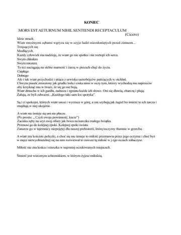 KONIEC MORS EST AETURNUM NIHIL SENTIENDI RECEPTACULUM (Cicero) Idzie strach. Wiatr mroźnymi zębami wgryza się w szyje ludzi nieosłoniętych przed zimnem... Trzęsących się Modlących. Każdy człowiek ma nadzieję, że wiatr go nie spotka i nie roztopi ich serca. Swym chłodem Swym mrozem. To też naciągają na siebie marność i żarzą w piecach chęć do życia. Ciepłego Dobrego Ale i tak wiatr przychodzi i strąca z urwiska samobójców patrzących w otchłań. Chwyta piasek zmrożony jak grudki lodu i ciska nimi w oczy tym, którzy wychodzą mu naprzeciw aby krzyknąć mu w twarz, że się go nie boją. Wiatr dmucha w ich gardła, zadusza i zgniata każde ich słowo. Oni się dławią, charczą i plują. Żałują, że byli odważni. „Każdego taki sam los spotyka”. Są i ci spokojni, których wiatr unosi i wyrzuca w górę, a oni szybują jak żagiel bo śmierć to ich tarcza i znajdują w niej ukojenie. A wiatr nie śmieje się ani nie płacze. (Po prostu: „ Czyń swoja powinność, kacie”) Zaciska zęby na szyi swej ofiary jak lwica na karczku małego lwiątka. Przenosi go do kolejnej epoki. Kolejnej epoki świata. Zanurza go w tajemnicy niepojętej dla naszej prehistorii, którą toczymy tłumnie w grzechu. A wiatr ma kościste policzki, a choć się nie śmieje to miłość przemawia przez jego oczyma i choć byś w męce niewyobrażalnej się na nim rozwiewał to zawsze tą miłość w j ego oczach zobaczysz. Miłość nie zna końca i mieszka w najmniej oczekiwanych miejscach. Śmierć jest wiecznym schroniskiem, w którym żyjesz miłością. DEUS VULT Z nieba spadł ognisty deszcz, z chmur mieniących się złotem. Spada na skórę, czepia się jak kleszcz. Ludzie w panice chłodzą się błotem. Ze wstydu , oszukani, za dużo oczekiwali , zbyt dużo pragnęli Myśleli, że żywioły im służą. Zbyt dużo, zbyt dużo chcieli. We krwi topią się deszczu krople. Rozpaleni, ukarani na kolanach. Włosy płoną, oczy płaczem mokre. „Niech śmierć złamie dumę w tych chamach!” Krzykną sprawiedliwi razem stłoczeni, lecz mniej cierpiący od nich. Od tych co teraz duszą się swym gazem. Od tych chciwych, jak diabeł złych. Już płomienie tańczą wokoło w czerwonym tańcu ognia żywego. Panika, ludzie biegają goło. Wskakują do jeziora jak stal gorącego. Smażą się w wodzie, we wrzątku, wpatrzeni w niebo, przeklinają siebie. A Ten, Wszechmogący, który zasiada w Niebie, nie może nic zrobić bo to w porządku. Deus et natura nihil faciunt frustra To nie On zgotował im ten los To człowiek człowiekowi zadaje cios Homo homini lapus Diabeł śmieje się za uchem morderców Diabeł pięknolicy i pięknie przemawiający Nasz zły duch, postrach innowierców Duch złych czynów, czynów w nicość wiodących Tylko w nim jest zło, nie w nas A co z ludźmi, którzy grzeszą? To wina słabości mas. Słabości, która tkwi w nas. Z DALA OD NIEJ Kiedyś mogłaś żyć, nieubrana w smak goryczy Śmiechem topiłaś lody zalegające w skałach nienawiści Suszyłaś łzy tonącym w wąskim strachu życia Swoją siła łamałaś drzewa wyrastające z kopców żalu Wypędzałaś czarne psy zemsty z myśli białego braterstwa Każde twe słowo unosiło dobro w górę, a zło strącało w dół Zabijało przerażenie szczelnie okrywające zbroją odwagę i moc A myśli powstałe od ciebie były czyste i proste jak to... ...że mam cię jedną, jedyną. Dziś cię nienawidzę !Bo jesteś niebezpieczna. Słuchałem cię i naraziłem moje życie Nie będę cię słuchał, boję się o moje życie. Dziś cię przekląłem! Bo jesteś odrętwiała. Jak stara schorowana kobieta na zimnym wietrze. A mogłem przekląć innych? Nie! Musiałem cię słuchać i stracić to co powinienem już przeżyć... Dziś cię nienawidzę! Dziś cię przekląłem! Już za tobą nie tęsknie! Bo wiem, że jesteś mi niepotrzebna. Nigdy nie będzie mi dane przeżyć to co przeżyć powinienem! Zniszczyłaś mnie !!! Głęboko zakorzeniłaś we mnie dobro ogółu. Nie będę za tobą tęsknił. Nie będę ci listów pisał. Nie będę żałował... Pogrzebałem cię obok innych. Obok tobie podobnych. Przejrzałem, że straciłem przez ciebie jedyna szansę Będę teraz żył bez ciebie bo dla mnie już znikłaś Będę żył razem ze skałami nienawiści, które zmiażdżą we mnie łagodność Będę żył razem z drzewami, które zasłonią mój żal Będę żył razem z tonącymi bo sam jestem jednym z nich Będę żył razem z psami zemsty, które wydrą ze mnie braterstwo Będę żył w zbroi przerażenia, która potroi we mnie złość, nienawiść i gniew Będę żył sam... Samotny ze studnią moich myśli przeklętych i wzgardzonych Pogrzebałem cię w sobie. Miejsce, w którym będziesz spoczywać Zarośnie czarnym polem zboża Nie postawie ci nagrobka Nie będziesz miała tablicy ze swym imieniem, po to, żebym zapomniał, że nazywałaś się miłością.