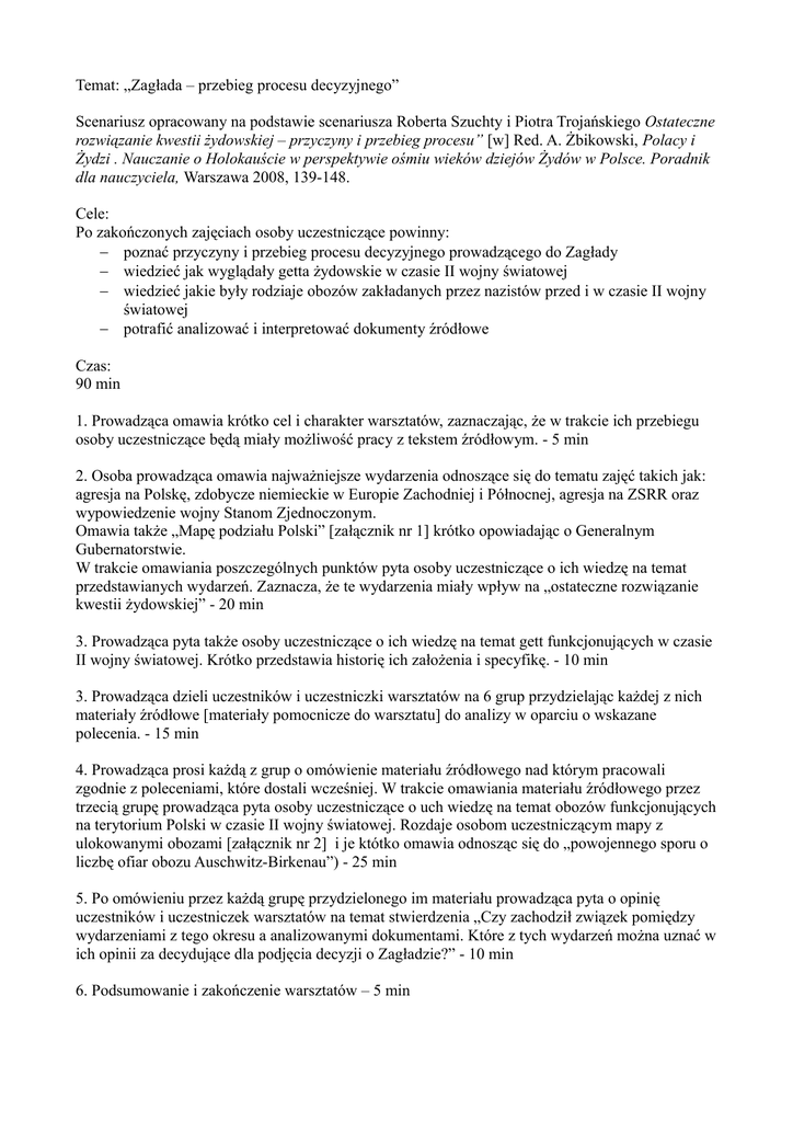Temat: „Zagłada – przebieg procesu decyzyjnego” Scenariusz opracowany na podstawie scenariusza Roberta Szuchty i Piotra Trojańskiego Ostateczne rozwiązanie kwestii żydowskiej – przyczyny i przebieg procesu” [w] Red. A. Żbikowski, Polacy i Żydzi . Nauczanie o Holokauście w perspektywie ośmiu wieków dziejów Żydów w Polsce. Poradnik dla nauczyciela, Warszawa 2008, 139-148. Cele: Po zakończonych zajęciach osoby uczestniczące powinny: − poznać przyczyny i przebieg procesu decyzyjnego prowadzącego do Zagłady − wiedzieć jak wyglądały getta żydowskie w czasie II wojny światowej − wiedzieć jakie były rodziaje obozów zakładanych przez nazistów przed i w czasie II wojny światowej − potrafić analizować i interpretować dokumenty źródłowe Czas: 90 min 1. Prowadząca omawia krótko cel i charakter warsztatów, zaznaczając, że w trakcie ich przebiegu osoby uczestniczące będą miały możliwość pracy z tekstem źródłowym. - 5 min 2. Osoba prowadząca omawia najważniejsze wydarzenia odnoszące się do tematu zajęć takich jak: agresja na Polskę, zdobycze niemieckie w Europie Zachodniej i Północnej, agresja na ZSRR oraz wypowiedzenie wojny Stanom Zjednoczonym. Omawia także „Mapę podziału Polski” [załącznik nr 1] krótko opowiadając o Generalnym Gubernatorstwie. W trakcie omawiania poszczególnych punktów pyta osoby uczestniczące o ich wiedzę na temat przedstawianych wydarzeń. Zaznacza, że te wydarzenia miały wpływ na „ostateczne rozwiązanie kwestii żydowskiej” - 20 min 3. Prowadząca pyta także osoby uczestniczące o ich wiedzę na temat gett funkcjonujących w czasie II wojny światowej. Krótko przedstawia historię ich założenia i specyfikę. - 10 min 3. Prowadząca dzieli uczestników i uczestniczki warsztatów na 6 grup przydzielając każdej z nich materiały źródłowe [materiały pomocnicze do warsztatu] do analizy w oparciu o wskazane polecenia. - 15 min 4. Prowadząca prosi każdą z grup o omówienie materiału źródłowego nad którym pracowali zgodnie z poleceniami, które dostali wcześniej. W trakcie omawiania materiału źródłowego przez trzecią grupę prowadząca pyta osoby uczestniczące o uch wiedzę na temat obozów funkcjonujących na terytorium Polski w czasie II wojny światowej. Rozdaje osobom uczestniczącym mapy z ulokowanymi obozami [załącznik nr 2] i je któtko omawia odnosząc się do „powojennego sporu o liczbę ofiar obozu Auschwitz-Birkenau”) - 25 min 5. Po omówieniu przez każdą grupę przydzielonego im materiału prowadząca pyta o opinię uczestników i uczestniczek warsztatów na temat stwierdzenia „Czy zachodził związek pomiędzy wydarzeniami z tego okresu a analizowanymi dokumentami. Które z tych wydarzeń można uznać w ich opinii za decydujące dla podjęcia decyzji o Zagładzie?” - 10 min 6. Podsumowanie i zakończenie warsztatów – 5 min