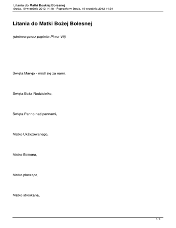 Litania do Matki Boskiej Bolesnej środa, 19 września 2012 14:18 - Poprawiony środa, 19 września 2012 14:34 Litania do Matki Bożej Bolesnej (ułożona przez papieża Piusa VII) Święta Maryjo - módl się za nami. Święta Boża Rodzicielko, Święta Panno nad pannami, Matko Ukżyżowanego, Matko Bolesna, Matko płacząca, Matko stroskana, 1/5 Litania do Matki Boskiej Bolesnej środa, 19 września 2012 14:18 - Poprawiony środa, 19 września 2012 14:34 Matko opuszczona przez ludzi, Matko żałosna, Matko Syna pozbawiona, Matko mieczem boleści przeszyta, Matko udręczeniem przygnieciona, Matko goryczą przesycona, Matko sercem do krzyża przybita, Matko najsmutniejsza, Źródło łez, 2/5 Litania do Matki Boskiej Bolesnej środa, 19 września 2012 14:18 - Poprawiony środa, 19 września 2012 14:34 Zbiorze wszystkich cierpień, Wzorze cierpliwości, Opoko stałości, Kotwico bezpieczeństwa, Schronienie opuszczonych, Tarczo uciśnionych, Pogromicielko niewiernych, Wspomożenie biednych, Uzdrowienie chorych, Umocnienie słabych, 3/5 Litania do Matki Boskiej Bolesnej środa, 19 września 2012 14:18 - Poprawiony środa, 19 września 2012 14:34 Porcie tonących, Uciszenie w nawałnicy, Ucieczko strapionych, Postrachu szatanów sidła stawiających, Skarbie wiernych, Źrenico proroków, Podporo apostołów, Korono męczenników, Światło wyznawców, 4/5 Litania do Matki Boskiej Bolesnej środa, 19 września 2012 14:18 - Poprawiony środa, 19 września 2012 14:34 Perło dziewic, Pociecho wdów i sierot, Radości wszystkich świętych, Wejrzyj na nas Najboleściwsza Panno, wyzwól nas i wybaw od wszelkich nieszczęść przez moc Jezusa Chrystusa. Amen. Módlmy się: Panie Jezu Chryste, prosimy Cię, niech teraz i w godzinę śmierci naszej przyczyni się za nami do miłosierdzia Twego Przenajświętsza Maryja Panna Matka Twoja, której przeczystą duszę przeszył miecz boleści w czasie męki Twojej. Przez Ciebie Jezu Chryste, Zbawicielu Świata, który żyjesz i królujesz z Ojcem i Duchem Świętym na wieki wieków. Amen. 5/5