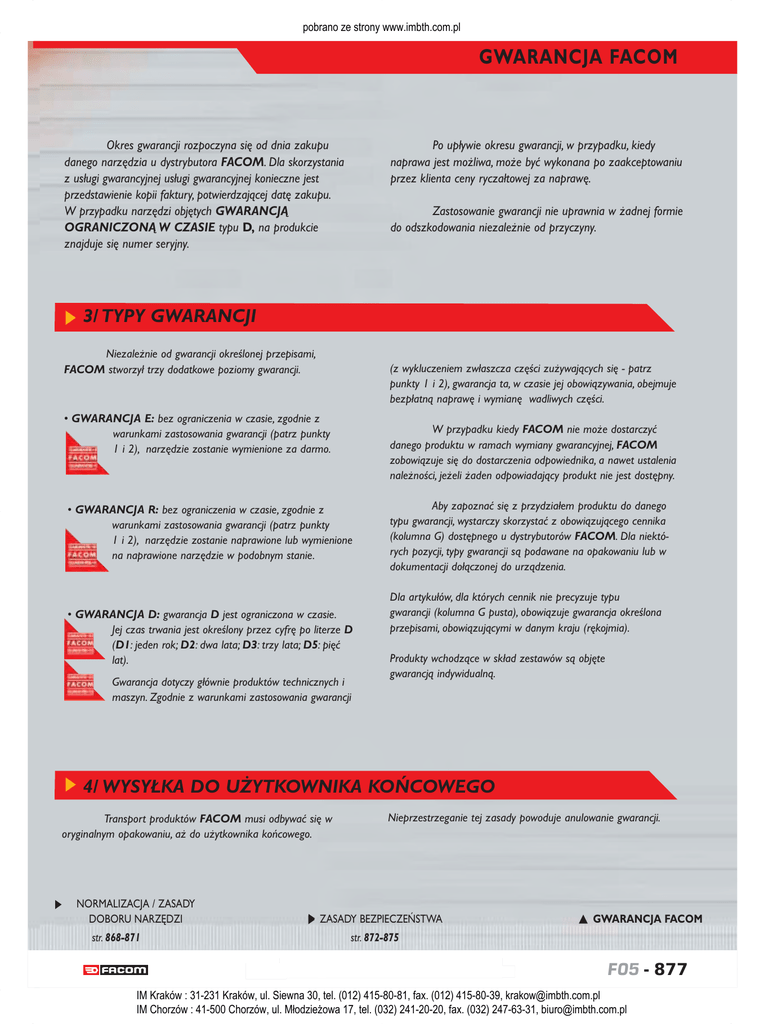 P876-877.qxd 28/02/05 13:07 Page 877 pobrano ze strony www.imbth.com.pl GWARANCJA FACOM Okres gwarancji rozpoczyna się od dnia zakupu danego narzędzia u dystrybutora FACOM. Dla skorzystania z usługi gwarancyjnej usługi gwarancyjnej konieczne jest przedstawienie kopii faktury, potwierdzającej datę zakupu. W przypadku narzędzi objętych GWARANCJĄ OGRANICZONĄ W CZASIE typu D, na produkcie znajduje się numer seryjny. Po upływie okresu gwarancji, w przypadku, kiedy naprawa jest możliwa, może być wykonana po zaakceptowaniu przez klienta ceny ryczałtowej za naprawę. Zastosowanie gwarancji nie uprawnia w żadnej formie do odszkodowania niezależnie od przyczyny. 3/ TYPY GWARANCJI Niezależnie od gwarancji określonej przepisami, FACOM stworzył trzy dodatkowe poziomy gwarancji. (z wykluczeniem zwłaszcza części zużywających się - patrz punkty 1 i 2), gwarancja ta, w czasie jej obowiązywania, obejmuje bezpłatną naprawę i wymianę wadliwych części. • GWARANCJA E: bez ograniczenia w czasie, zgodnie z warunkami zastosowania gwarancji (patrz punkty 1 i 2), narzędzie zostanie wymienione za darmo. W przypadku kiedy FACOM nie może dostarczyć danego produktu w ramach wymiany gwarancyjnej, FACOM zobowiązuje się do dostarczenia odpowiednika, a nawet ustalenia należności, jeżeli żaden odpowiadający produkt nie jest dostępny. • GWARANCJA R: bez ograniczenia w czasie, zgodnie z warunkami zastosowania gwarancji (patrz punkty 1 i 2), narzędzie zostanie naprawione lub wymienione na naprawione narzędzie w podobnym stanie. • GWARANCJA D: gwarancja D jest ograniczona w czasie. Jej czas trwania jest określony przez cyfrę po literze D (D1: jeden rok; D2: dwa lata; D3: trzy lata; D5: pięć lat). Gwarancja dotyczy głównie produktów technicznych i maszyn. Zgodnie z warunkami zastosowania gwarancji Aby zapoznać się z przydziałem produktu do danego typu gwarancji, wystarczy skorzystać z obowiązującego cennika (kolumna G) dostępnego u dystrybutorów FACOM. Dla niektórych pozycji, typy gwarancji są podawane na opakowaniu lub w dokumentacji dołączonej do urządzenia. Dla artykułów, dla których cennik nie precyzuje typu gwarancji (kolumna G pusta), obowiązuje gwarancja określona przepisami, obowiązującymi w danym kraju (rękojmia). Produkty wchodzące w skład zestawów są objęte gwarancją indywidualną. 4/ WYSYŁKA DO UŻYTKOWNIKA KOŃCOWEGO Transport produktów FACOM musi odbywać się w oryginalnym opakowaniu, aż do użytkownika końcowego. NORMALIZACJA / ZASADY DOBORU NARZĘDZI str. 868-871 Nieprzestrzeganie tej zasady powoduje anulowanie gwarancji. ZASADY BEZPIECZEŃSTWA ▲ GWARANCJA FACOM str. 872-875 Katalog elektroniczny na www.facom.com F05 - 877 IM Kraków : 31-231 Kraków, ul. Siewna 30, tel. (012) 415-80-81, fax. (012) 415-80-39, [email protected] IM Chorzów : 41-500 Chorzów, ul. Młodzieżowa 17, tel. (032) 241-20-20, fax. (032) 247-63-31, [email protected]