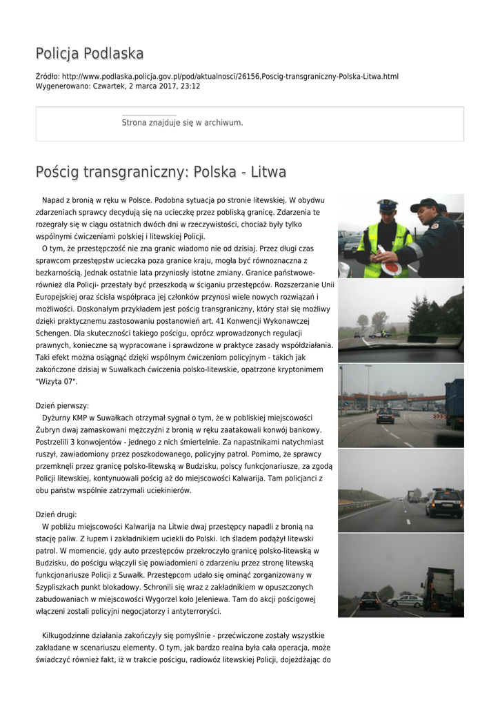 Policja Podlaska Źródło: http://www.podlaska.policja.gov.pl/pod/aktualnosci/26156,Poscig-transgraniczny-Polska-Litwa.html Wygenerowano: Czwartek, 2 marca 2017, 23:12 Strona znajduje się w archiwum. Pościg transgraniczny: Polska - Litwa Napad z bronią w ręku w Polsce. Podobna sytuacja po stronie litewskiej. W obydwu zdarzeniach sprawcy decydują się na ucieczkę przez pobliską granicę. Zdarzenia te rozegrały się w ciągu ostatnich dwóch dni w rzeczywistości, chociaż były tylko wspólnymi ćwiczeniami polskiej i litewskiej Policji. O tym, że przestępczość nie zna granic wiadomo nie od dzisiaj. Przez długi czas sprawcom przestępstw ucieczka poza granice kraju, mogła być równoznaczna z bezkarnością. Jednak ostatnie lata przyniosły istotne zmiany. Granice państwowerównież dla Policji- przestały być przeszkodą w ściganiu przestępców. Rozszerzanie Unii Europejskiej oraz ścisła współpraca jej członków przynosi wiele nowych rozwiązań i możliwości. Doskonałym przykładem jest pościg transgraniczny, który stał się możliwy dzięki praktycznemu zastosowaniu postanowień art. 41 Konwencji Wykonawczej Schengen. Dla skuteczności takiego pościgu, oprócz wprowadzonych regulacji prawnych, konieczne są wypracowane i sprawdzone w praktyce zasady współdziałania. Taki efekt można osiągnąć dzięki wspólnym ćwiczeniom policyjnym - takich jak zakończone dzisiaj w Suwałkach ćwiczenia polsko-litewskie, opatrzone kryptonimem "Wizyta 07". Dzień pierwszy: Dyżurny KMP w Suwałkach otrzymał sygnał o tym, że w pobliskiej miejscowości Żubryn dwaj zamaskowani mężczyźni z bronią w ręku zaatakowali konwój bankowy. Postrzelili 3 konwojentów - jednego z nich śmiertelnie. Za napastnikami natychmiast ruszył, zawiadomiony przez poszkodowanego, policyjny patrol. Pomimo, że sprawcy przemknęli przez granicę polsko-litewską w Budzisku, polscy funkcjonariusze, za zgodą Policji litewskiej, kontynuowali pościg aż do miejscowości Kalwarija. Tam policjanci z obu państw wspólnie zatrzymali uciekinierów. Dzień drugi: W pobliżu miejscowości Kalwarija na Litwie dwaj przestępcy napadli z bronią na stację paliw. Z łupem i zakładnikiem uciekli do Polski. Ich śladem podążył litewski patrol. W momencie, gdy auto przestępców przekroczyło granicę polsko-litewską w Budzisku, do pościgu włączyli się powiadomieni o zdarzeniu przez stronę litewską funkcjonariusze Policji z Suwałk. Przestępcom udało się ominąć zorganizowany w Szypliszkach punkt blokadowy. Schronili się wraz z zakładnikiem w opuszczonych zabudowaniach w miejscowości Wygorzel koło Jeleniewa. Tam do akcji pościgowej włączeni zostali policyjni negocjatorzy i antyterroryści. Kilkugodzinne działania zakończyły się pomyślnie - przećwiczone zostały wszystkie zakładane w scenariuszu elementy. O tym, jak bardzo realna była cała operacja, może świadczyć również fakt, iż w trakcie pościgu, radiowóz litewskiej Policji, dojeżdżając do przejścia granicznego, uległ - na szczęście niegroźnej - kolizji. W ramach ćwiczeń obserwatorzy skrzętnie sprawdzali, jak w praktyce przebiegną wszystkie elementy pościgu. Starali się też odnaleźć "pięty achillesowe" prowadzonej akcji. Zgłoszony dyżurnemu napad z bronią w ręku po stronie polskiej i podobne zdarzenie po stronie litewskiej powodował sekwencję kolejnych działań. Dodatkowym utrudnieniem było to, że w obydwu zdarzeniach sprawcy zdecydowali się na ucieczkę przez pobliską granicę. W momencie, gdy pierwsze sygnały o tych zdarzeniach docierały do oficerów dyżurnych rozpoczęła się gorączkowa, ale nie chaotyczna walka z czasem, którego upływ działa na korzyść uciekających przestępców. Informacja o zdarzeniach stała się impulsem do podjęcia przez dyżurnego szeregu istotnych i często trudnych działań. Trzeba było przekazać informację podległym patrolom, zlokalizować uciekinierów, zorganizować pościg i blokady. Przewidzieć i przygotować bezpieczny dla policjantów i osób postronnych sposób zatrzymania przestępców. Trzeba było też przewidywać dalszy rozwój wypadków oraz ewentualne zagrożenia i niebezpieczeństwa, a wszystko to w maksymalnie krótkim czasie. Gdy doszła do tego ucieczka sprawców poza granicę państwa, zaistniała jeszcze konieczność włączenia do operacji Policji innego państwa. W rezultacie skuteczność "pościgu transgranicznego" uzależniona była od wypracowanej w praktyce sprawności dowodzenia, szybkości przepływu informacji, trafności podejmowanych decyzji i umiejętność zsynchronizowania działań wielu służb i setek ludzi. Wszystkich tych elementów, koniecznych do skutecznego ścigania przestępców, mimo przekroczenia przez nich granicy, nie da się wykształcić "zza biurka". W takich właśnie momentach uwidaczniała się potrzeba ćwiczeń, w których częściej braliby udział policjanci obu zainteresowanych państw - Litwy i Polski. Ocena: 0/5 (0) Tweetnij